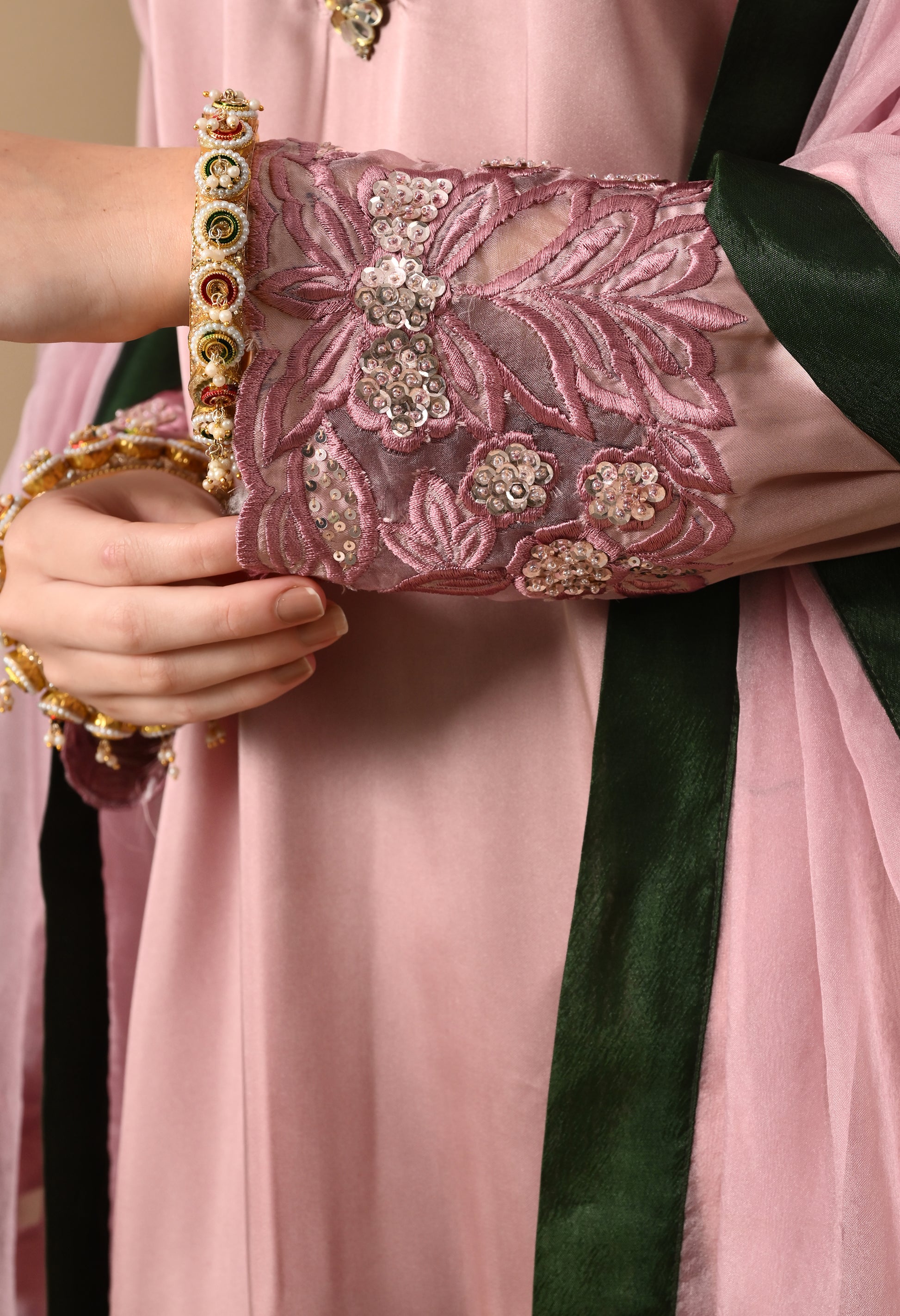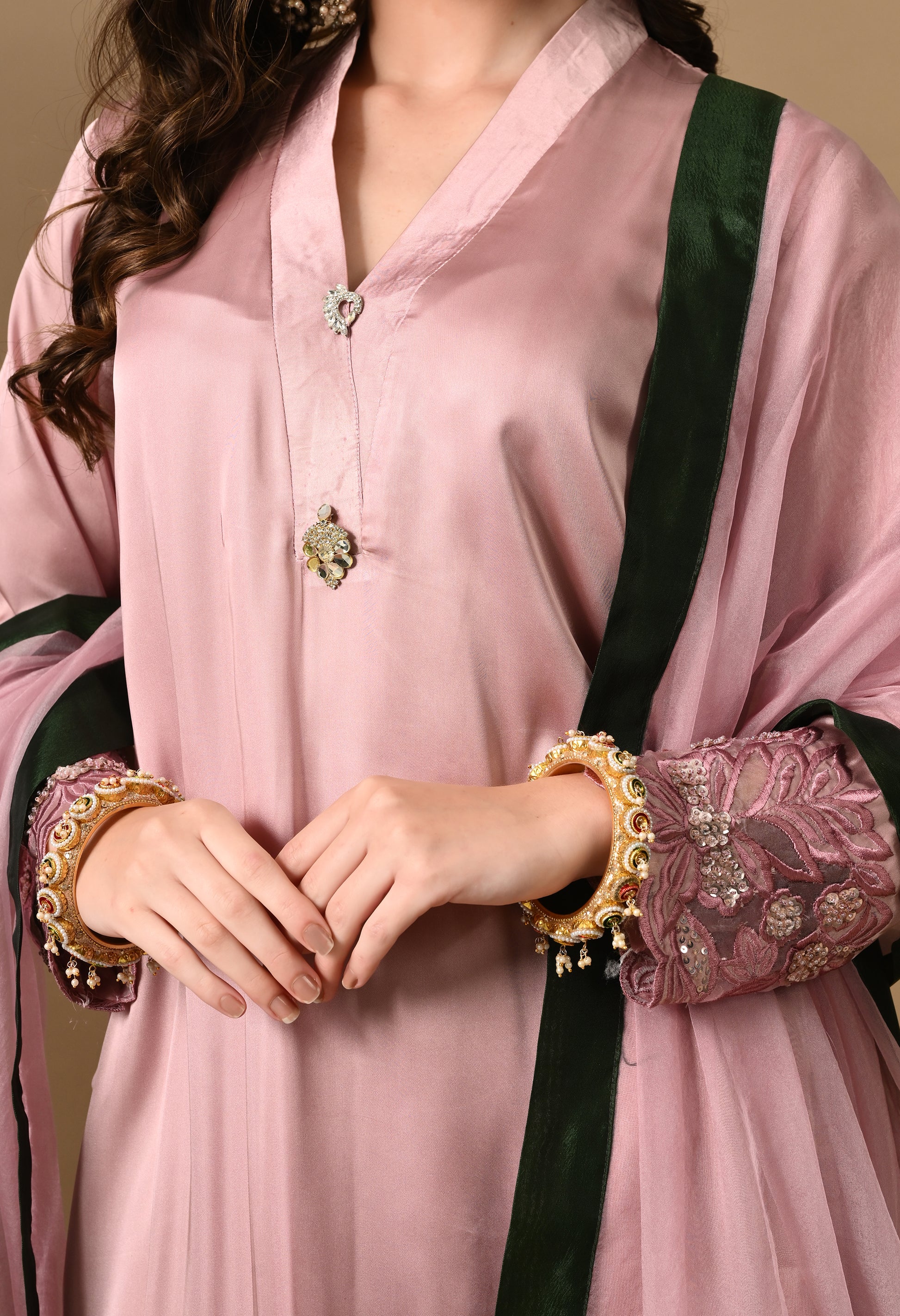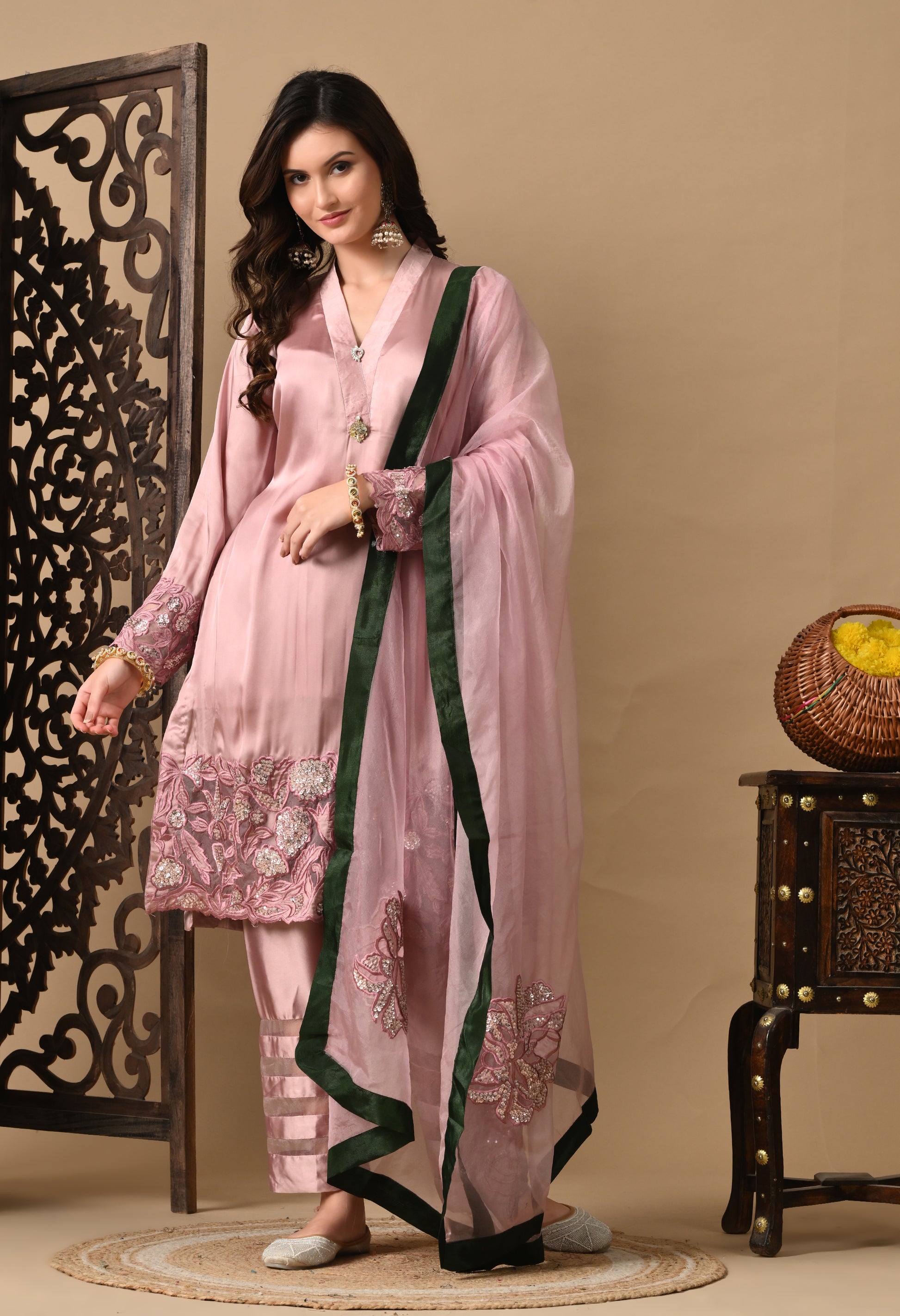 A pink silk kurta set featuring intricate thread, sequin and pearl embroidery. With organza dupatta, it’s made for celebration-ready elegance.