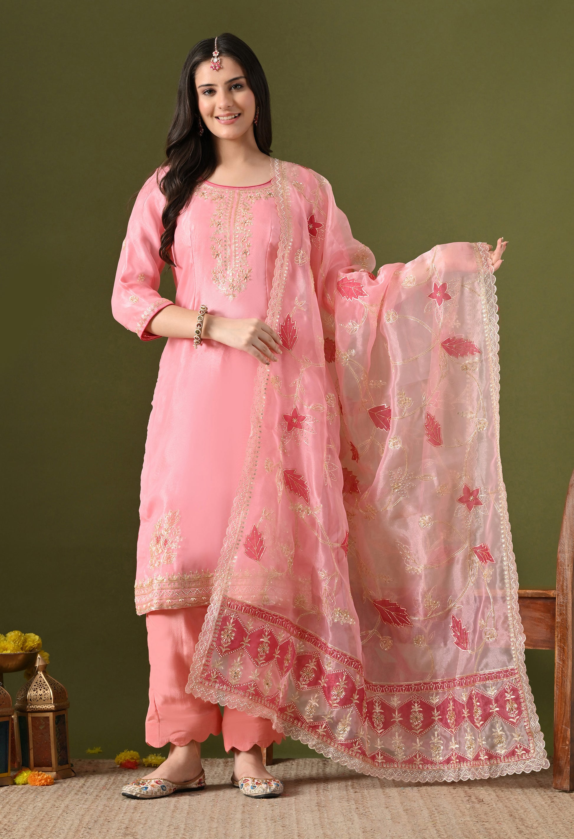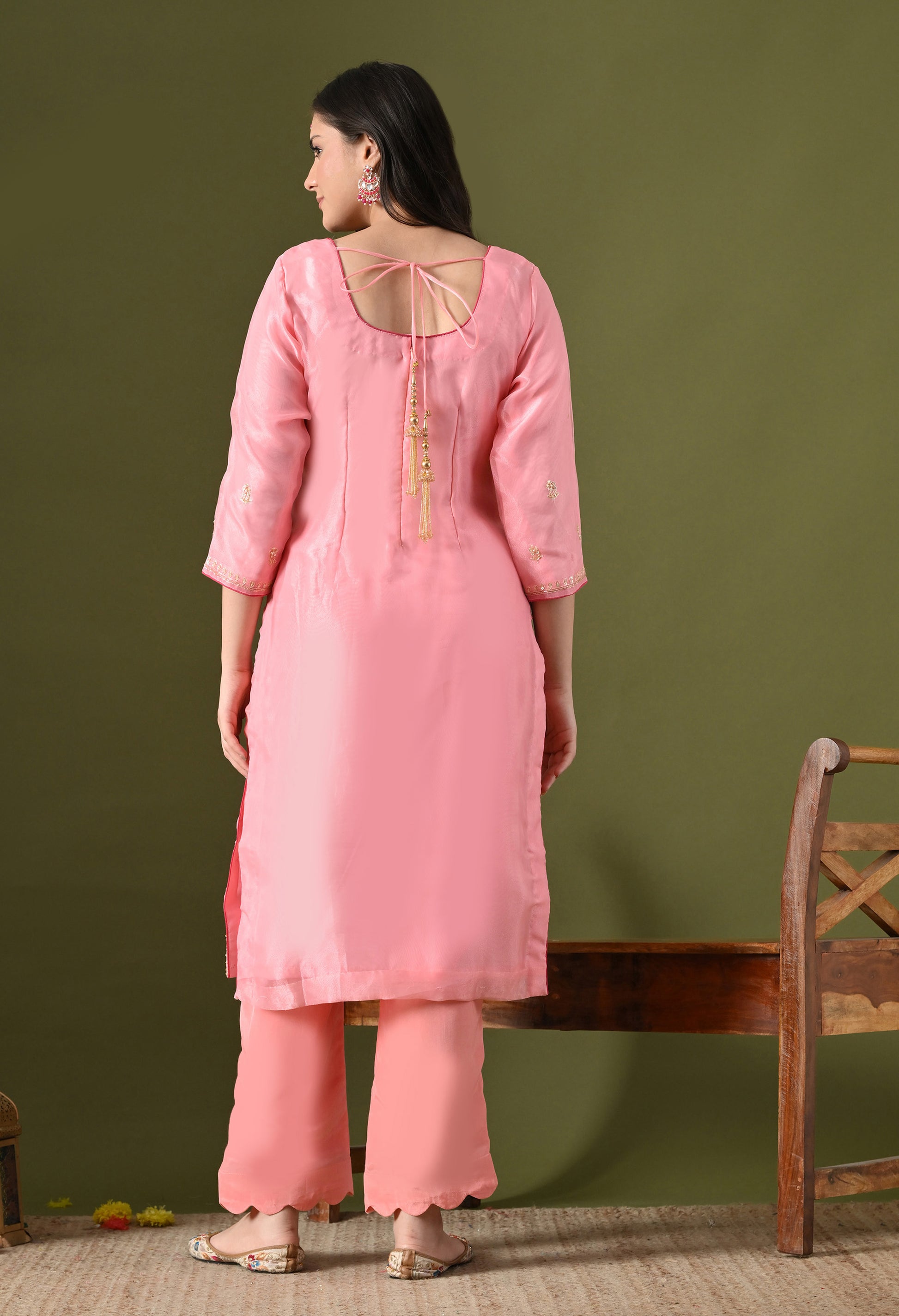- Description: This pink kurta set is a beautiful expression of festive sophistication and refined hand-crafted detailing. The tissue organza kurta and dupatta lend a soft, airy elegance, paired with comfortable crepe straight pants. Adorned with intricate zardozi, delicate pearl work, and shimmering sequence elements, the ensemble features exquisite hand-embroidery. The graceful pink tone makes it perfect for mehndi functions, celebrations, and festive gatherings.