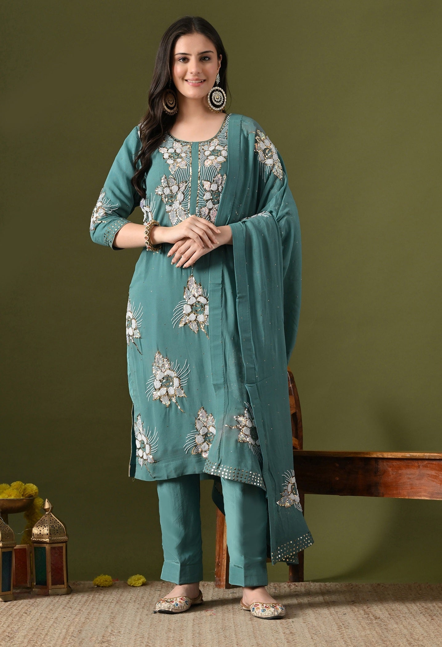 Pista green kurta set featuring a georgette kurta, crepe straight pants, and a matching dupatta, delicately detailed with mukaish work for a soft festive sparkle.