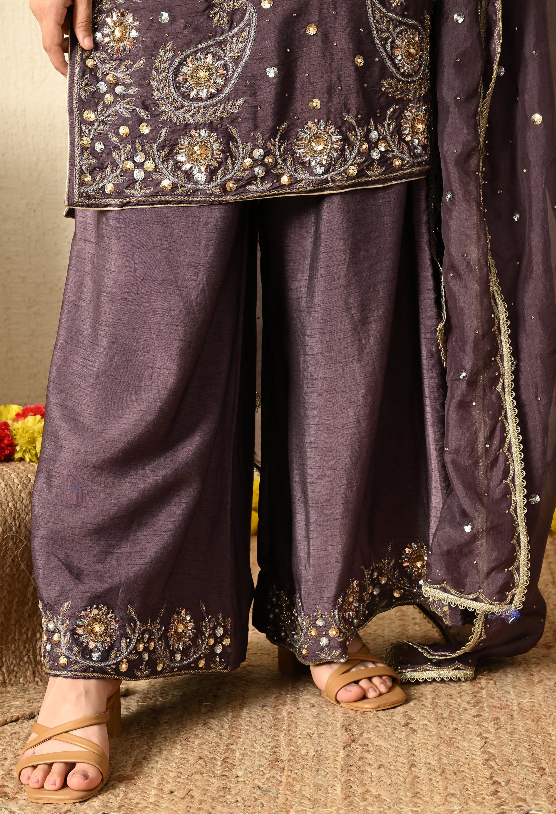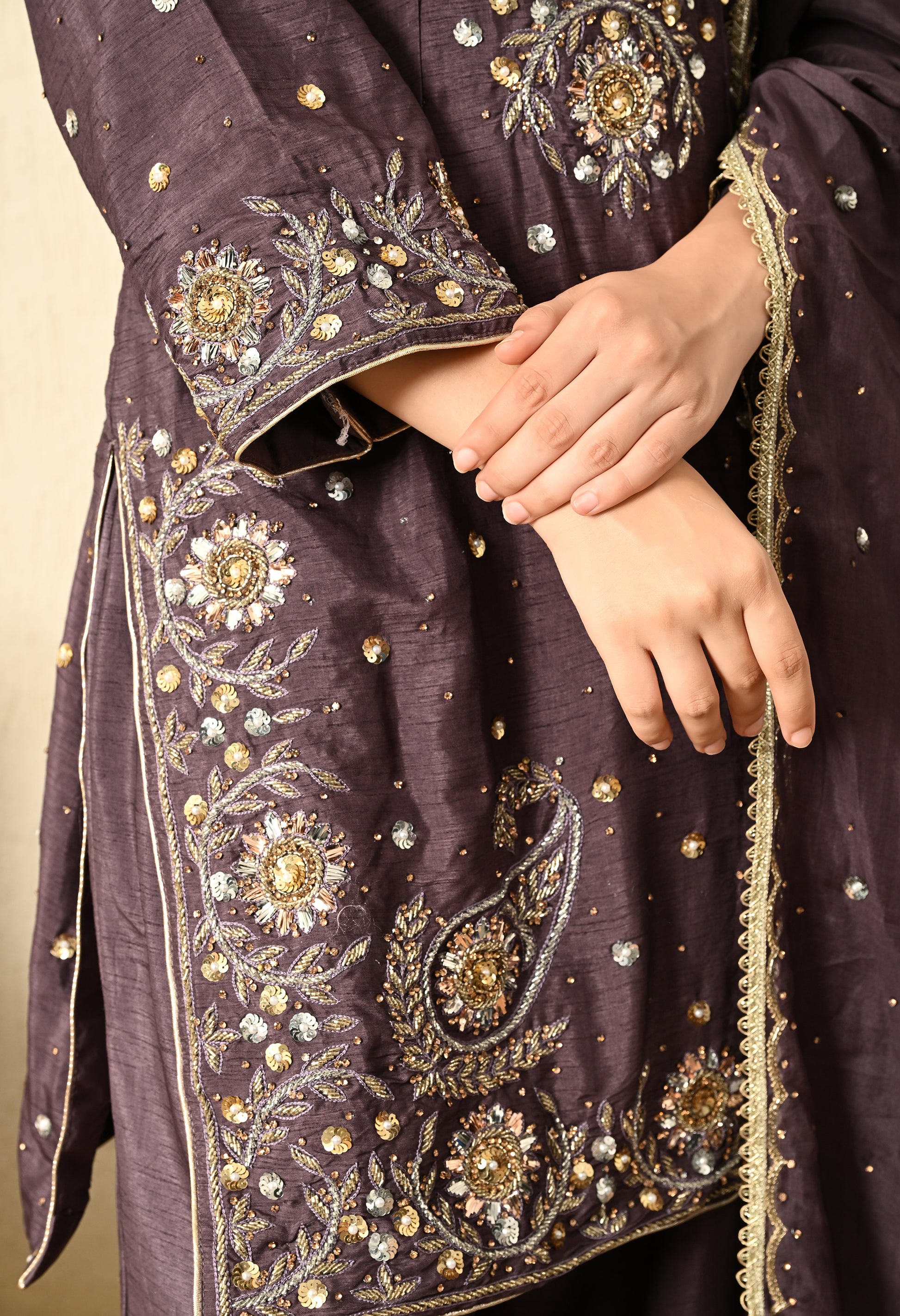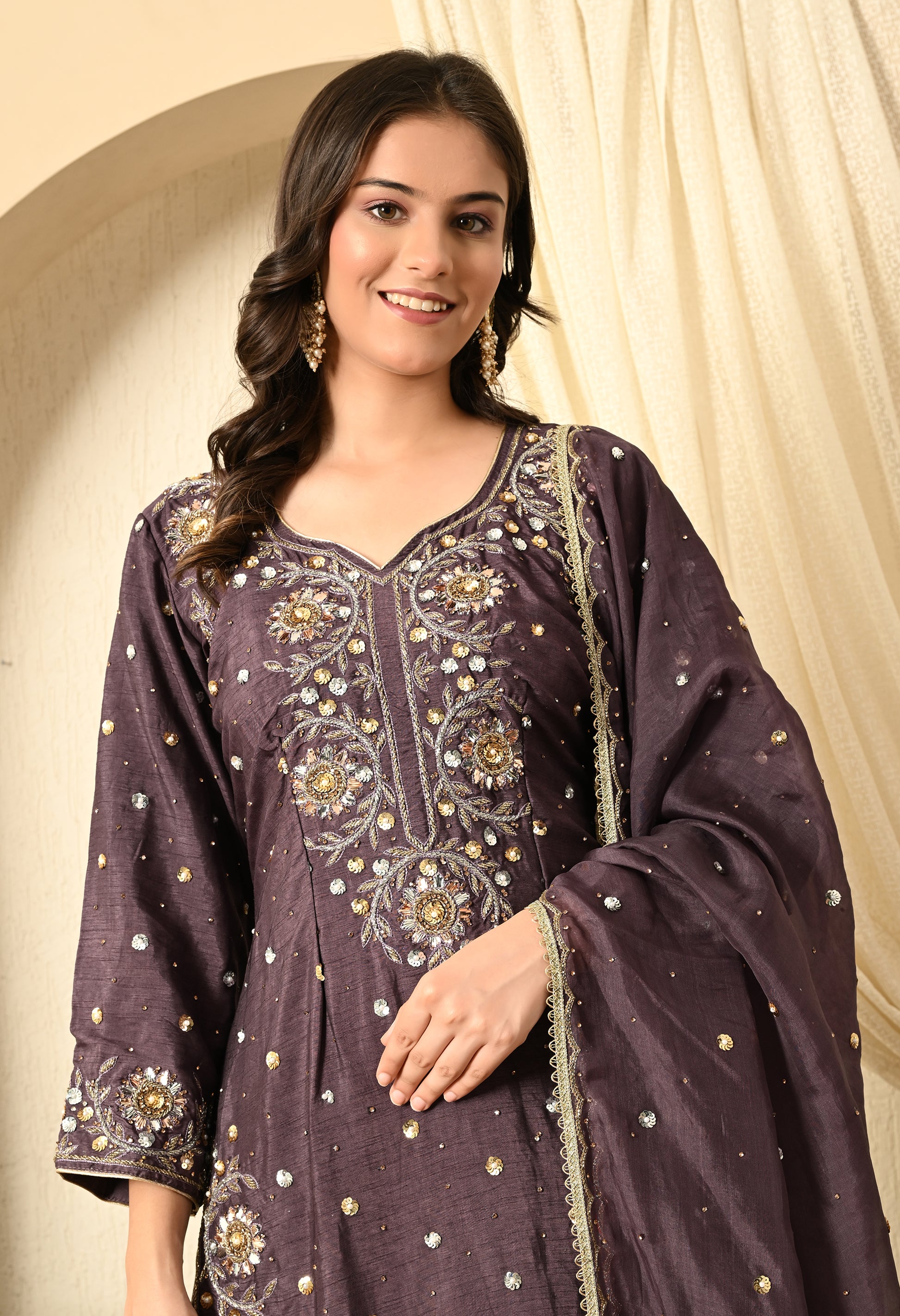 Purplish Grey Kurta Set with Mukaish, Zardozi and Sequence Work