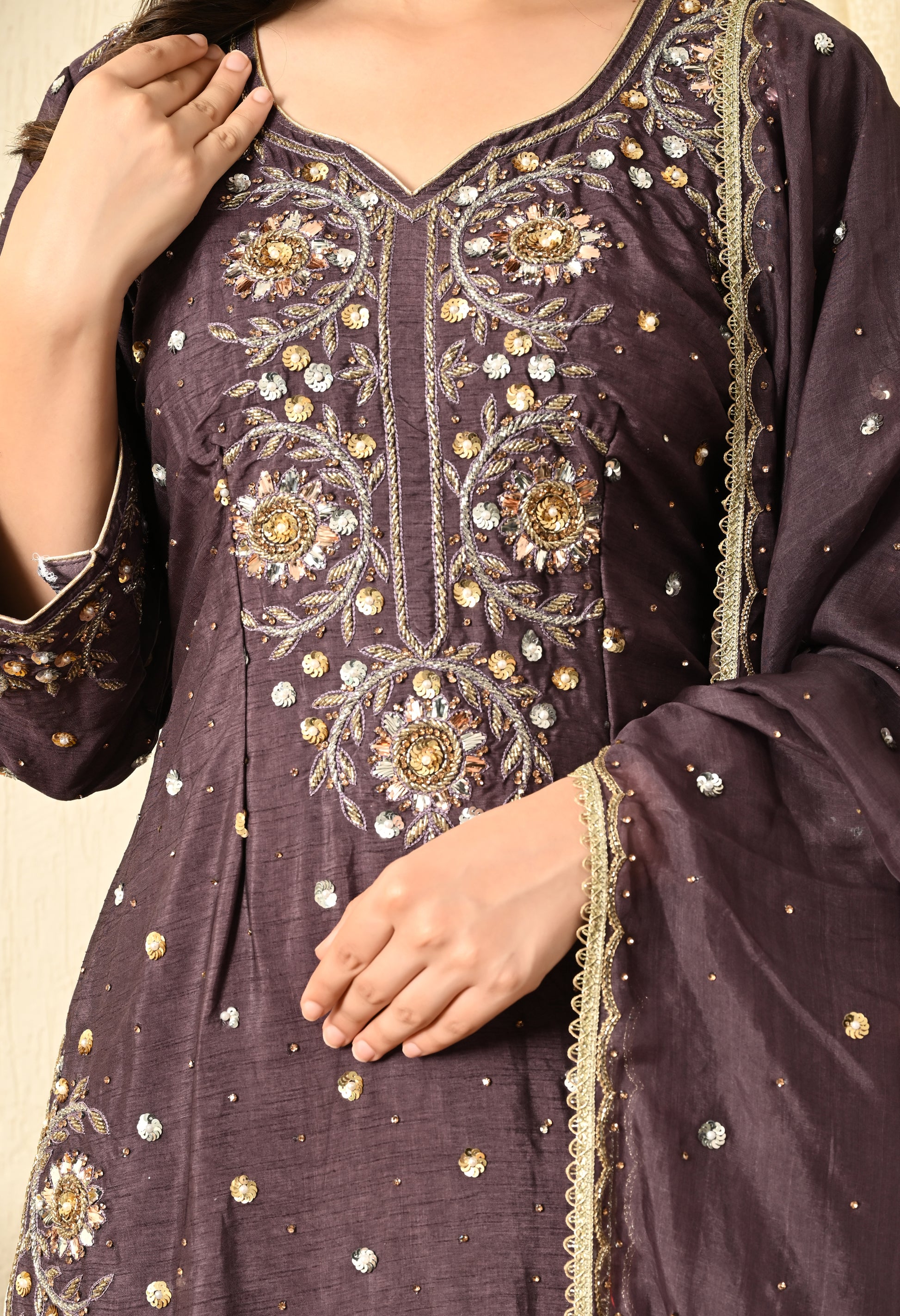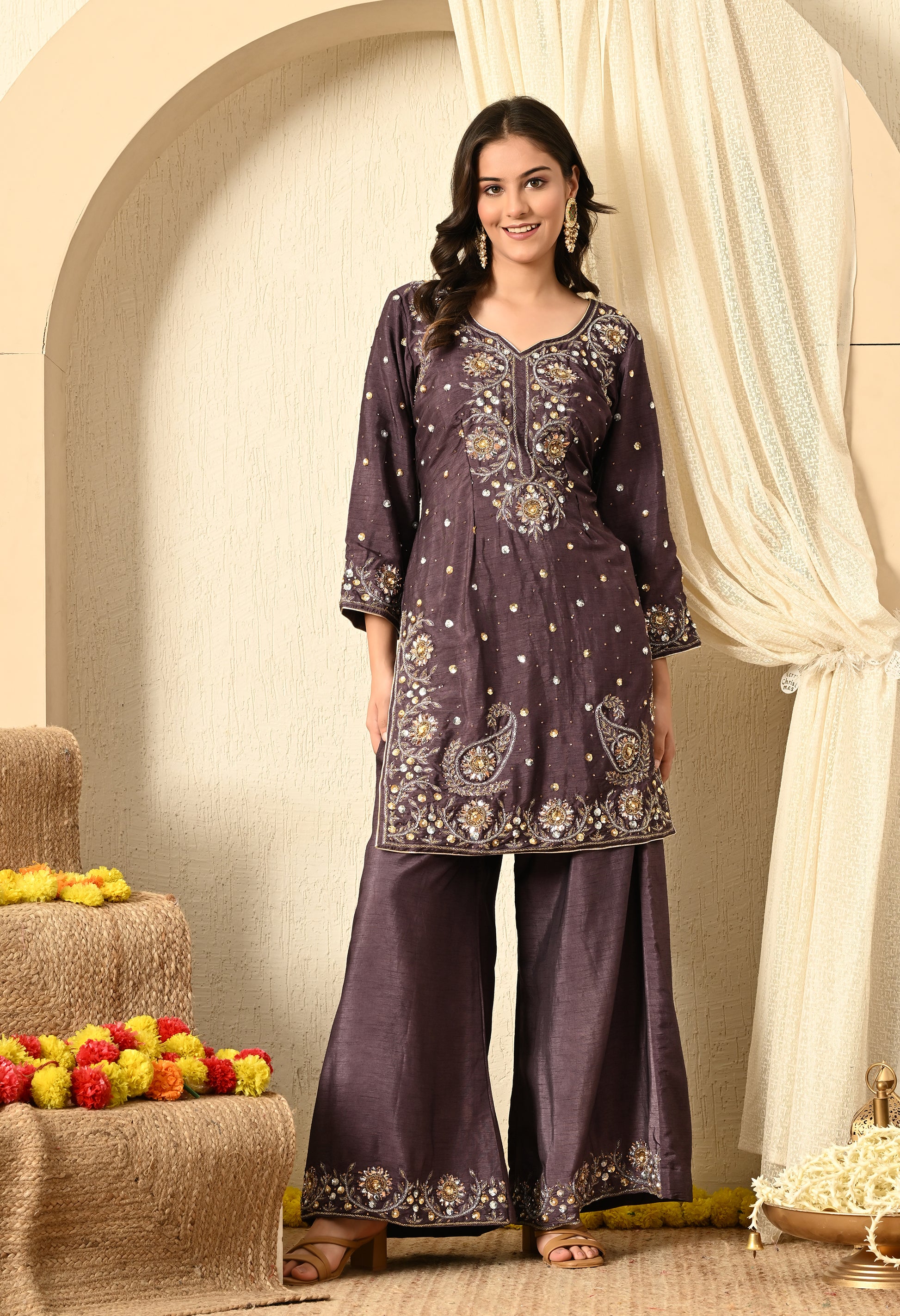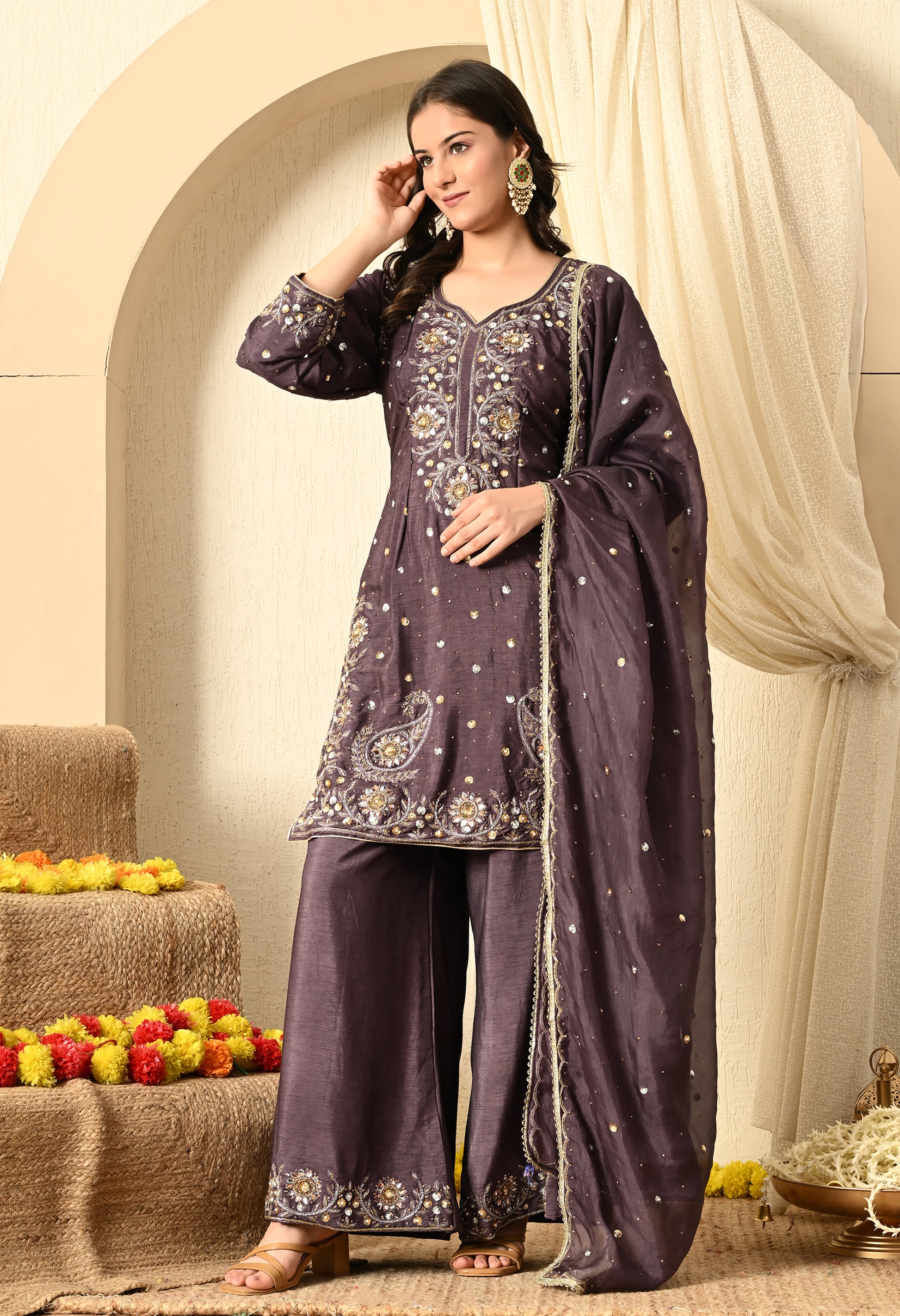 Purplish Grey Kurta Set with Mukaish, Zardozi and Sequence Work