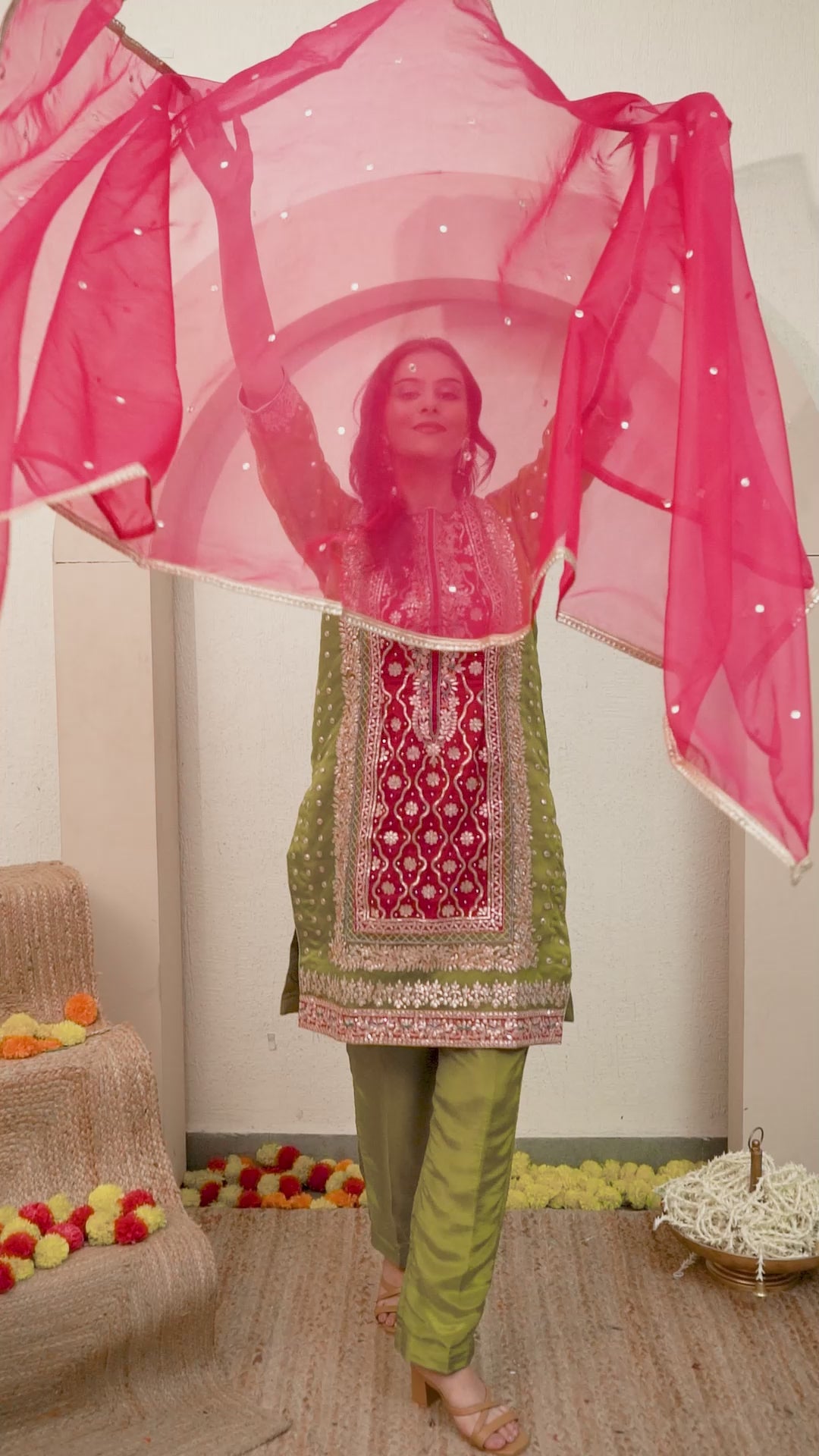 Designed to enhance your elegance, our rani and green color hue kurta set comes with an organza kurta, a crepe straight pant, and a delicate organza dupatta. Detailed with Gota Patti, Zardozi, and Sequin craftsmanship, the set has a beautiful contrast patch work on kurta, making it a true statement of luxury.