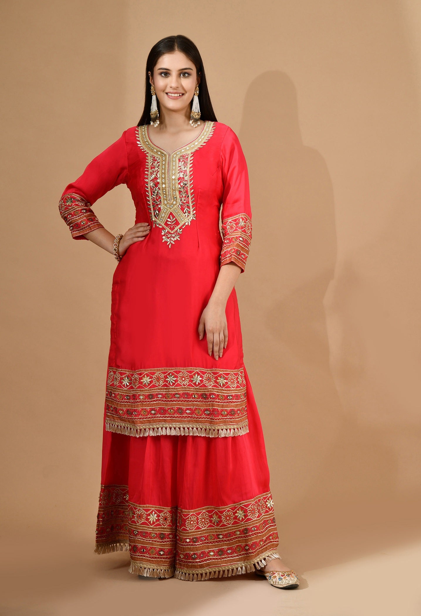 Shine bright in this reddish pink crepe garara set with traditional gotta and mirror embroidery. Perfect for festive and wedding occasions. Tailored fit. Customisable. Dry-clean only.