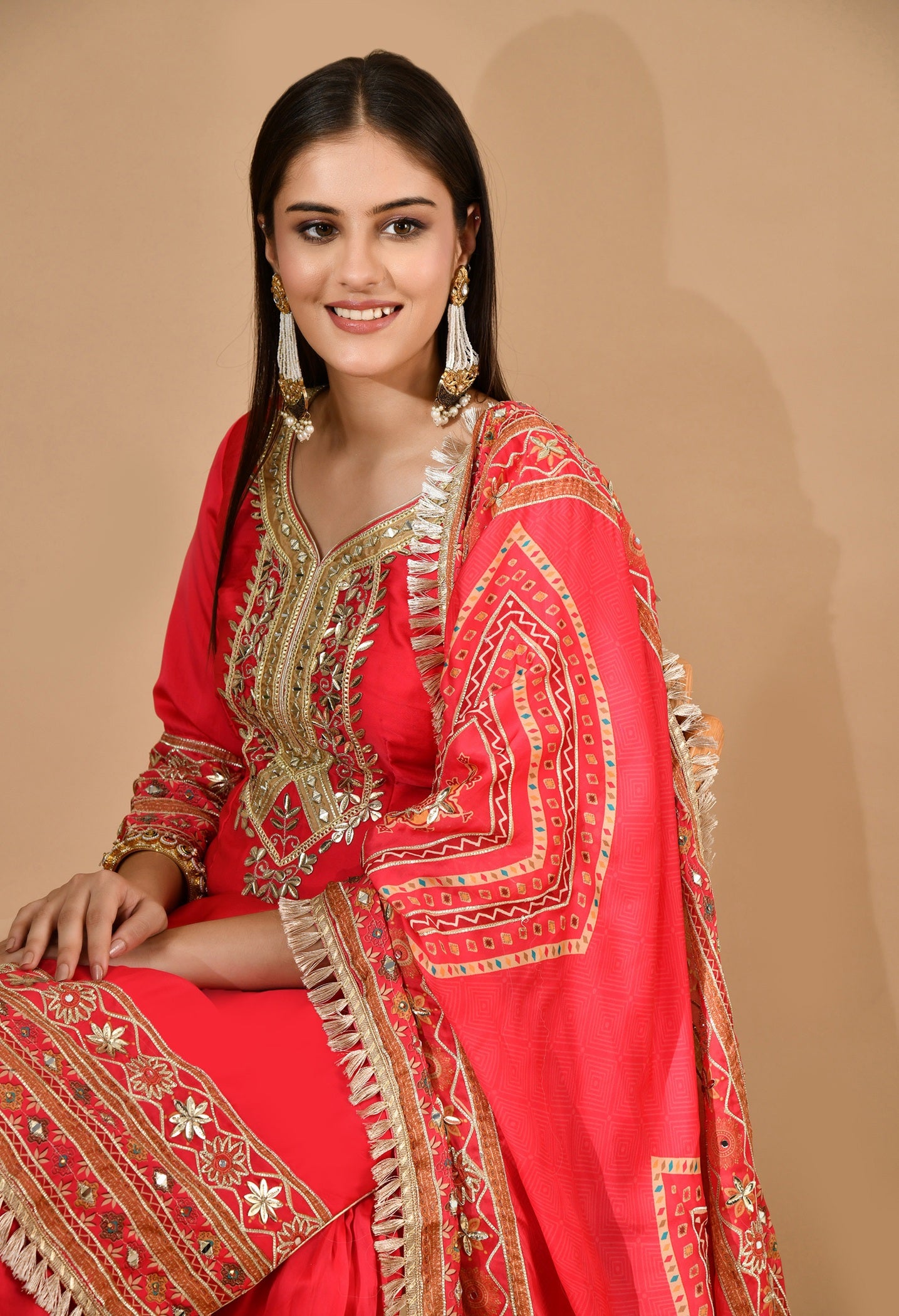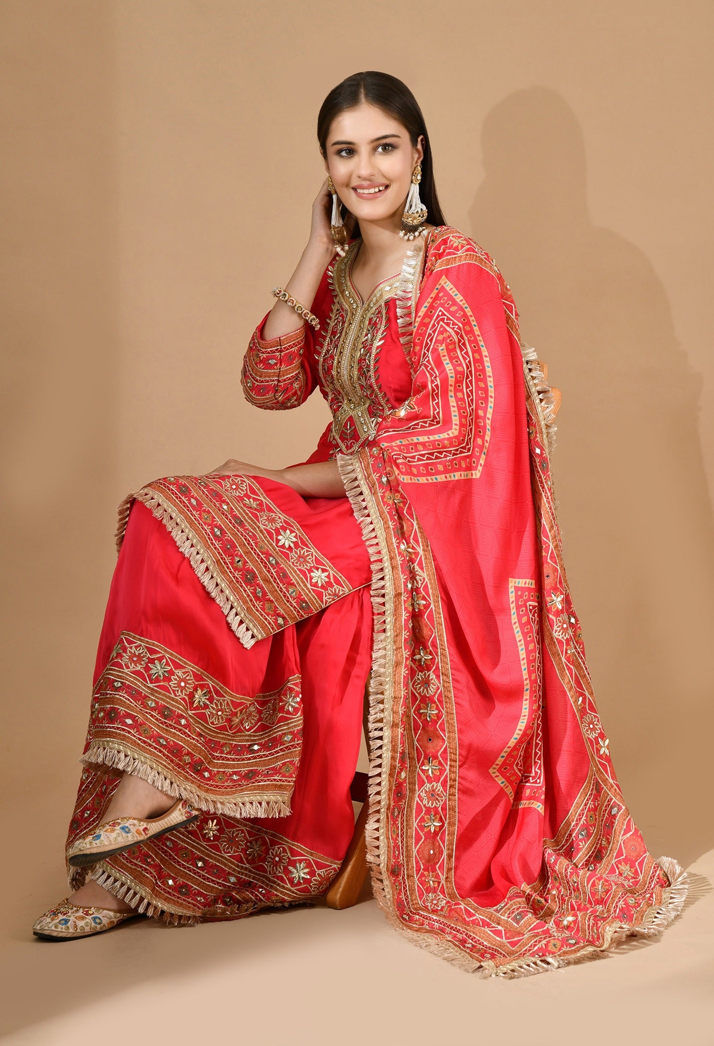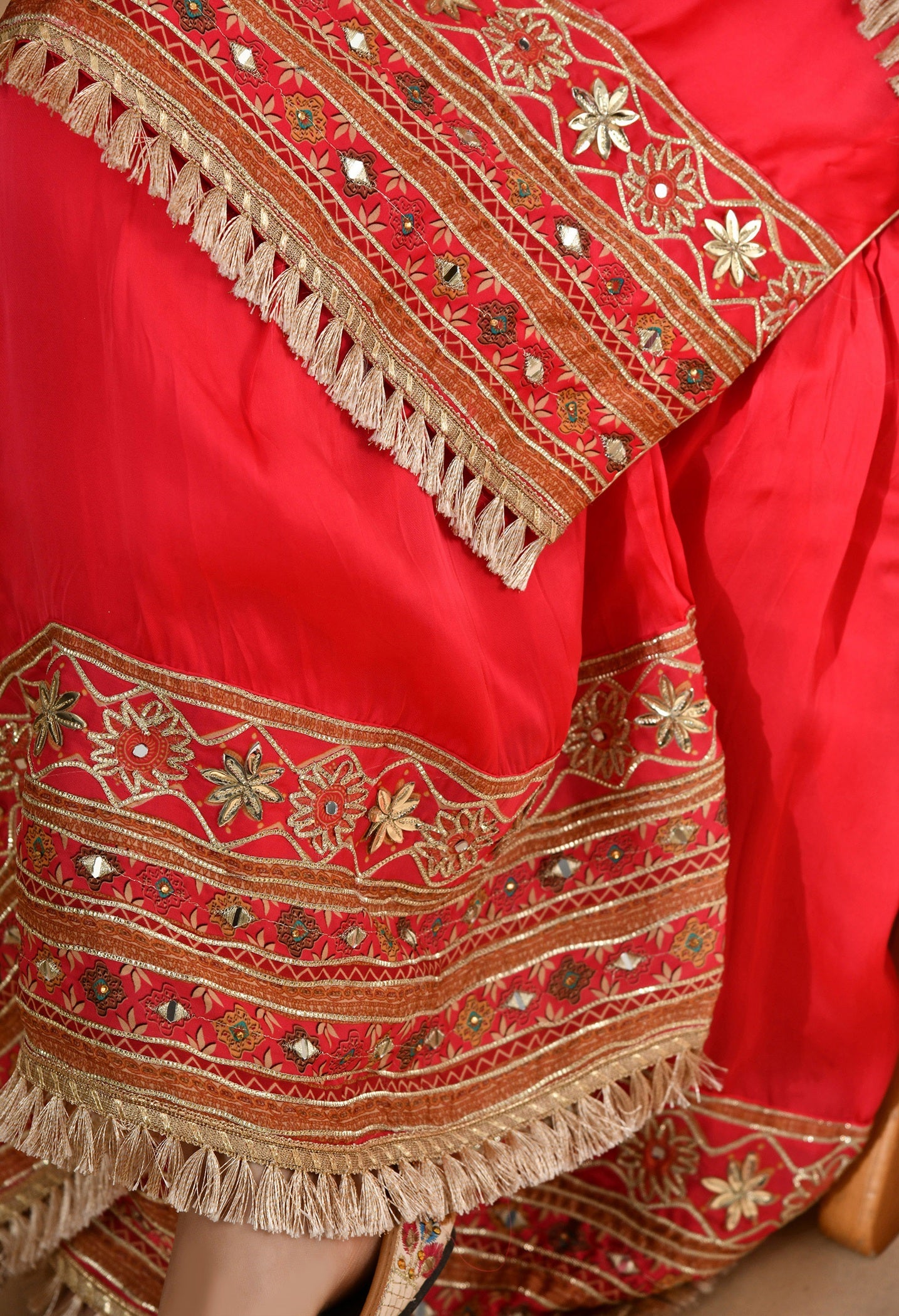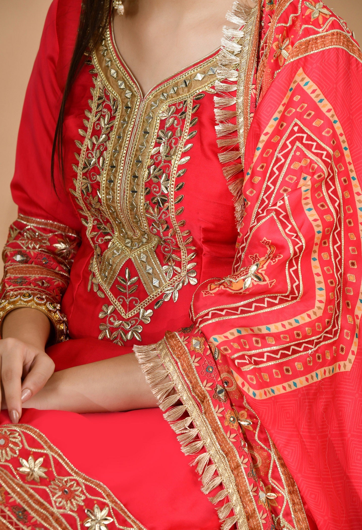 - Embellished with traditional gotta and mirror work, the ensemble is lightweight, festive, and perfect for weddings and grand festive gatherings.