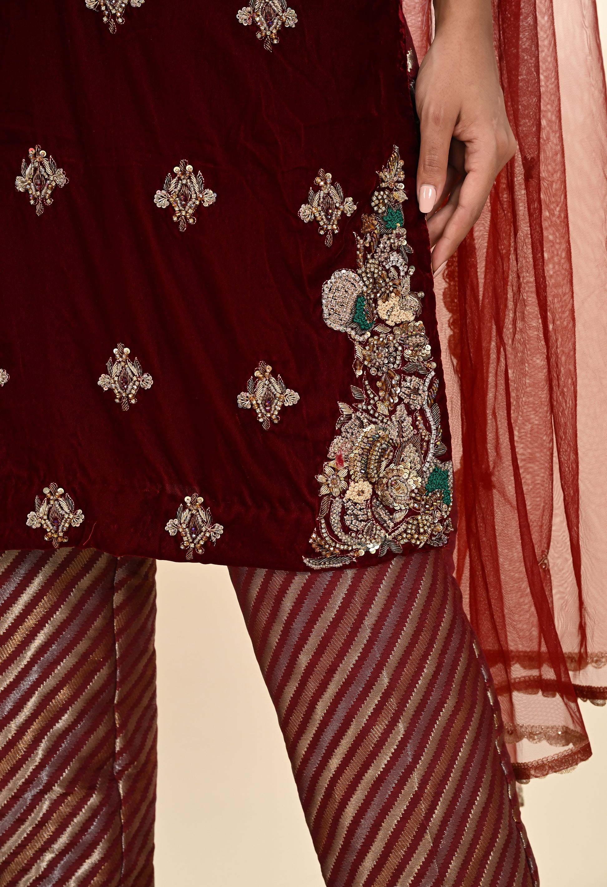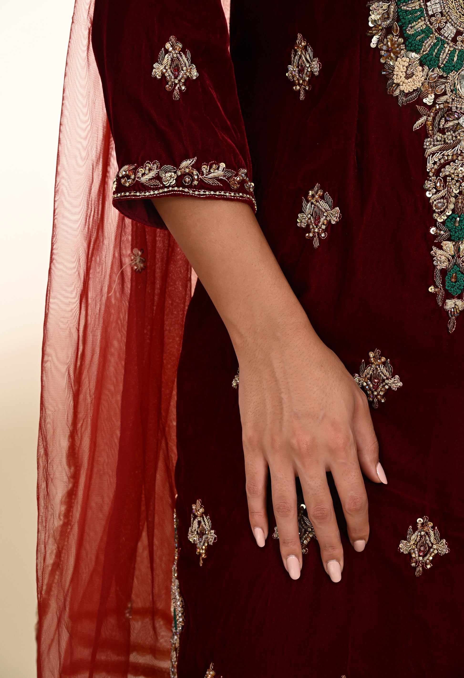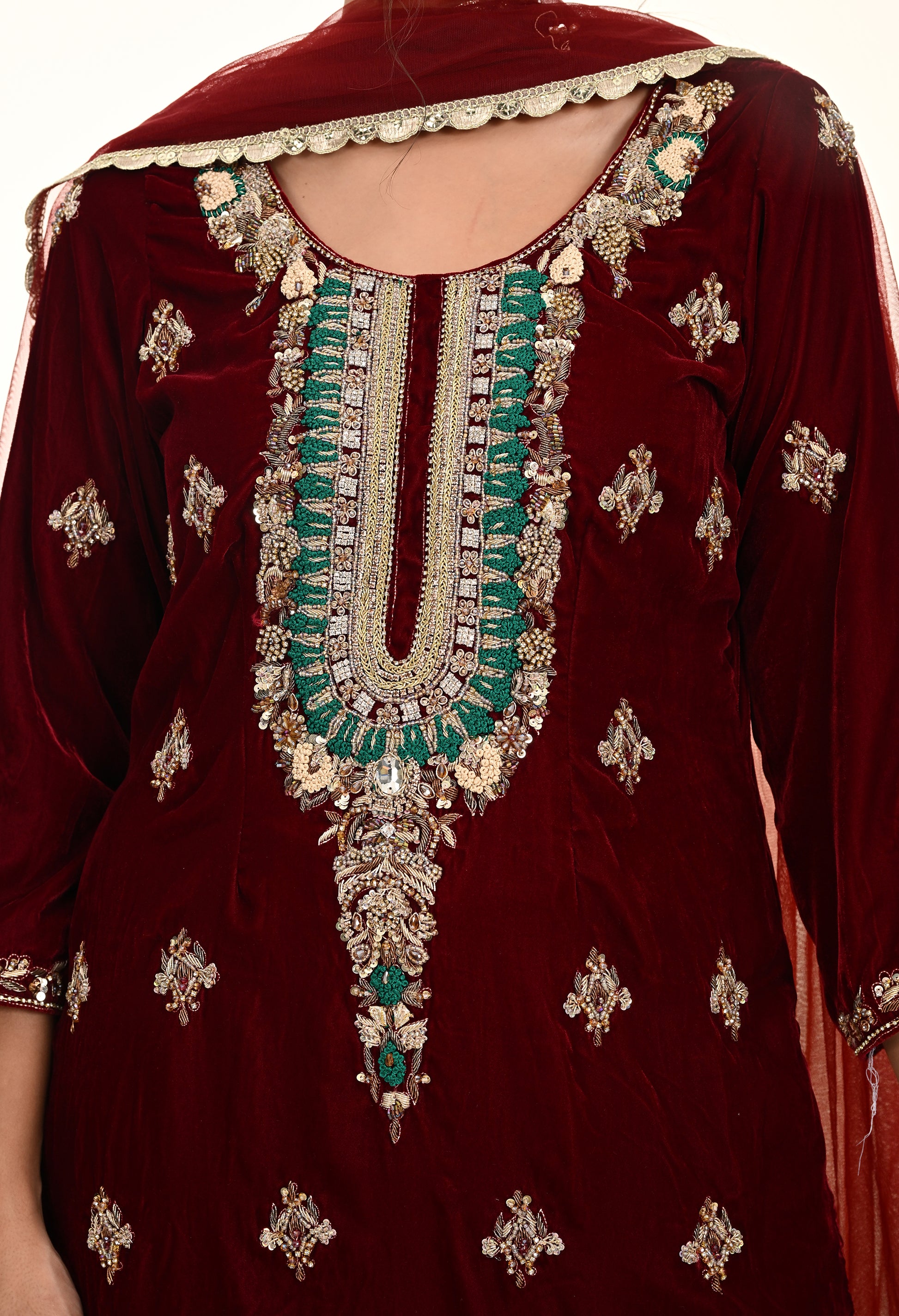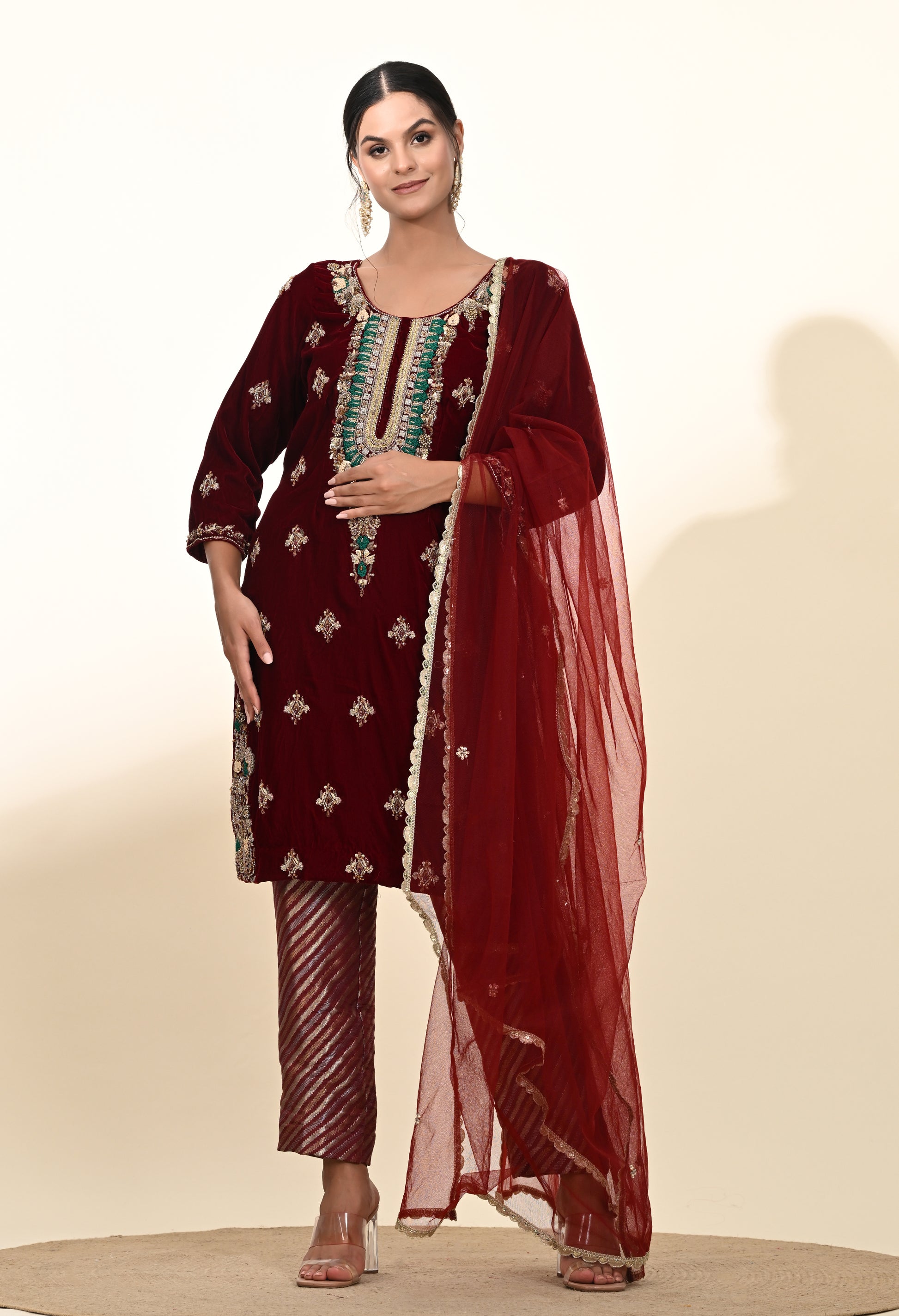 Embrace your innate grace with our meticulously crafted Kurta Set. Curated from premium velvet fabric, the kurta features intricate embroidery and work in a vibrant maroon red color. Paired with a delicately embellished net dupatta and brocade bottom, this ensemble is designed to accentuate your effortless charm. An impeccable choice to elevate your wardrobe and express your unique style.