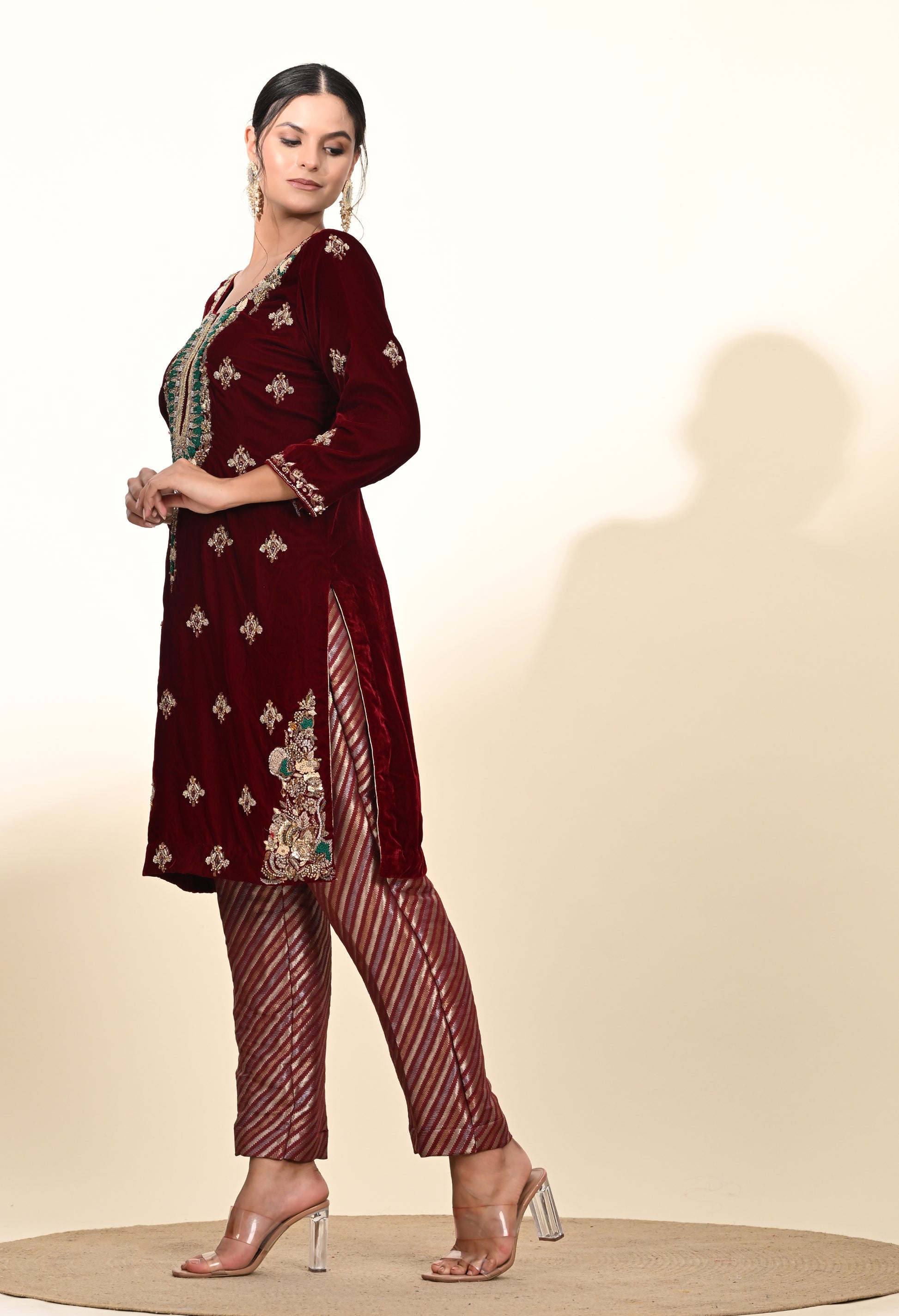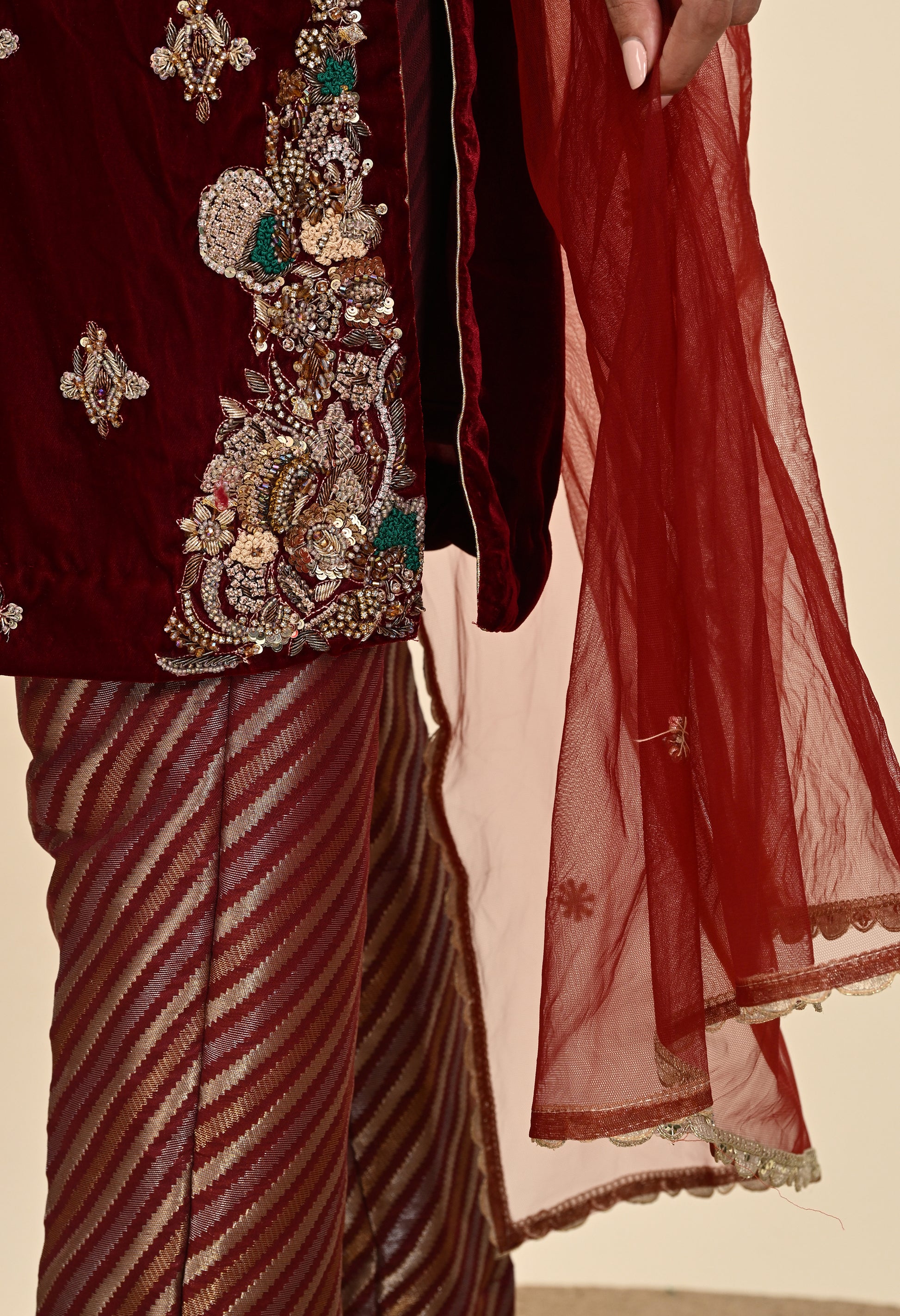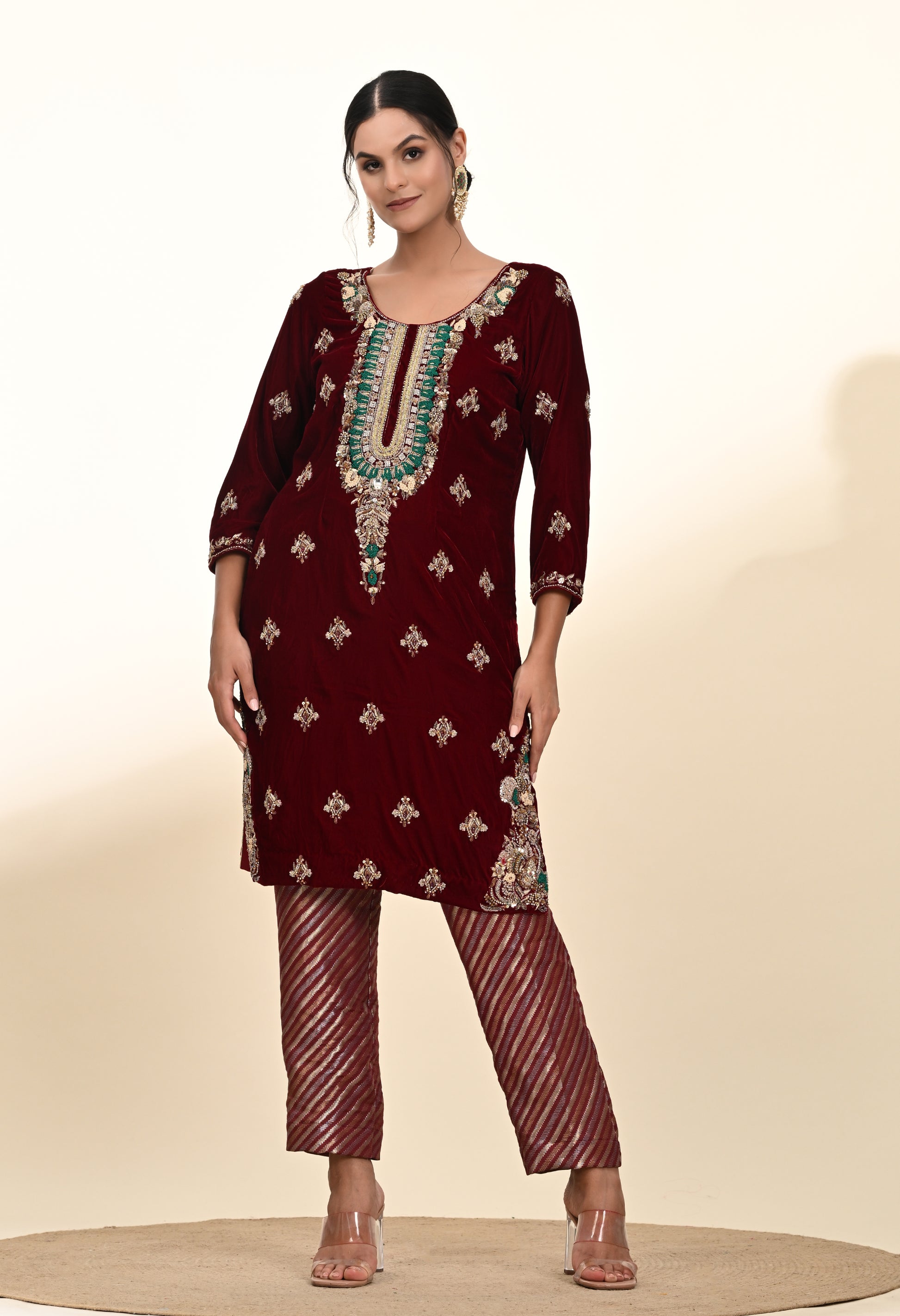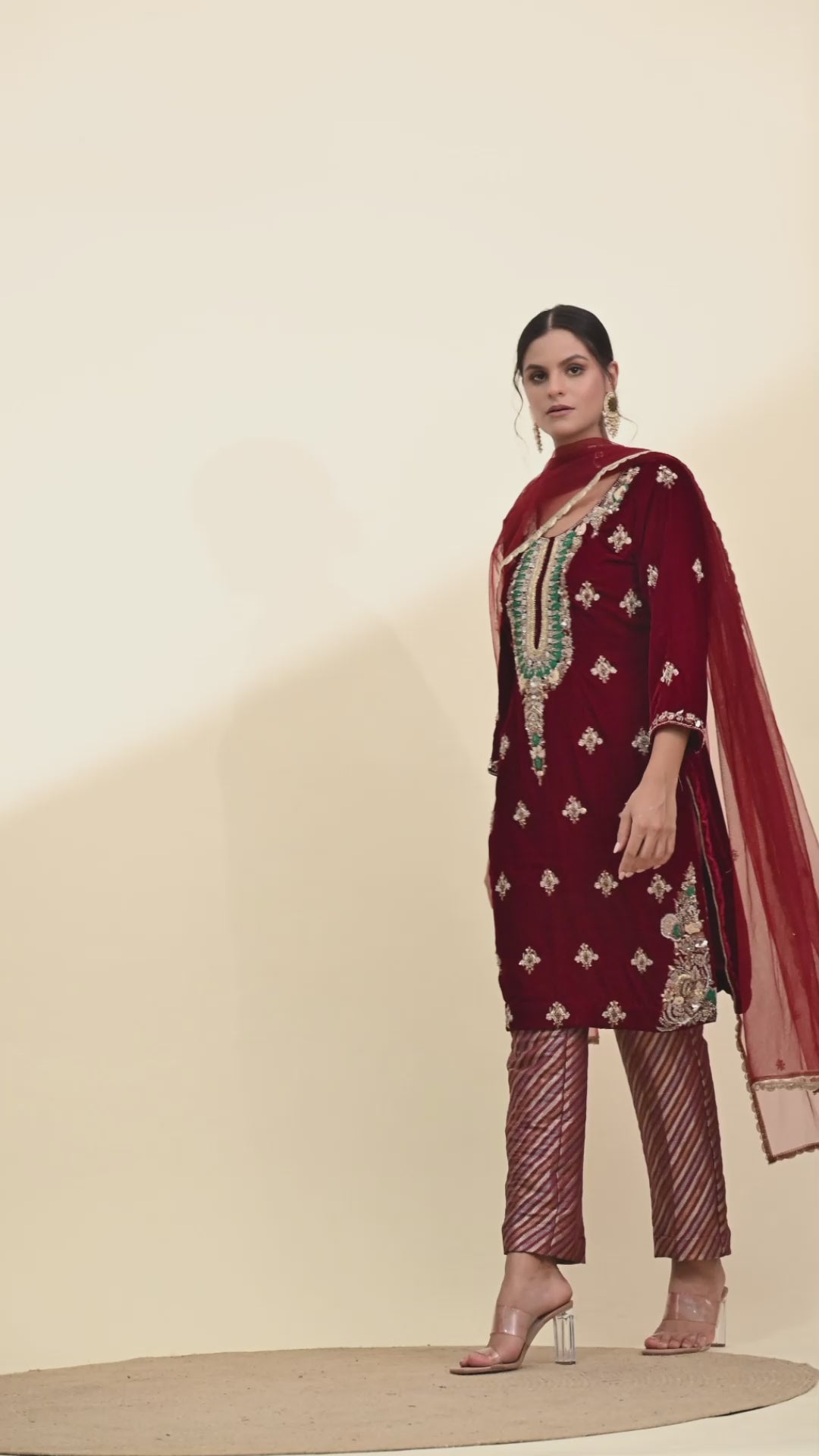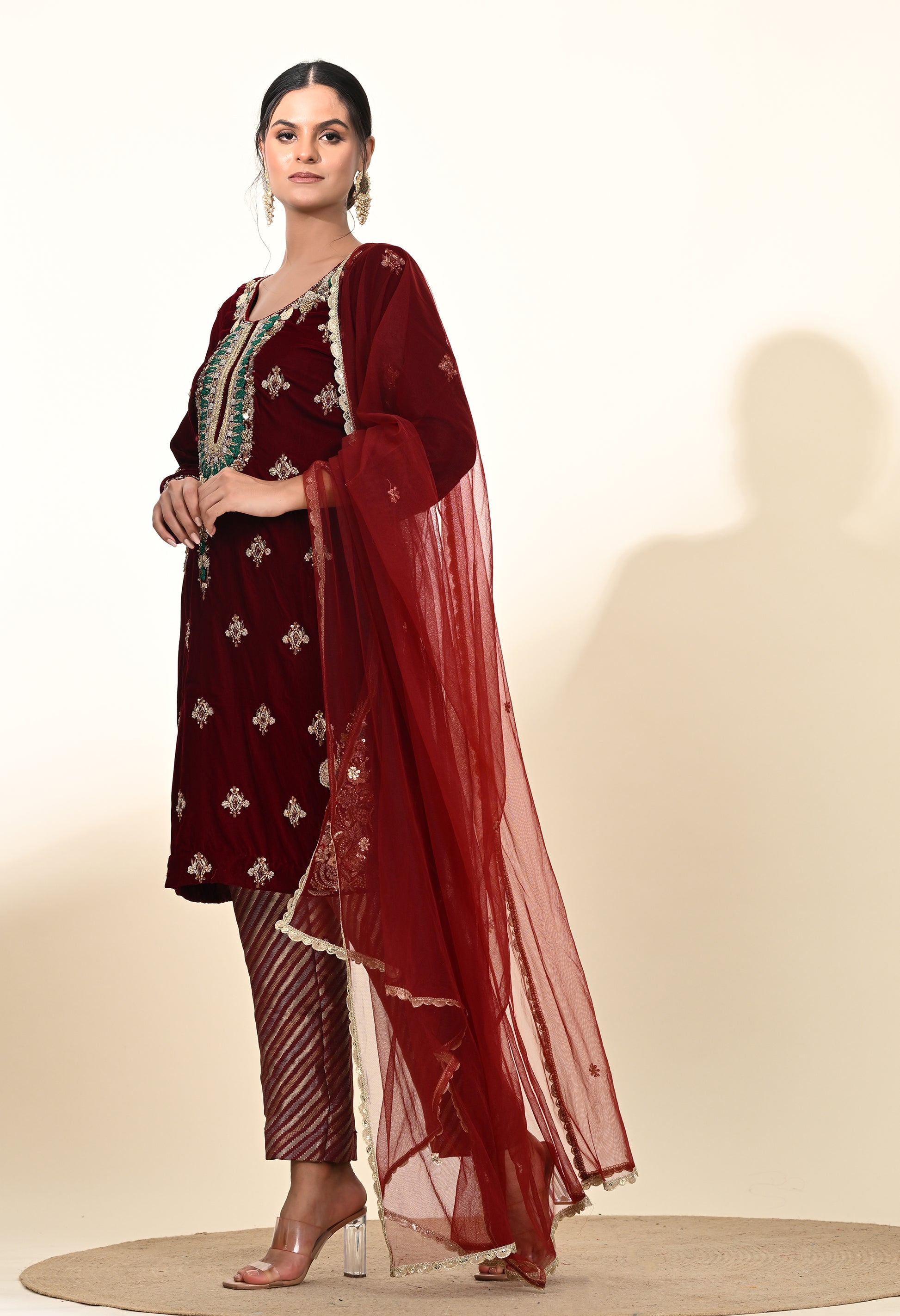 Embrace your innate grace with our meticulously crafted Kurta Set. Curated from premium velvet fabric, the kurta features intricate embroidery and work in a vibrant maroon red color. Paired with a delicately embellished net dupatta and brocade bottom, this ensemble is designed to accentuate your effortless charm. An impeccable choice to elevate your wardrobe and express your unique style.