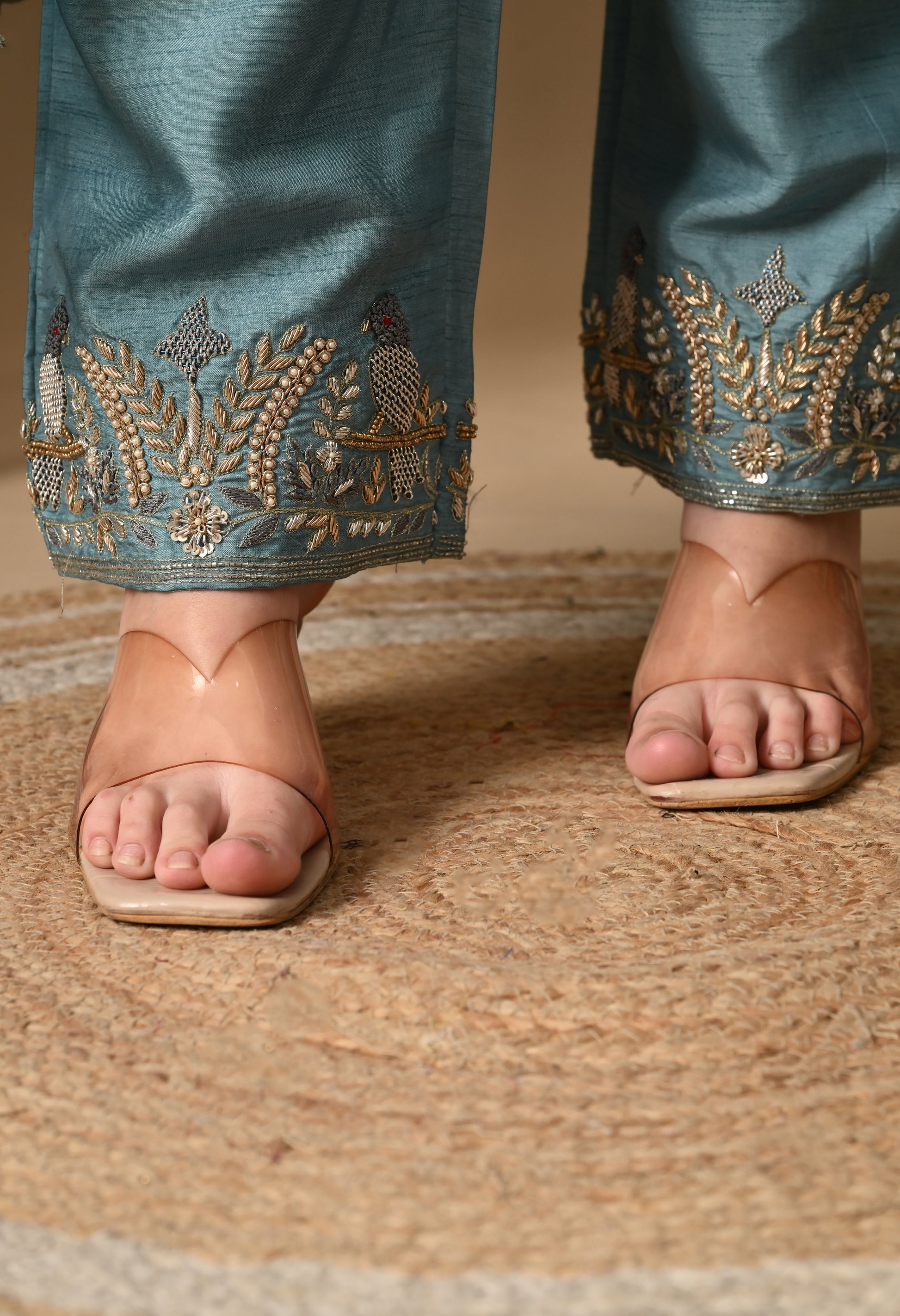 A perfect blend of charm and grace, this astonishing Kurta Set is designed for those who cherish beauty and sophistication. Crafted with regal silk fabric, kurta looks mesmerising in royal sky blue shade, adorned with zardozi, thread and sequence work. Complemented by soft organza dupatta and silk bottom, the piece will sweep you off your feet.