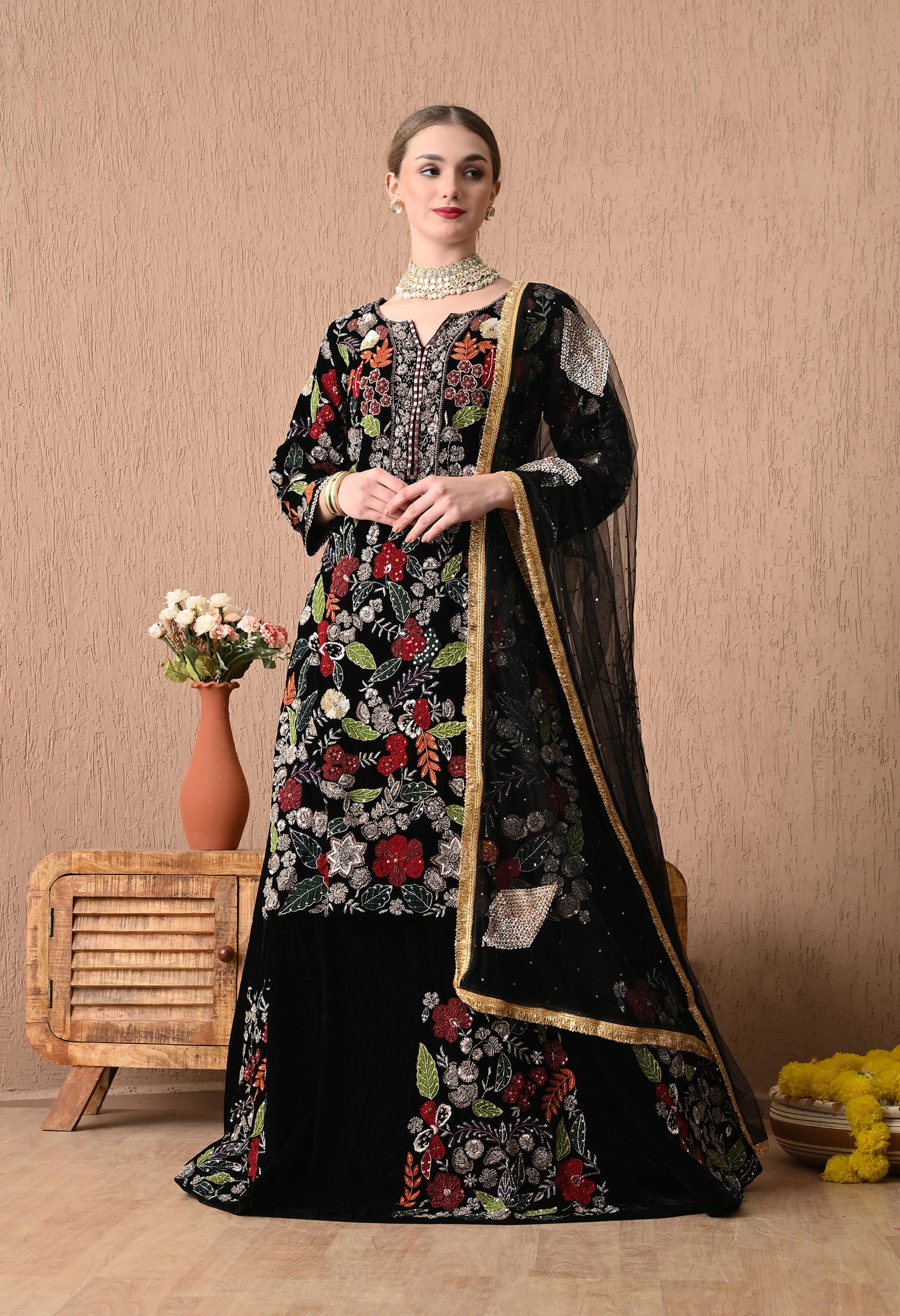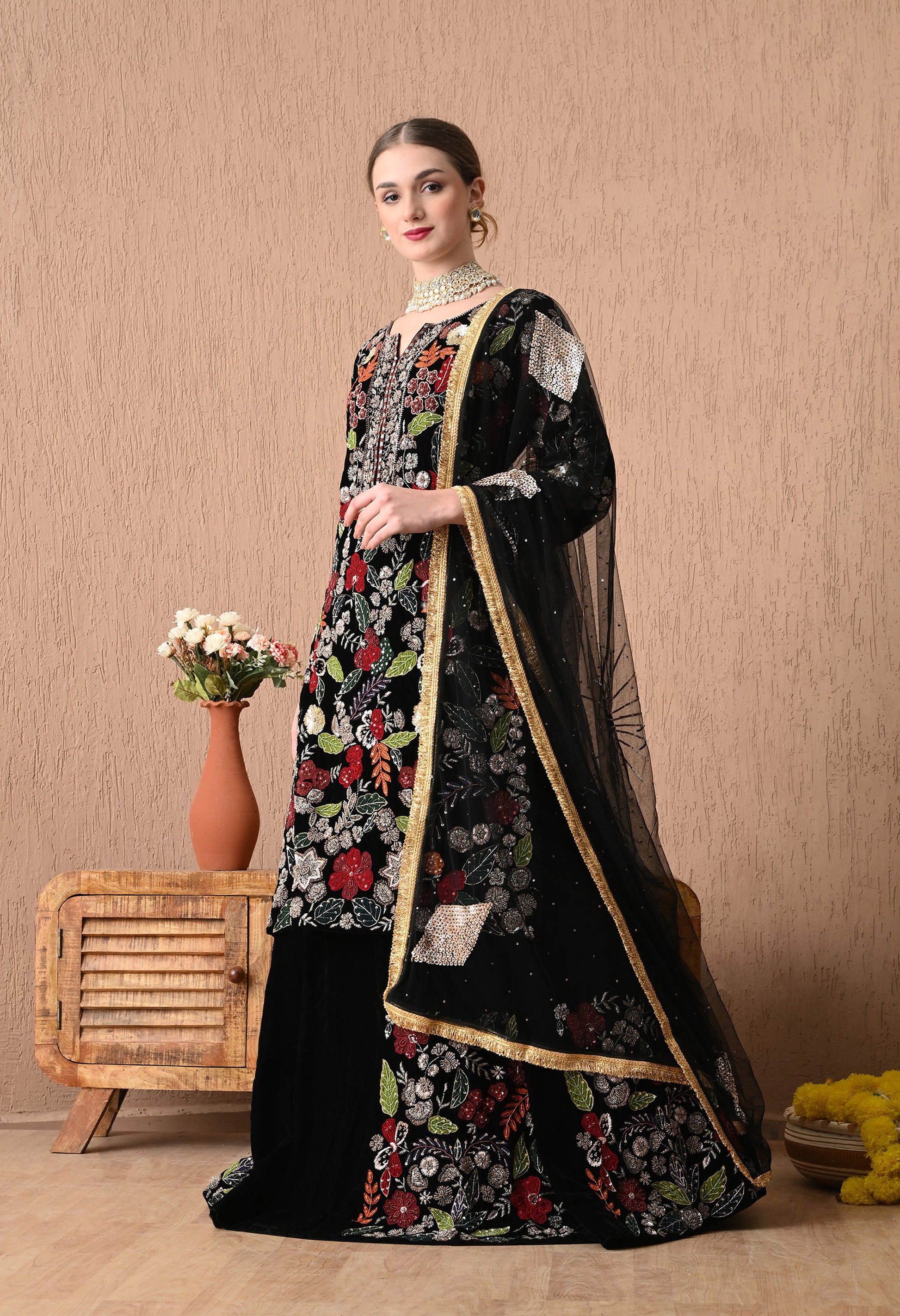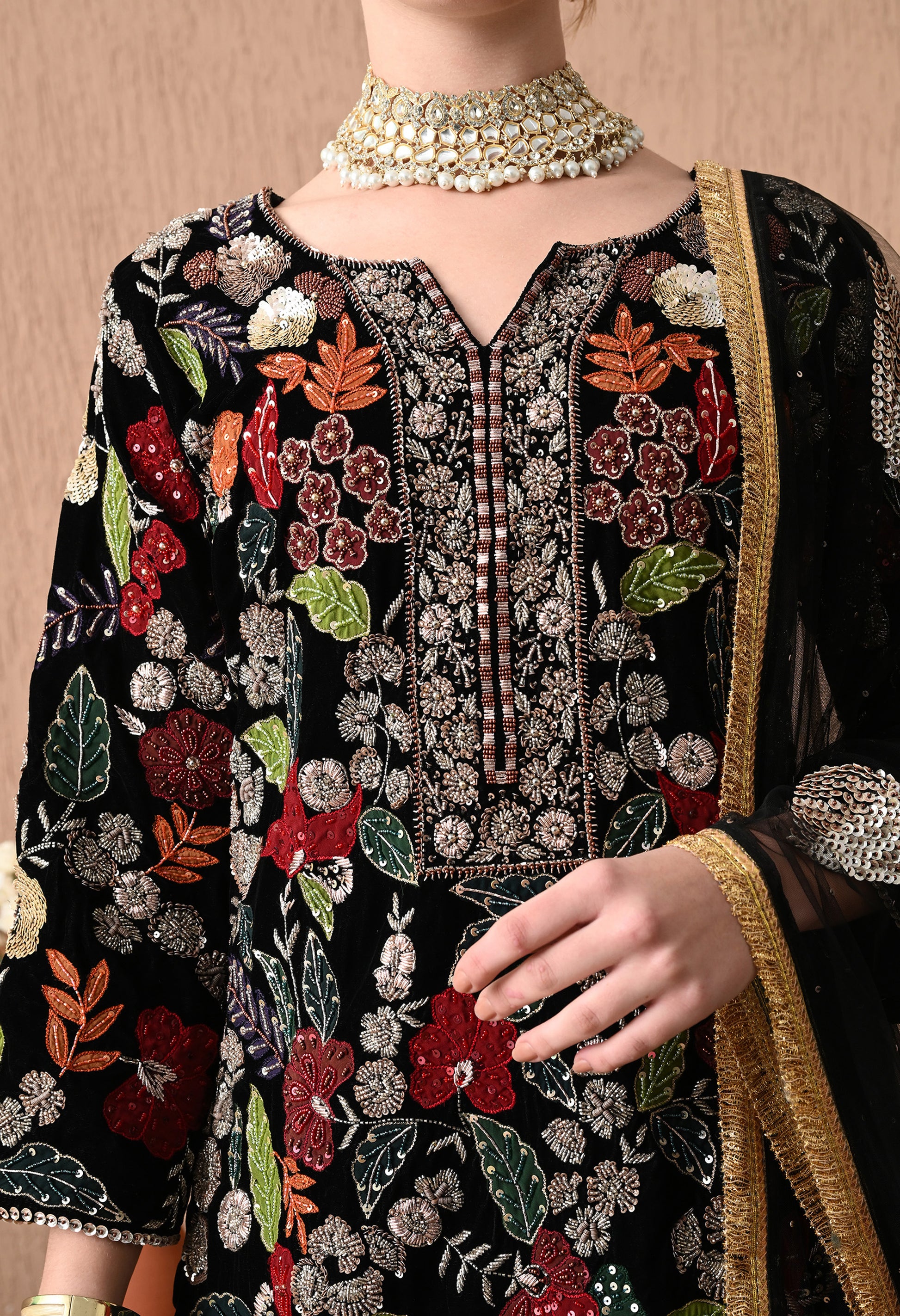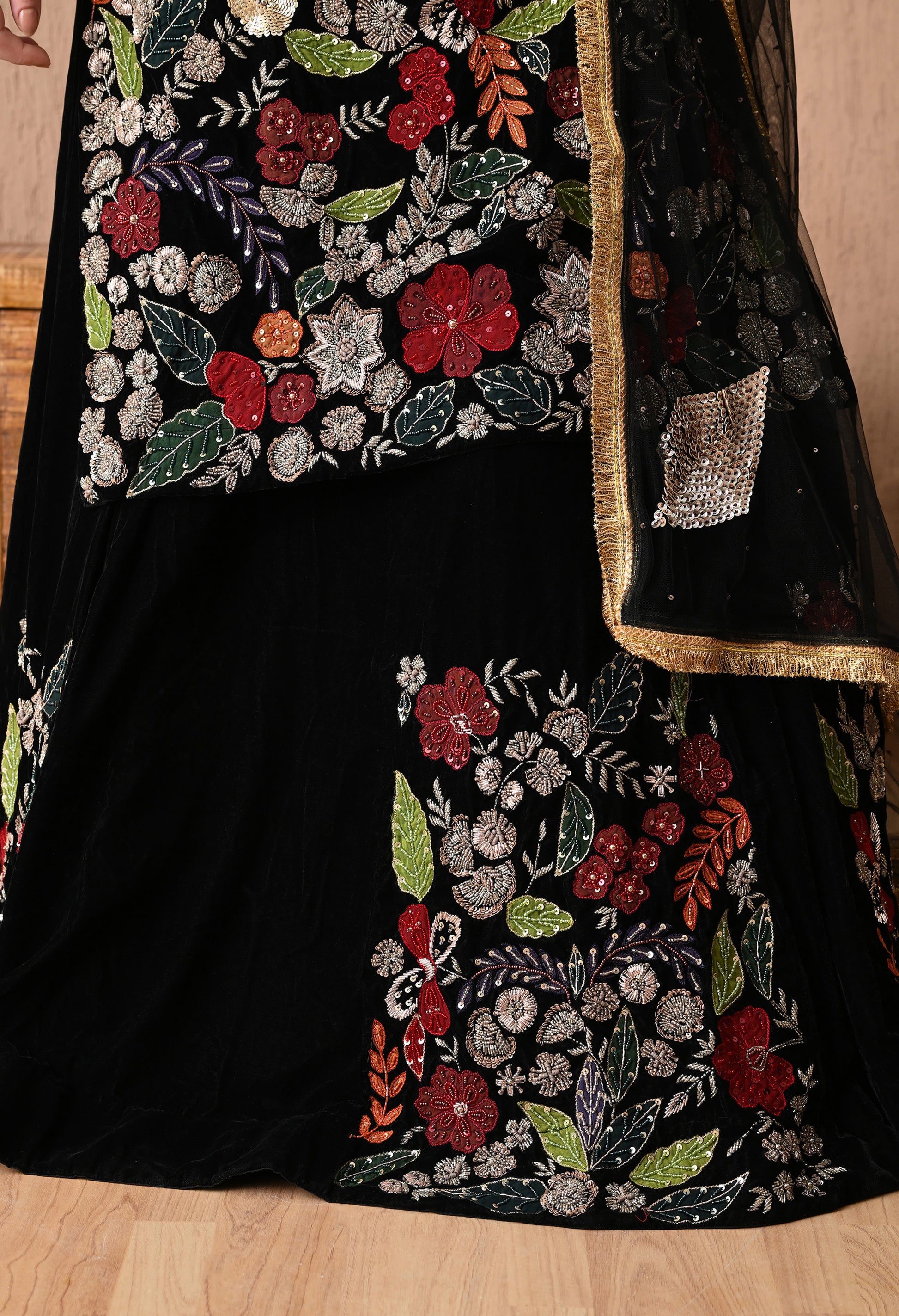 This stunning lehnga set features an exquisite combination of Zardozi, applique, thread, dabka, and sequin embroidery. The vibrant floral motifs beautifully enhance the luxurious black fabric, imparting a regal charm. Complemented by a delicate net dupatta adorned with intricate detailing, this ensemble exudes elegance and opulence, making it ideal for special occasions.