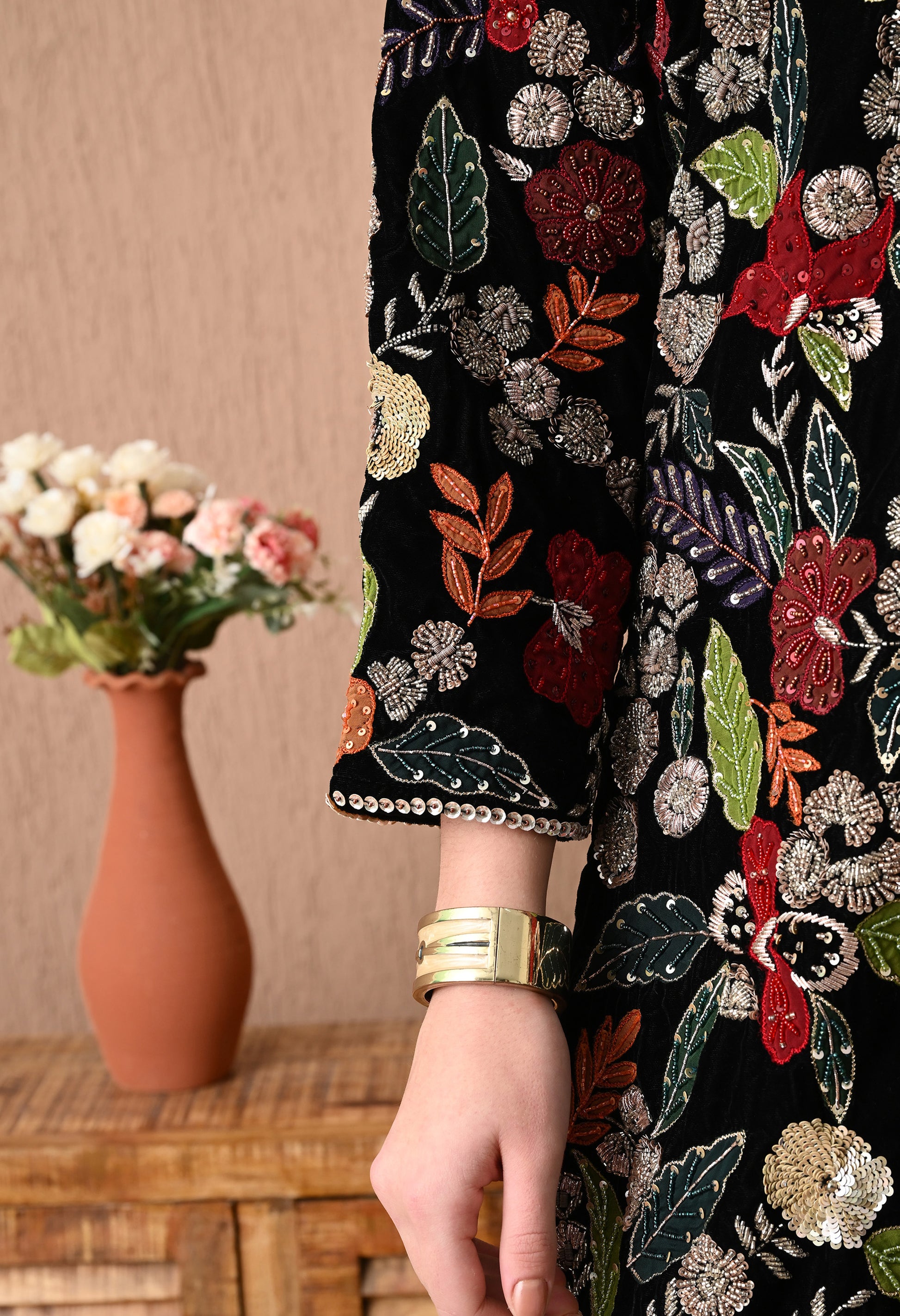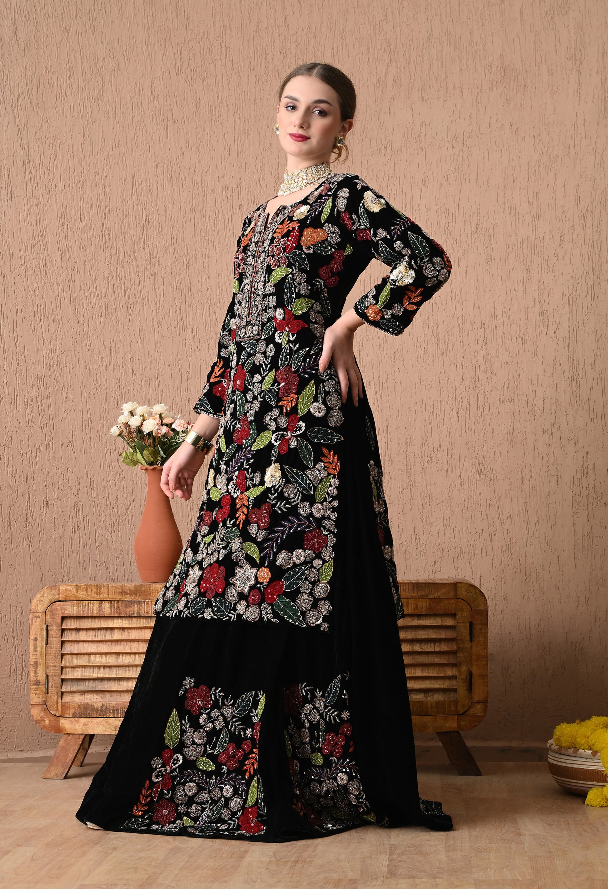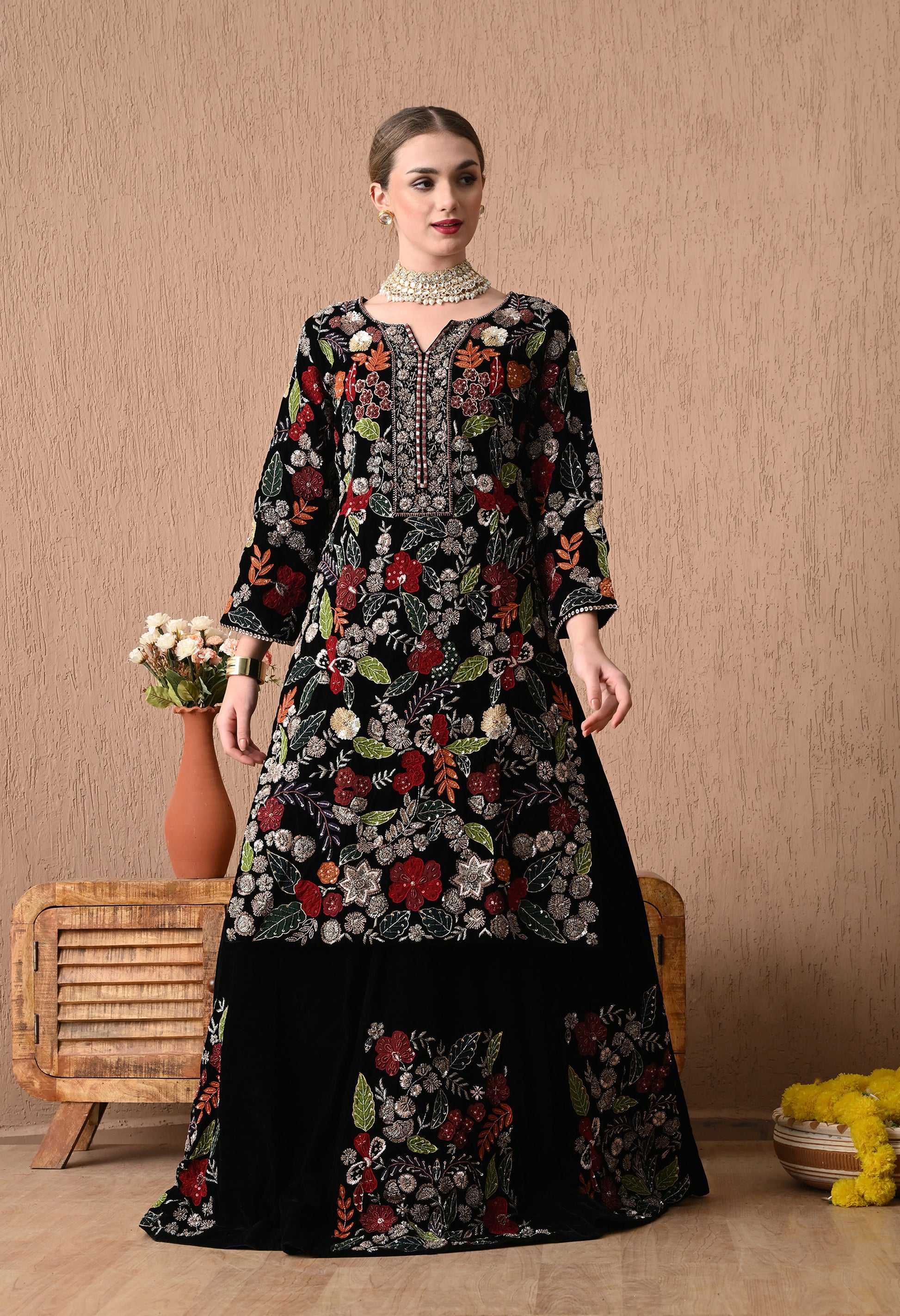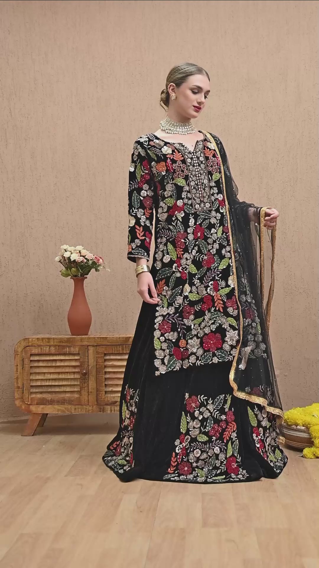 This stunning lehnga set features an exquisite combination of Zardozi, applique, thread, dabka, and sequin embroidery. The vibrant floral motifs beautifully enhance the luxurious black fabric, imparting a regal charm. Complemented by a delicate net dupatta adorned with intricate detailing, this ensemble exudes elegance and opulence, making it ideal for special occasions.