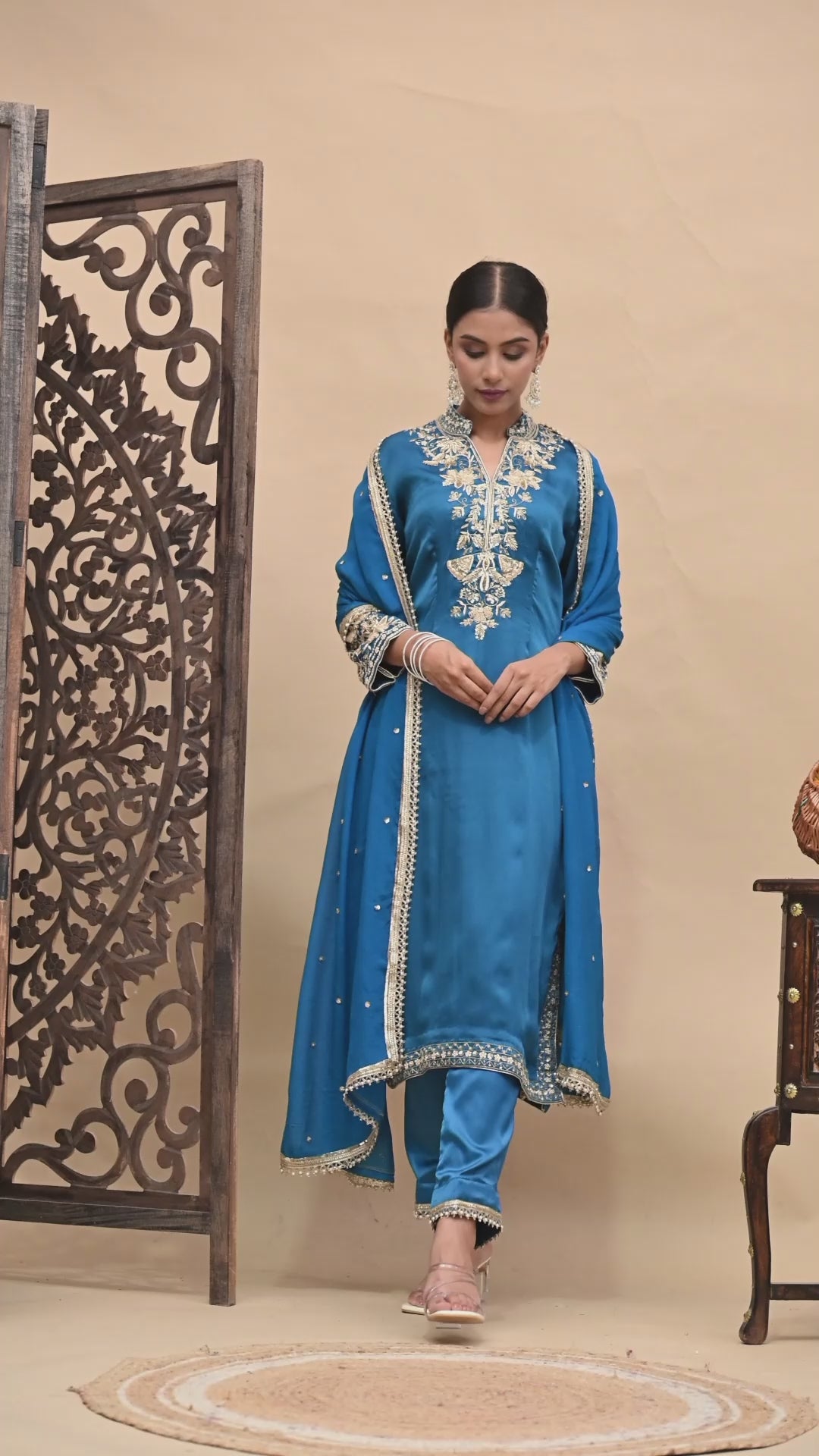 Shine bright this season with our royal blue Kurta Set, complemented by a soft organza dupatta, an intricately crafted and embroidered pure satin kurta, and a coordinated pure satin bottom. The elegant zardozi, dabka, and sequin details add a touch of timeless allure.