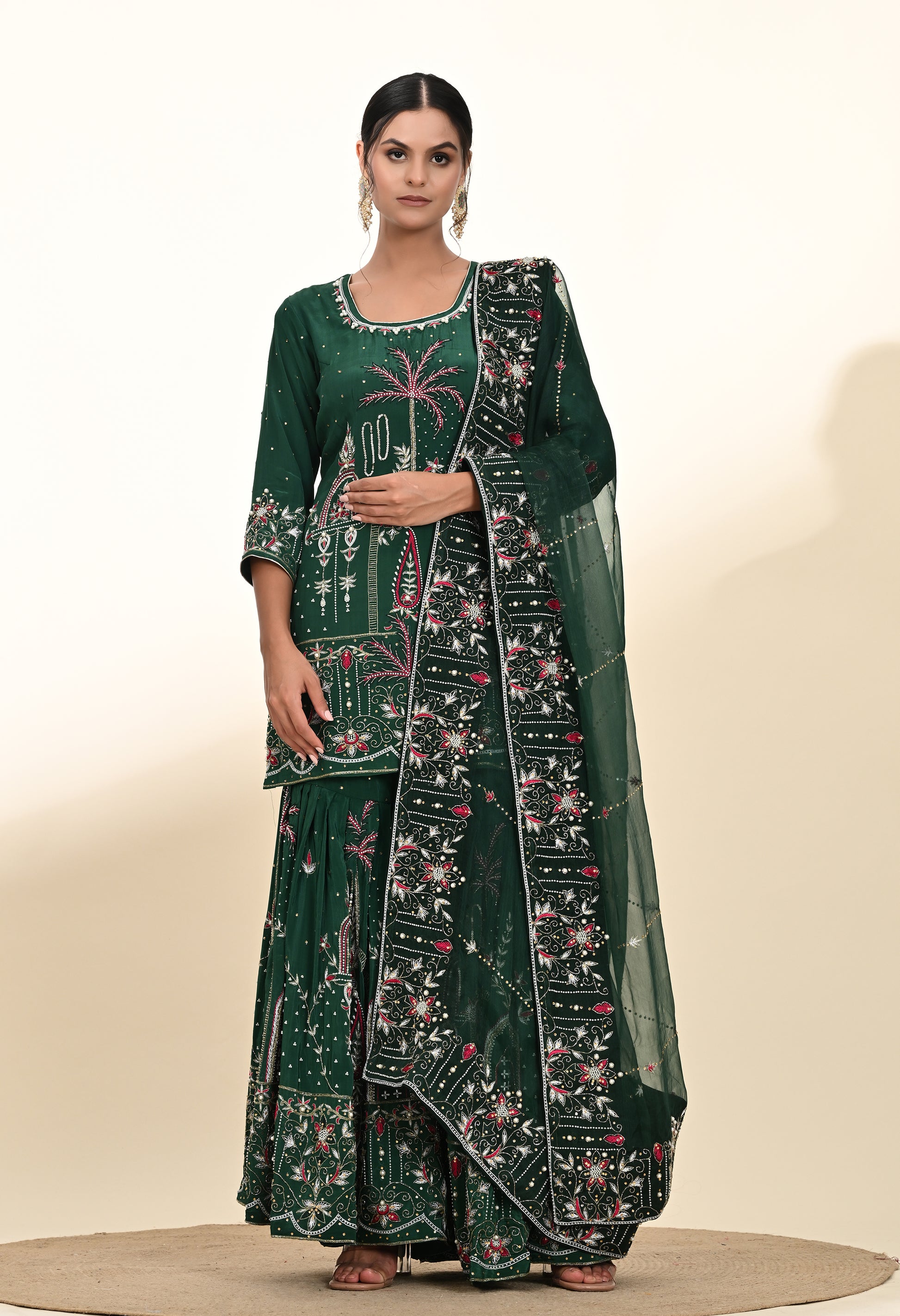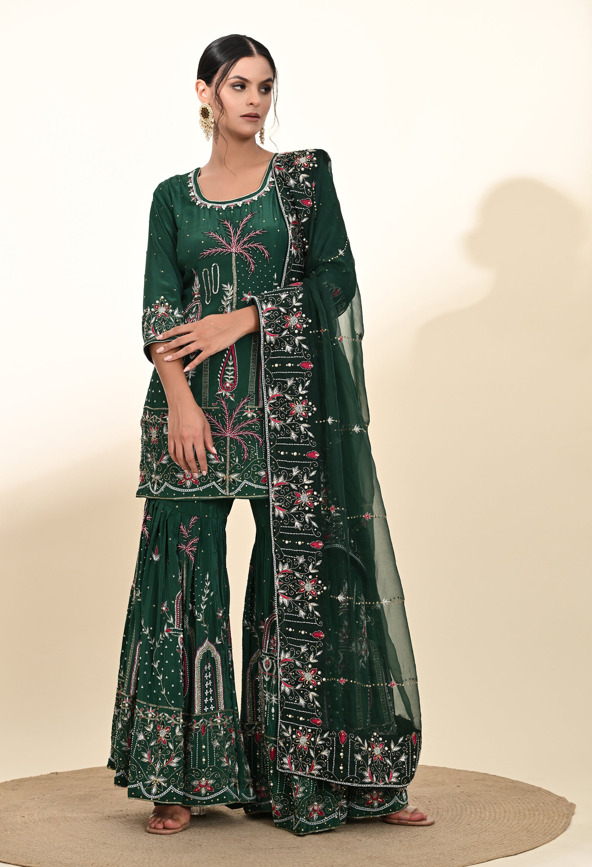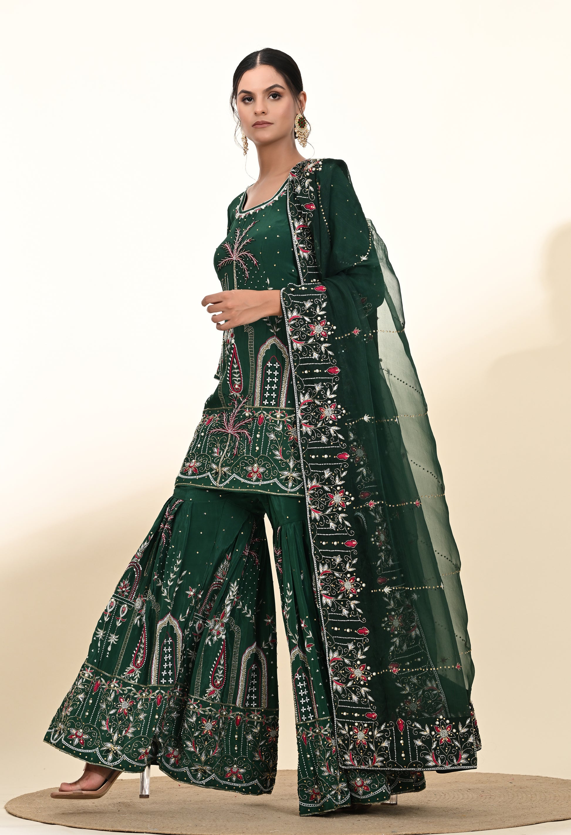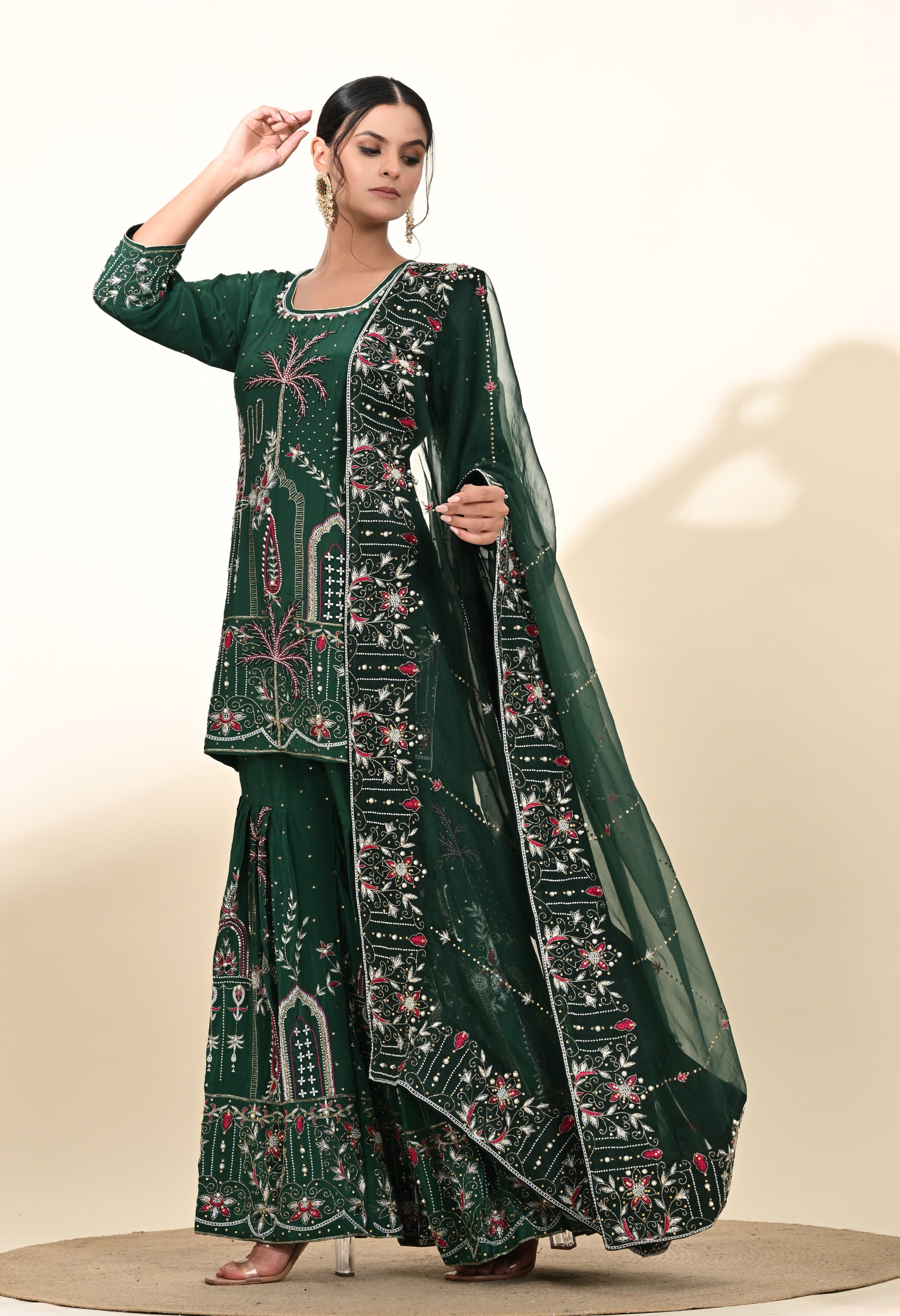 Royal Bottle Green Sharara Set with Exquisite Zardozi Embroidery