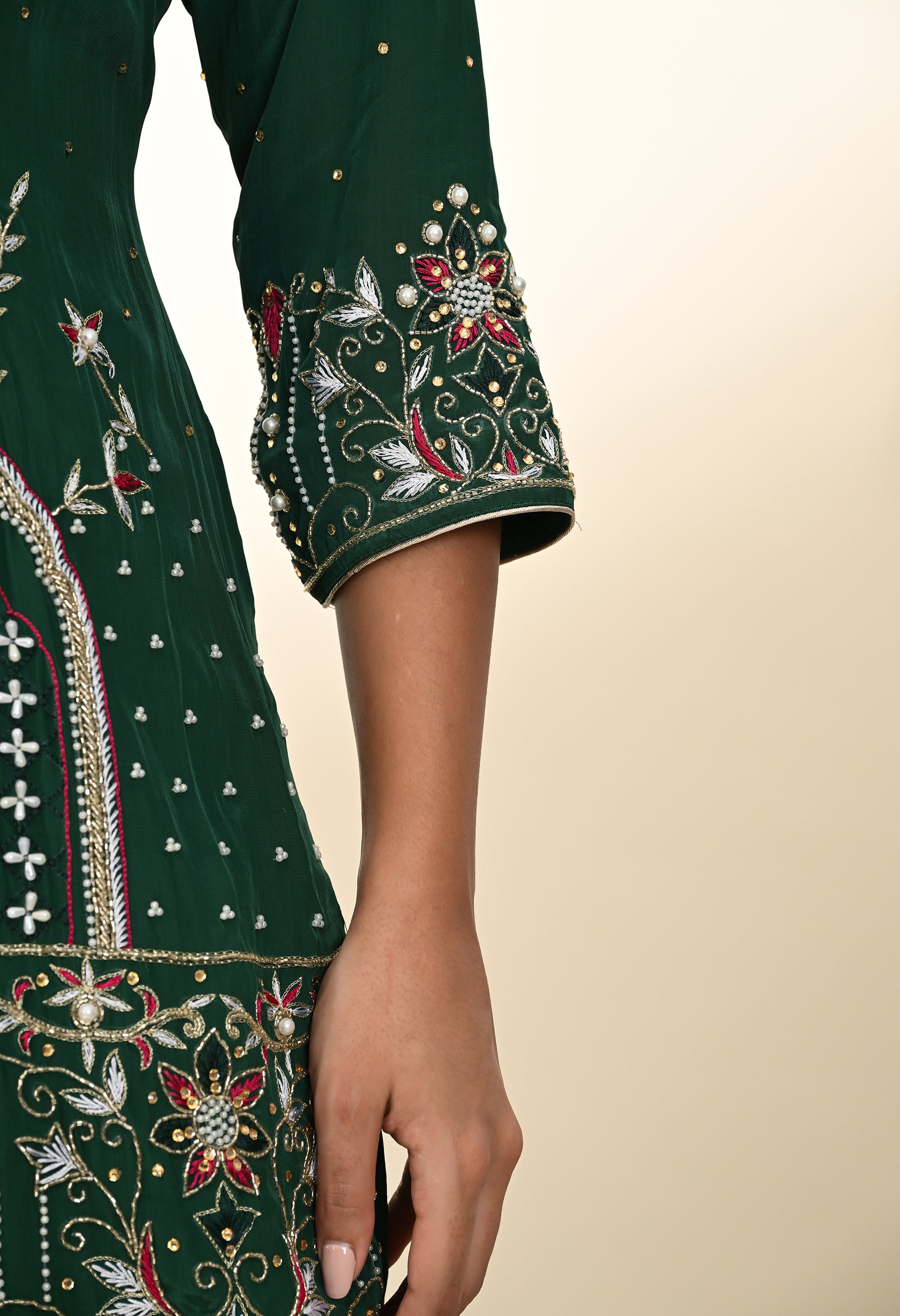 Reveal your stylish flair with our expertly embroidered Sharara Set. Fashioned from luxurious crepe fabric, this kurta stands out with fine zardozi, crystal, and thread embroidery in a striking bottle green shade. Complemented by a subtly adorned organza dupatta and matching crepe sharara, this set is designed to make you feel radiant. A stylish option to enhance your personal style.
