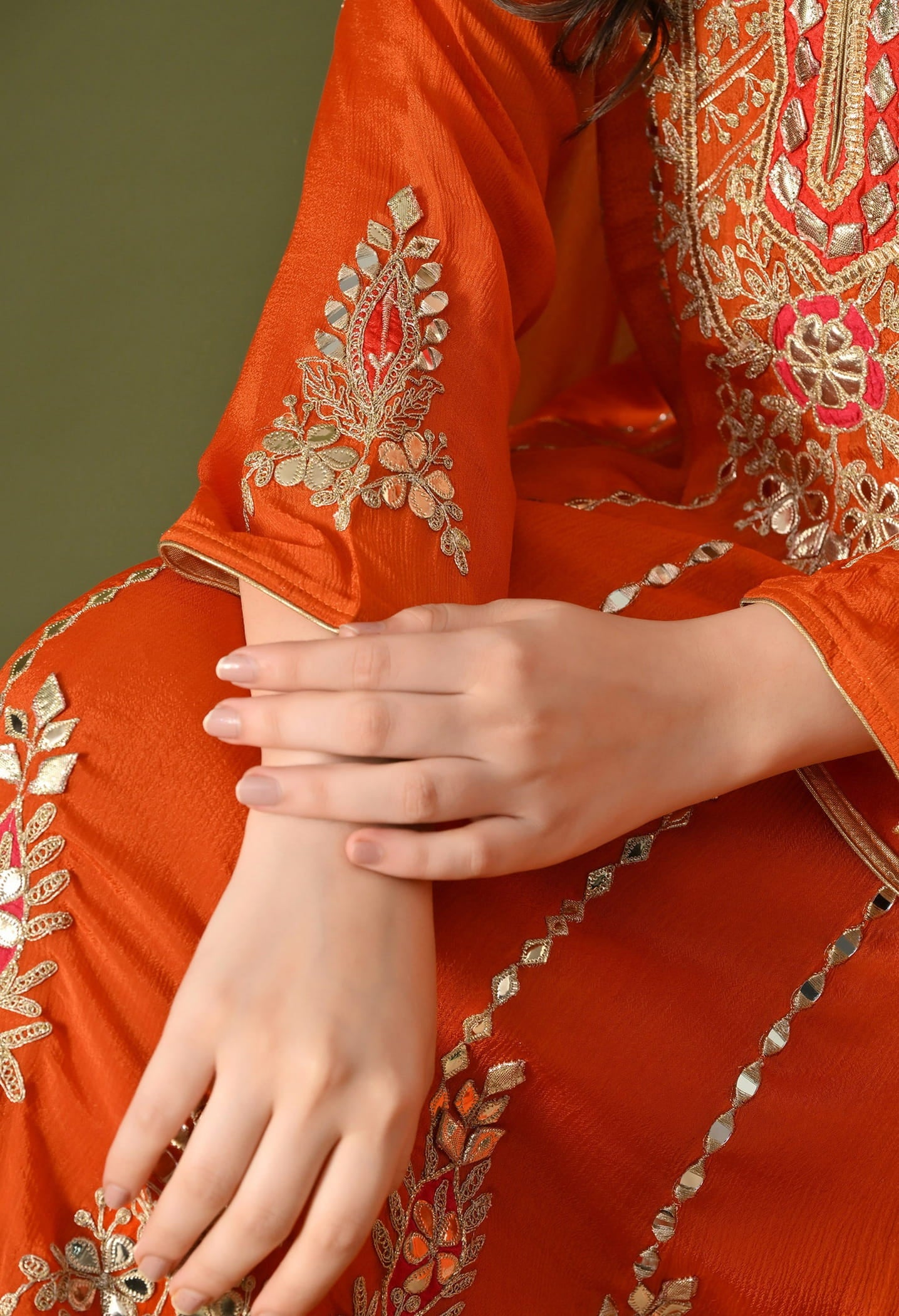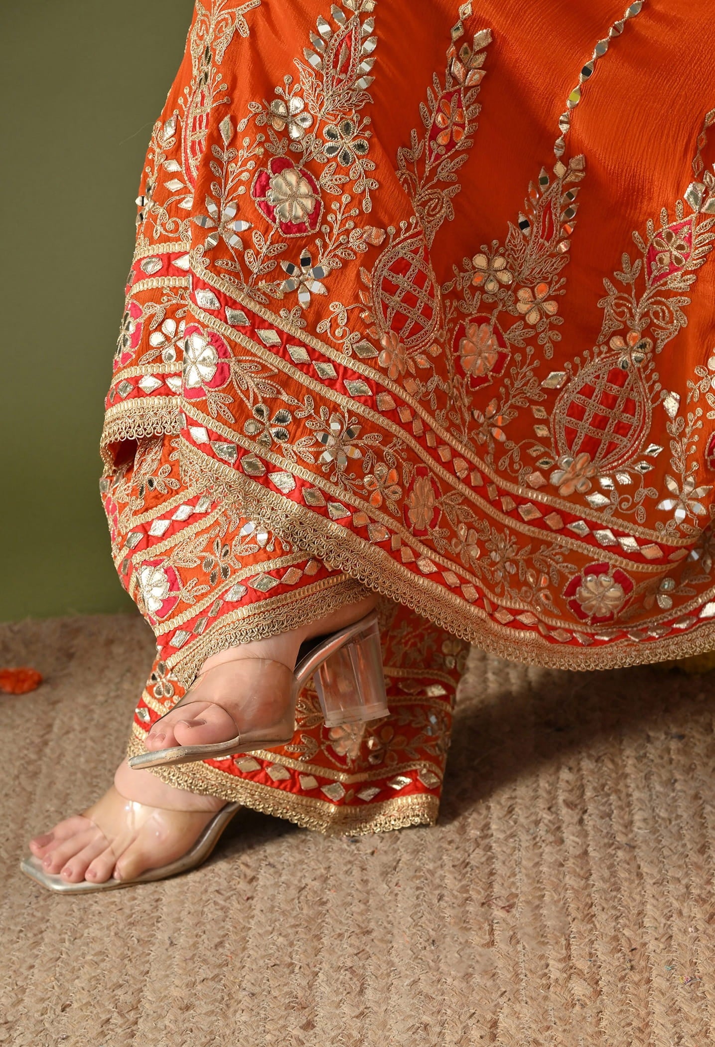 This striking rust orange kurta set is beautifully hand embroidered, featuring traditional gotta accents enhanced with intricate zardozi patterns, fine thread embroidery, and reflective mirror detailing. The fluid chinon kurta paired with a graceful farshi salwar creates a regal silhouette, making it an elegant choice for weddings, festive gatherings, haldi, and mehndi celebrations. - Occasion: Party & Festive, Wedding, Mehndi & Haldi