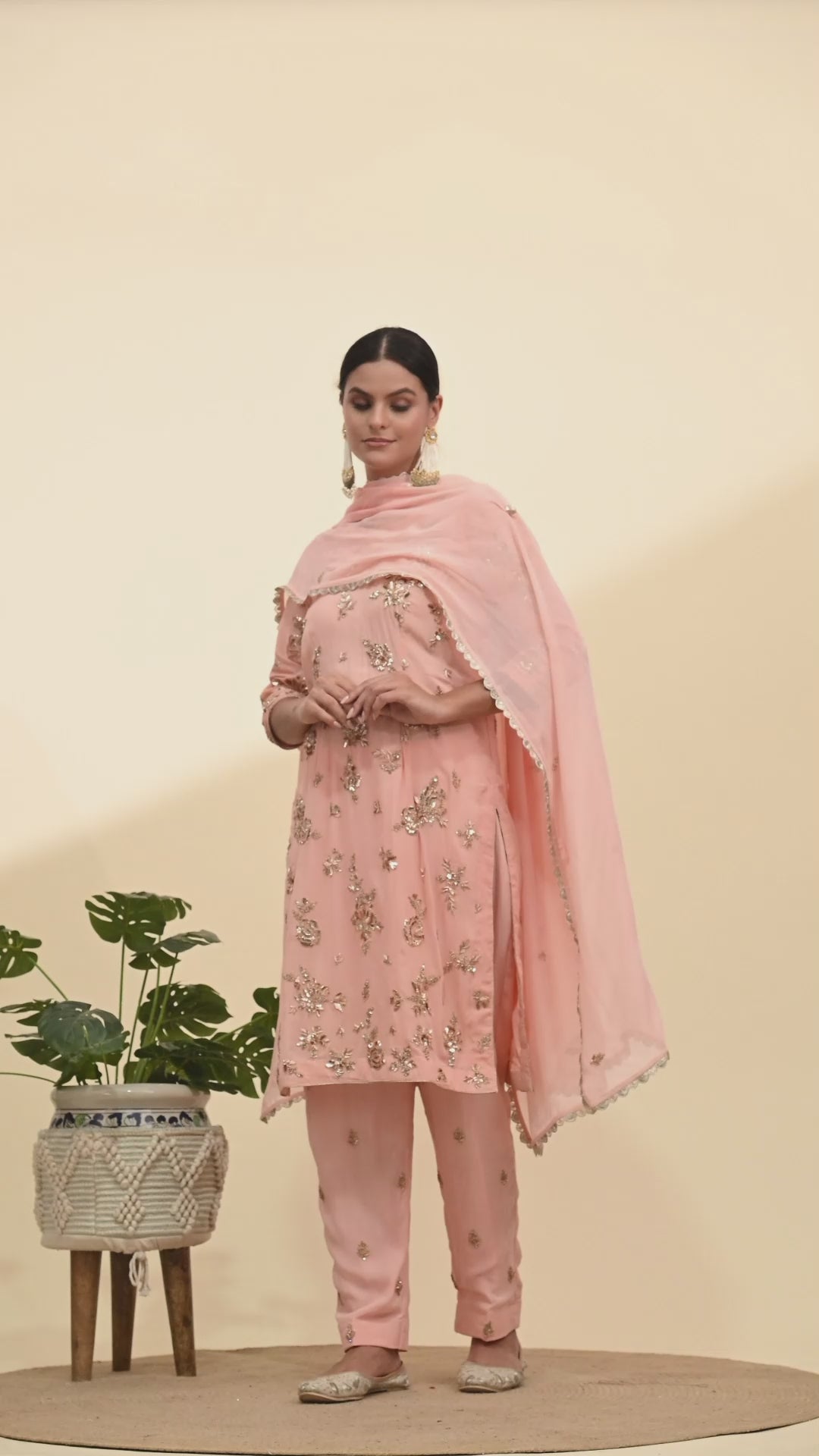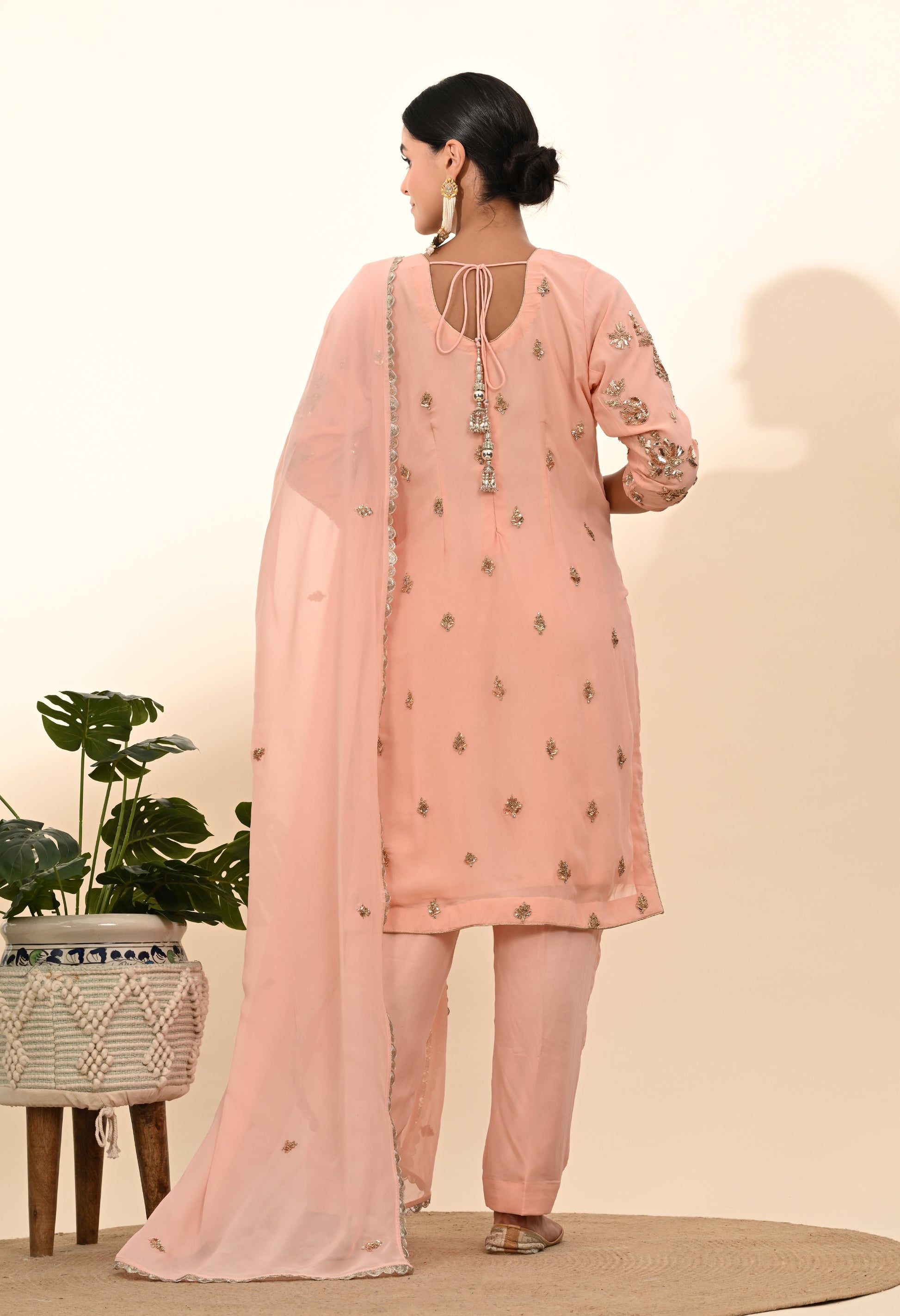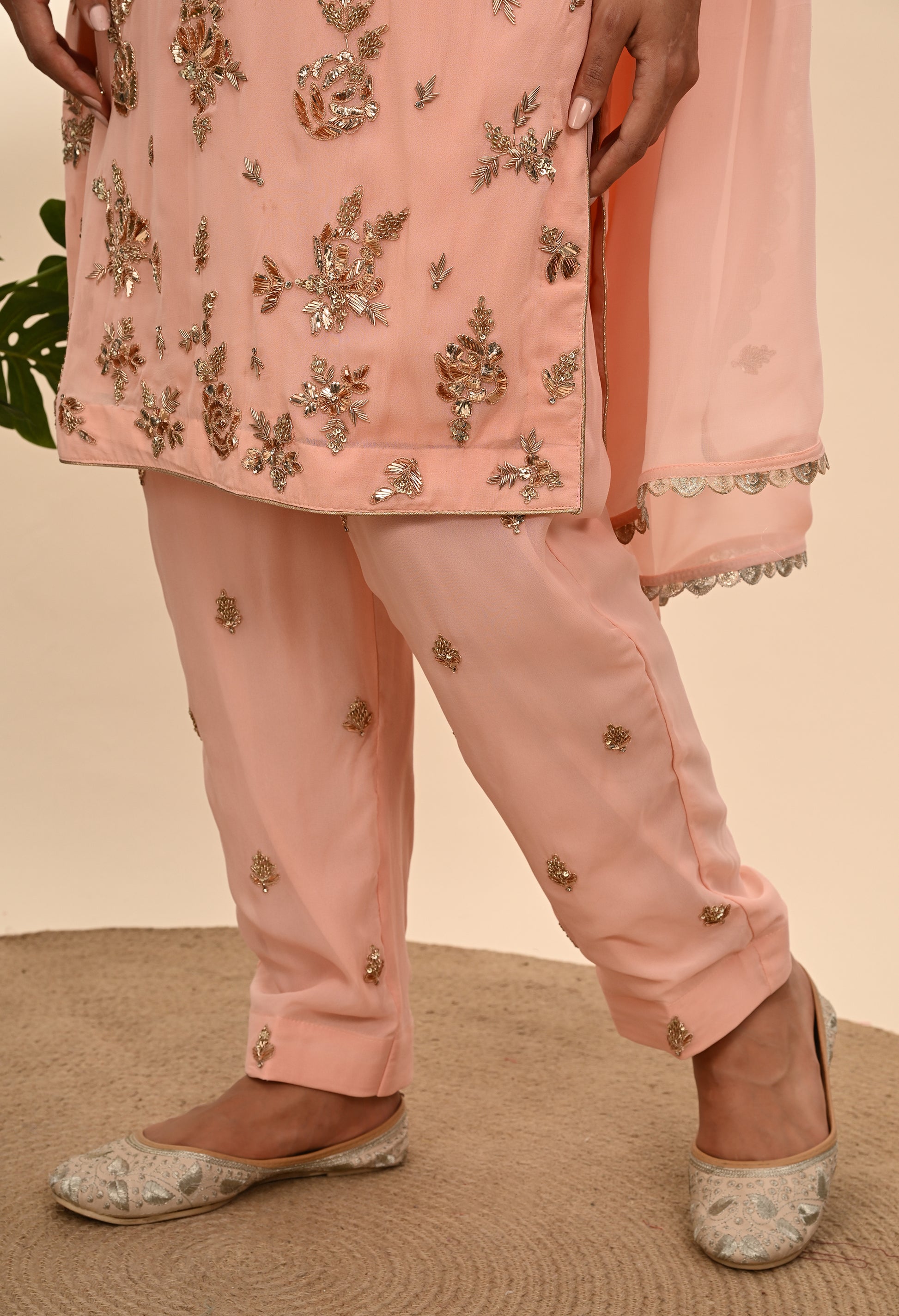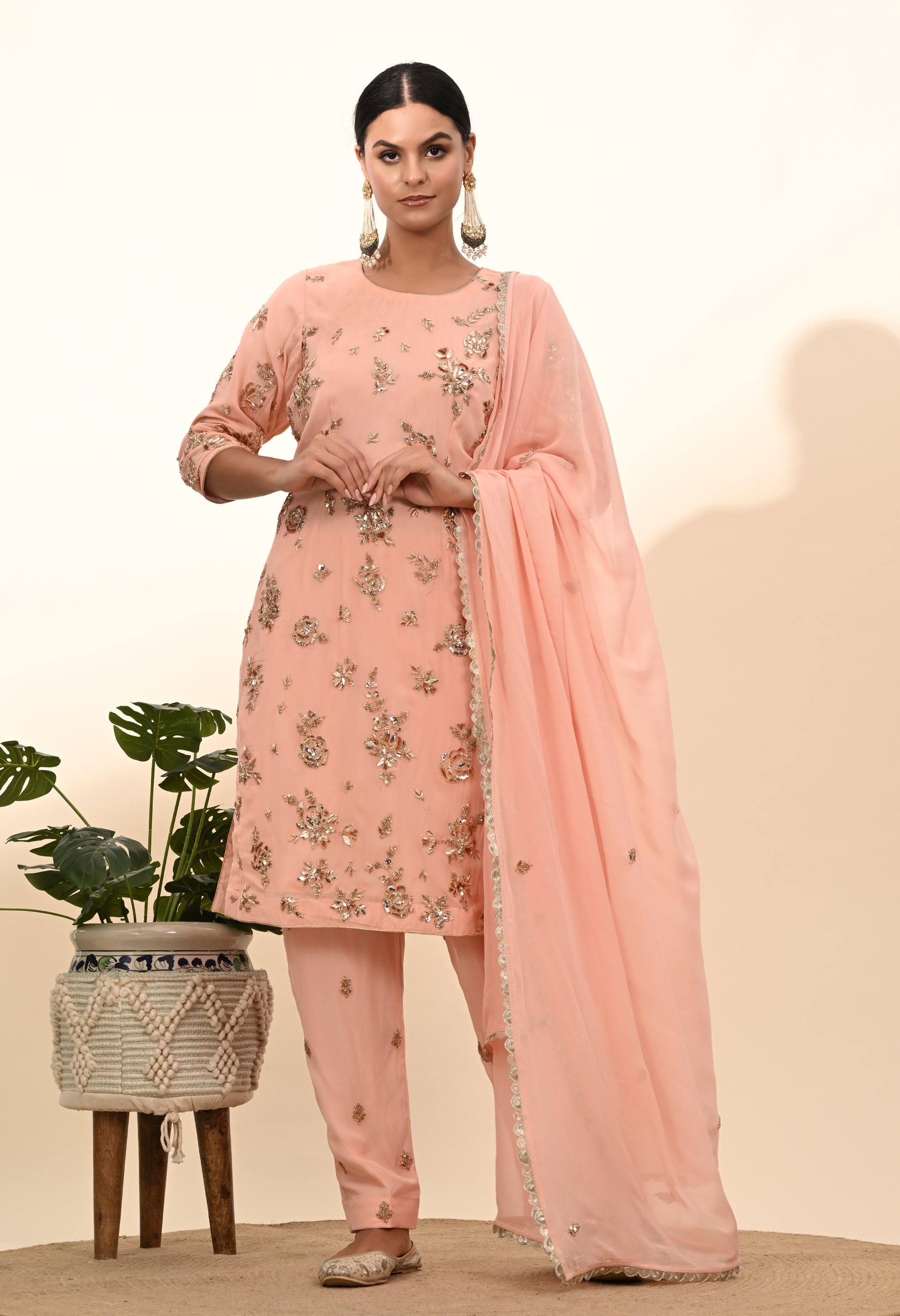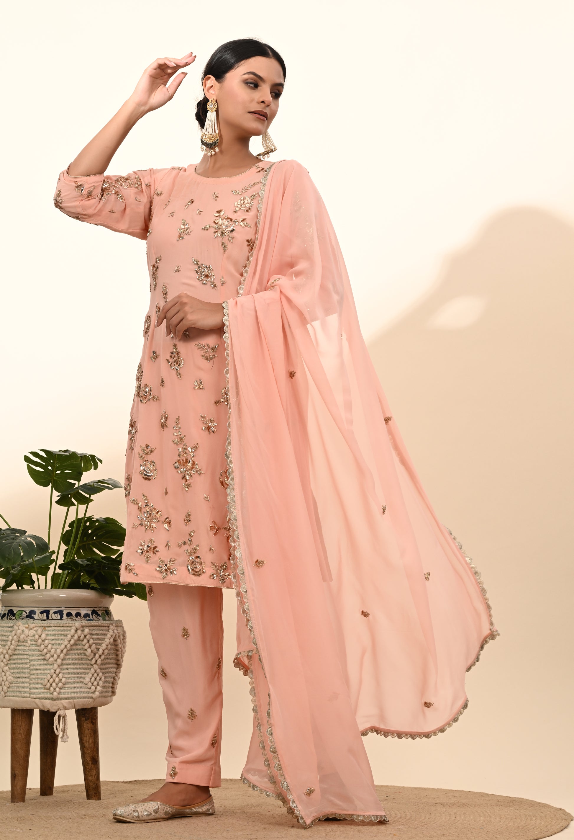 Express your unique charm with our meticulously embroidered Kurta Set, crafted from quality georgette fabric. Featuring mukaish and zardozi embroidered kurta in a luminous pink peach shade, and paired with a delicately embellished georgette dupatta and georgette bottom, this ensemble highlights your natural and lively personality.