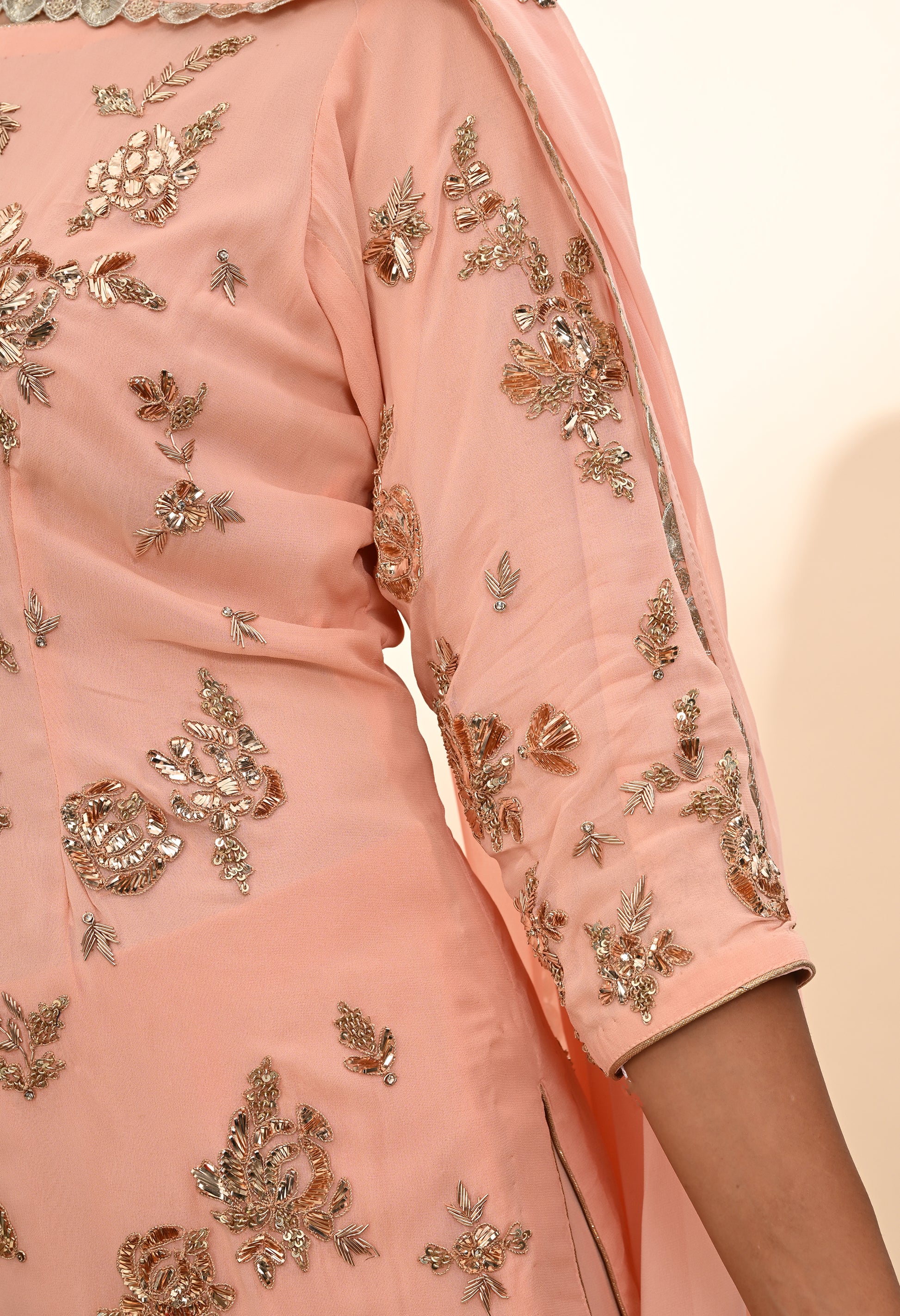 Soft Pink Peach Georgette Kurta Set with Mukaish and Zardozi Embroidery