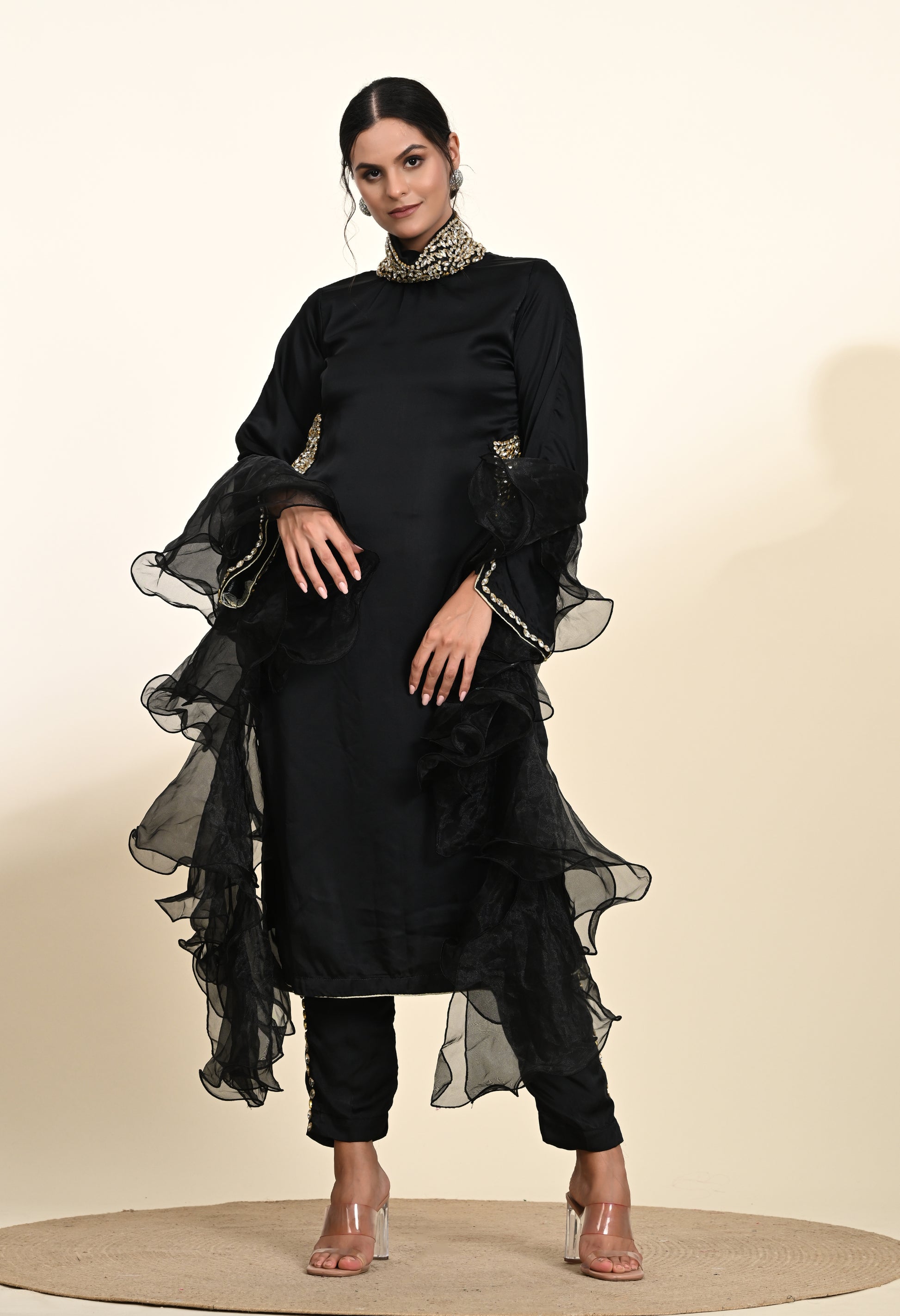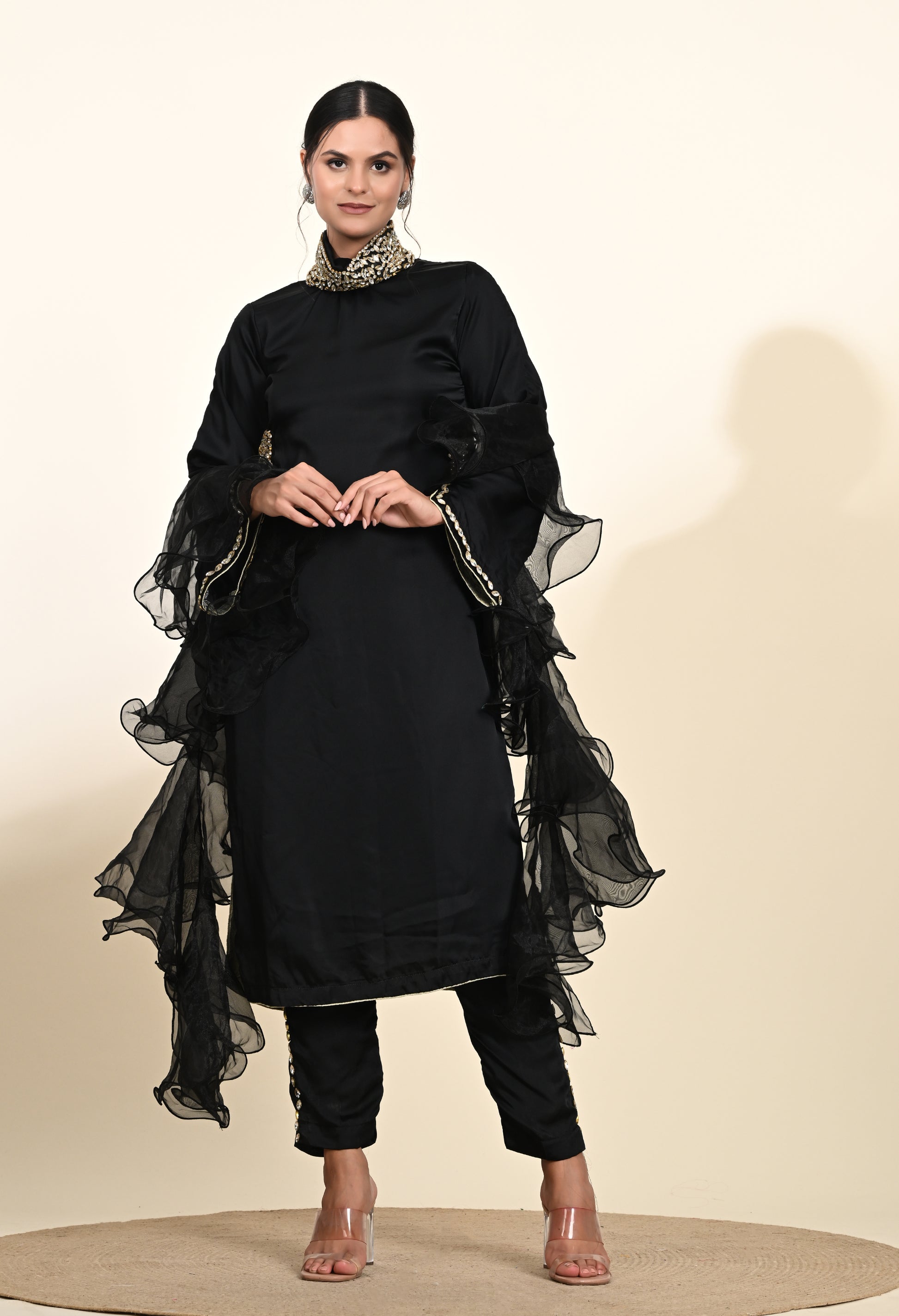 Step into a world of royalty with our lavish black Kurta Set. The satin kurta, paired with matching satin straight pants and organza dupatta, is meticulously embellished with crystal and mirror work. This set is designed to accentuate your refined elegance.