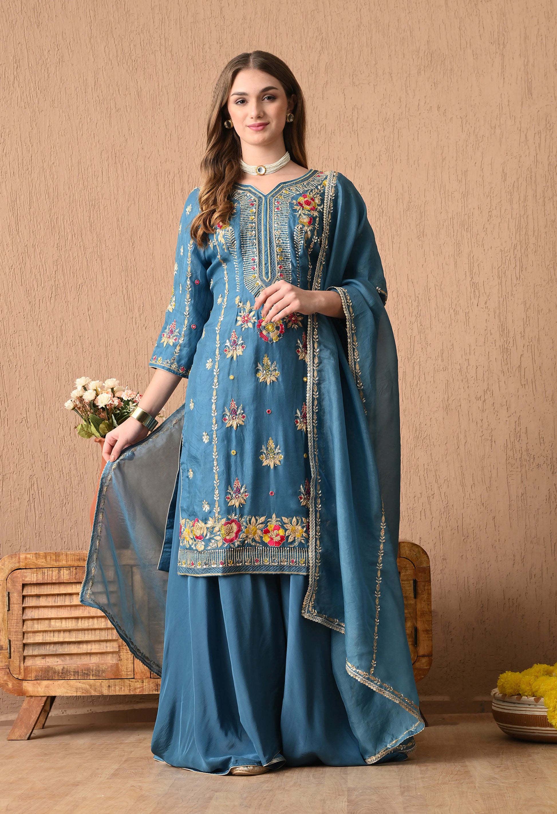 Sophisticated French Blue Organza Kurta Set with Exquisite Embroidery