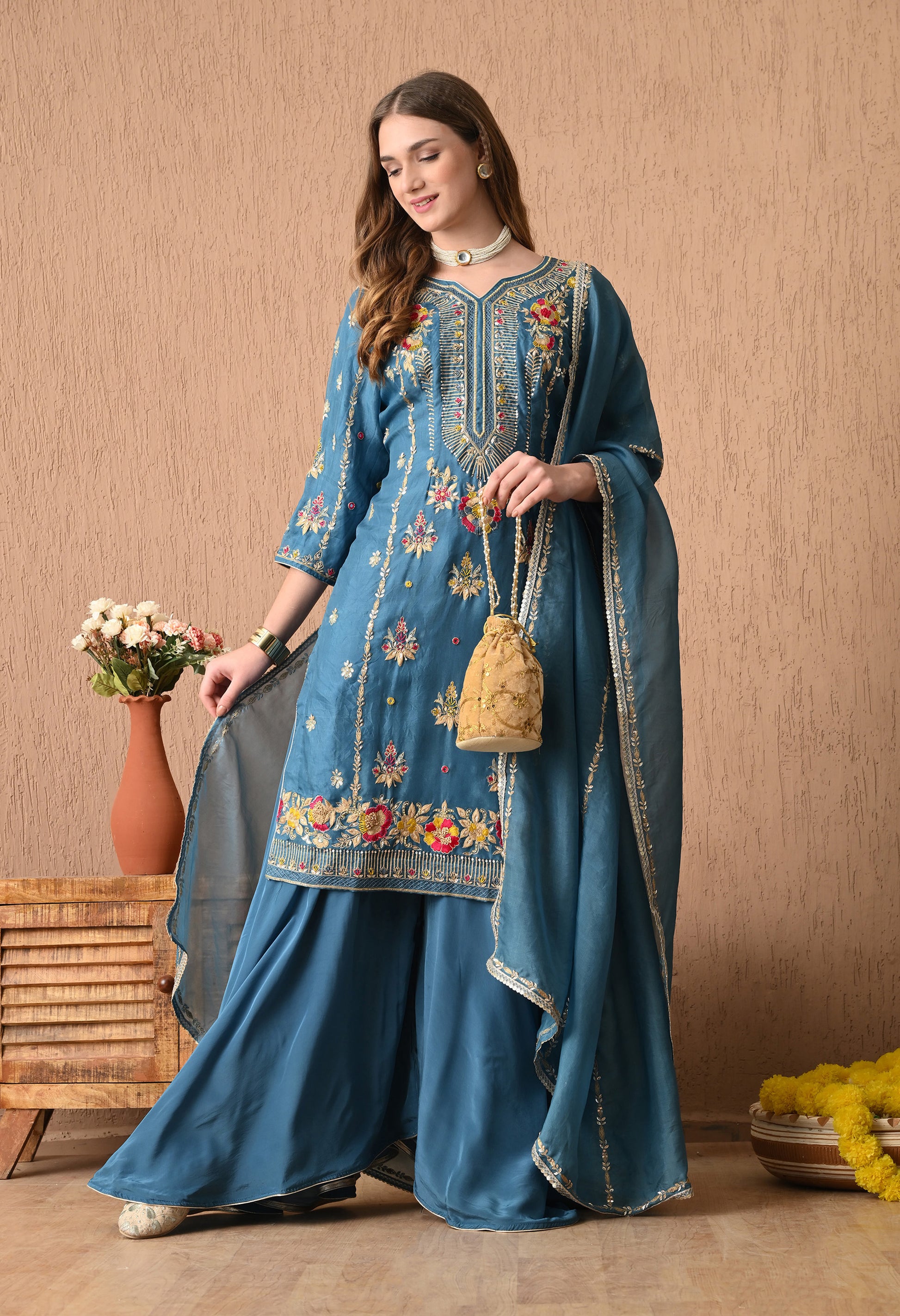 Immerse yourself in exquisite Indian artistry with our stunning three-piece kurta set. Made from luxurious organza fabric, the kurta flaunts delicate zardozi, dabka, cutdana, and sequence embroidery in a radiant french-blue shade, paired with a captivating crafted organza dupatta and crepe bottom. A true masterpiece to enhance your charm.