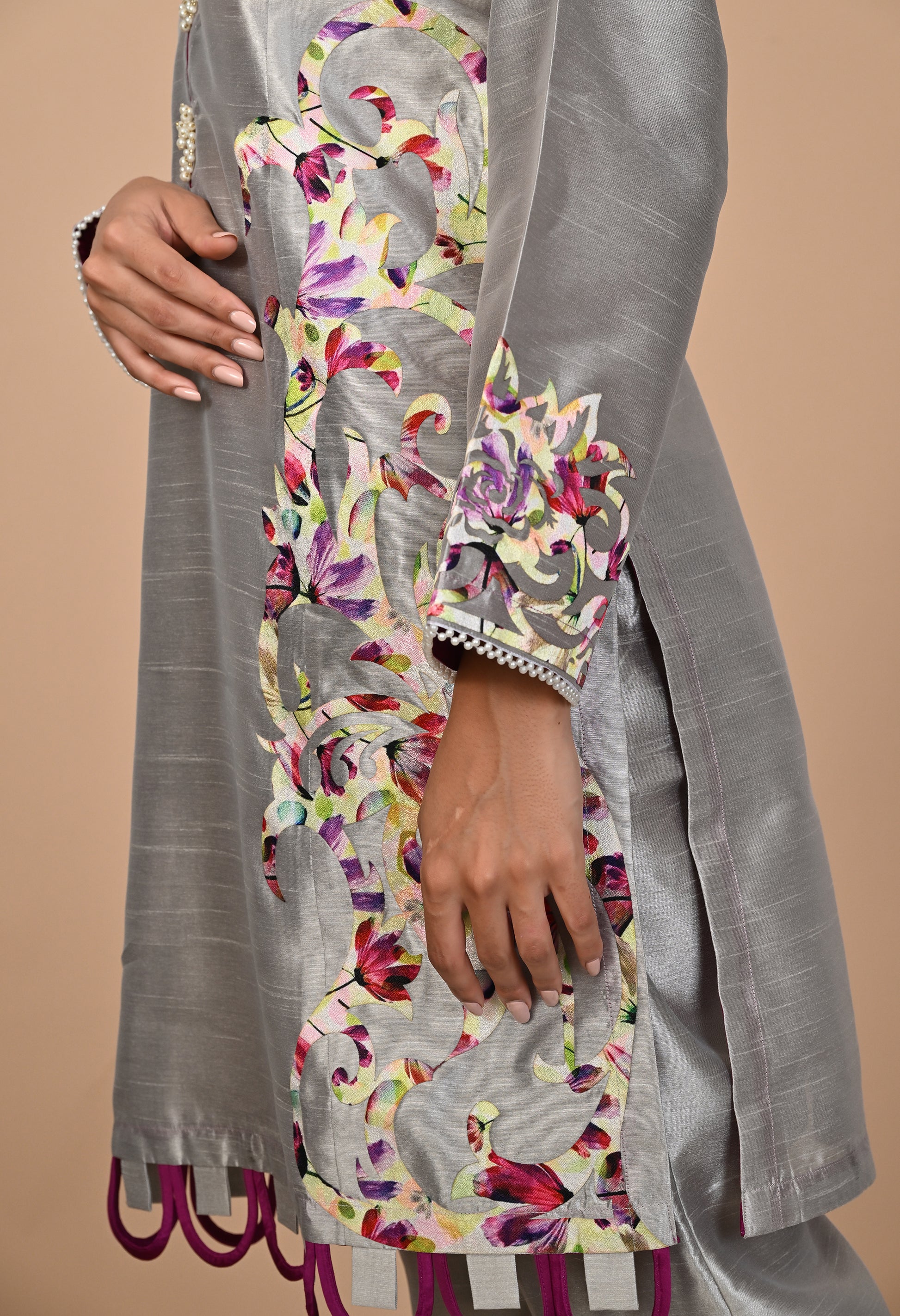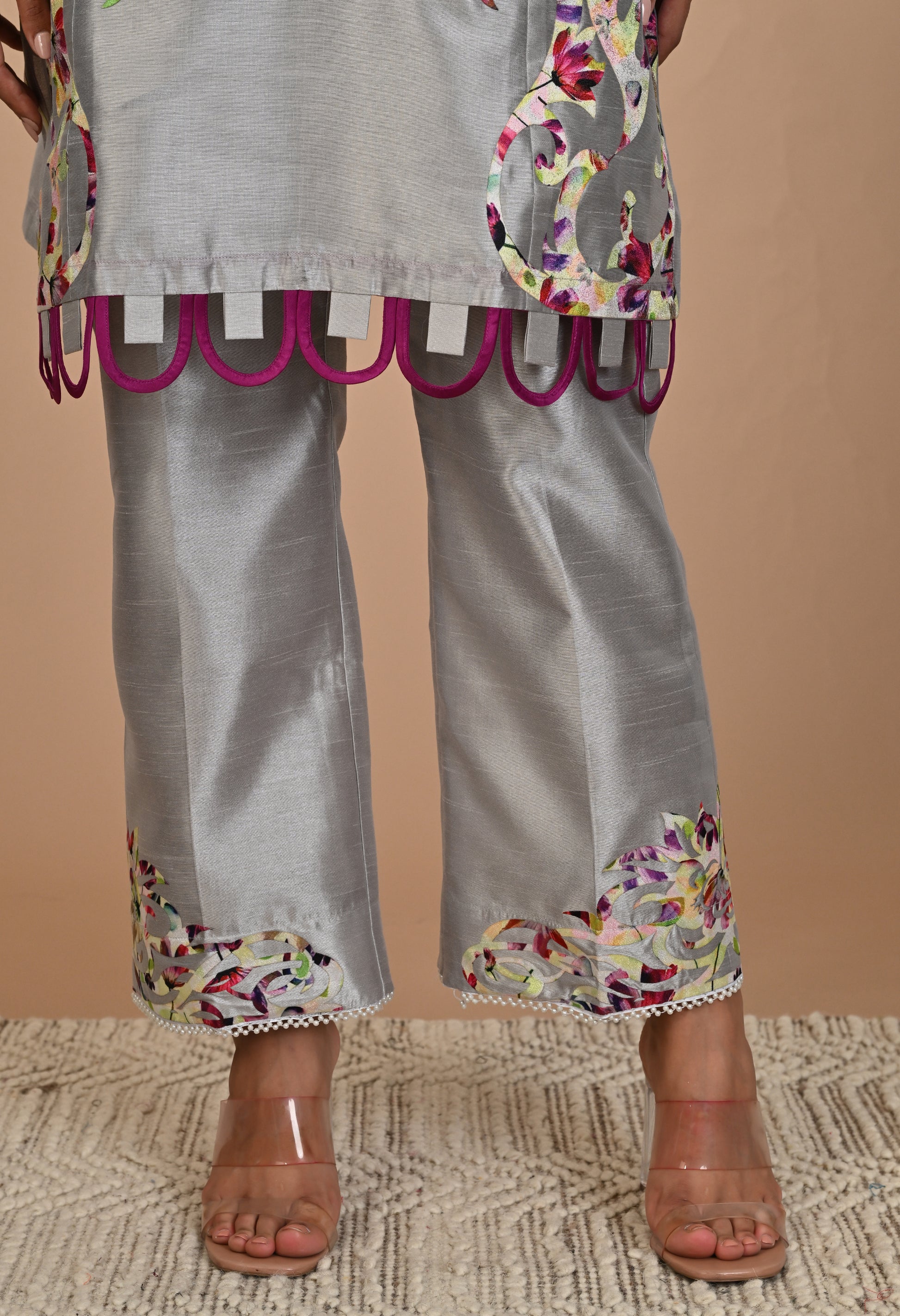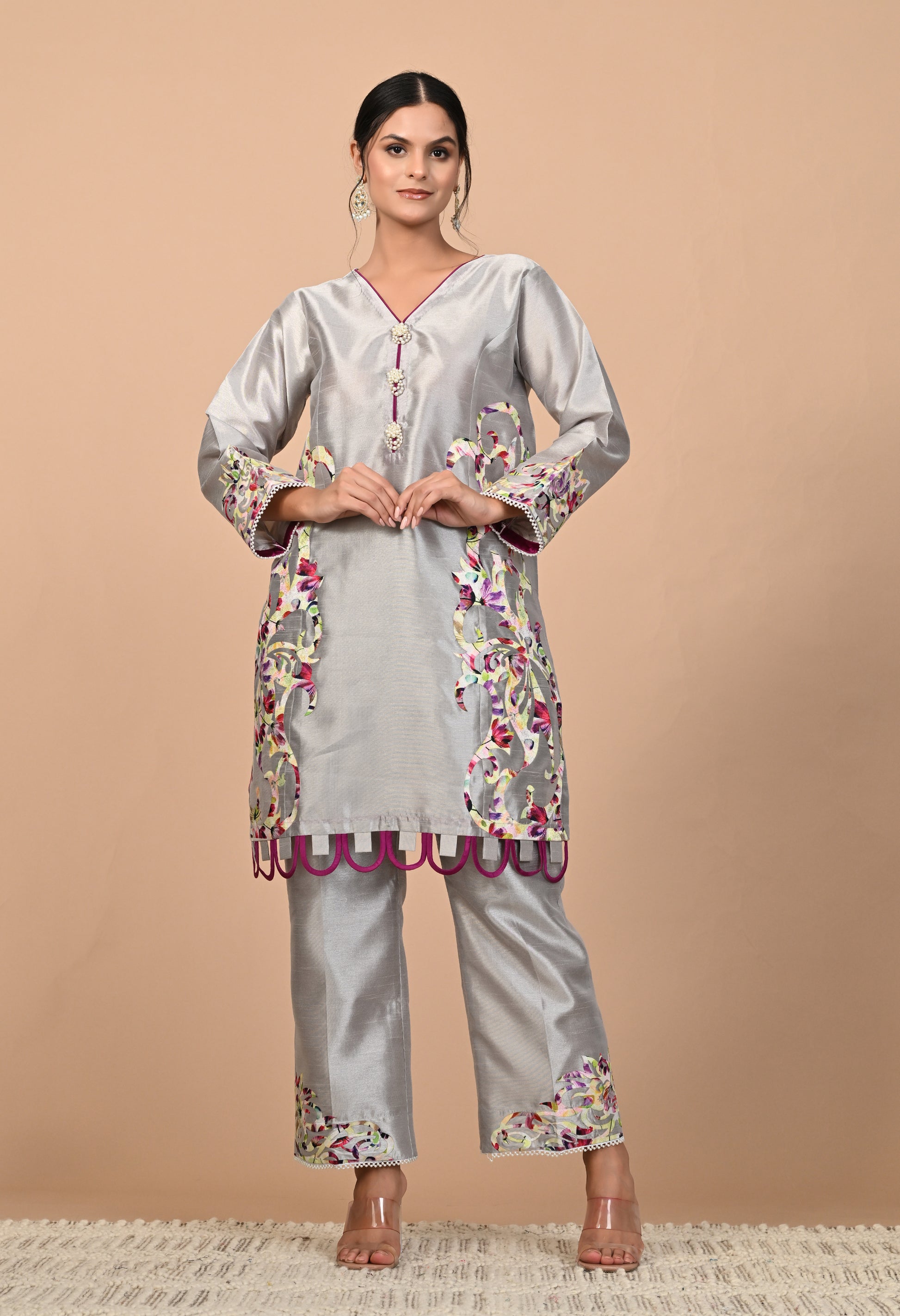 Sophisticated Grey Silk Kurta Set with Appliqué Work