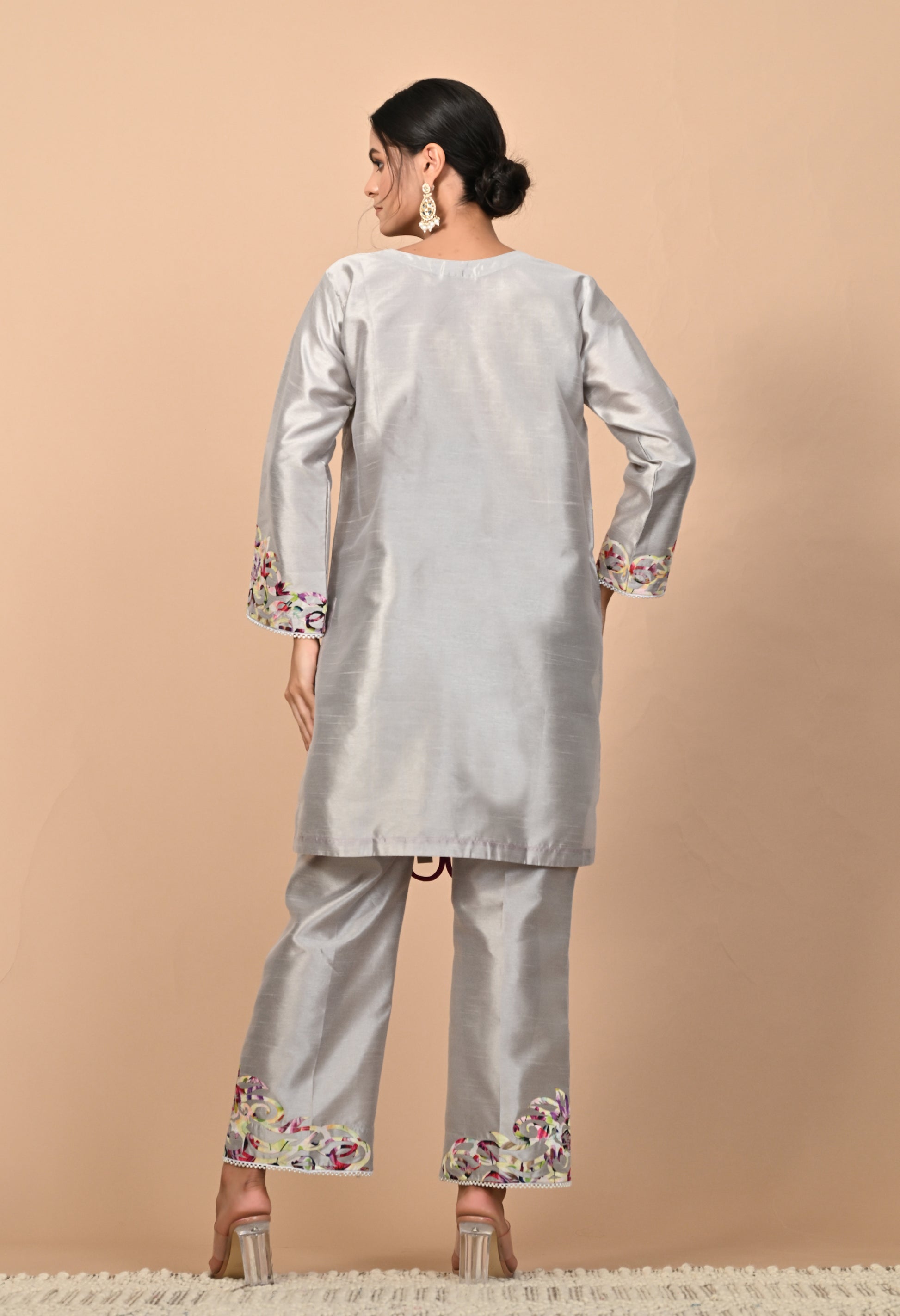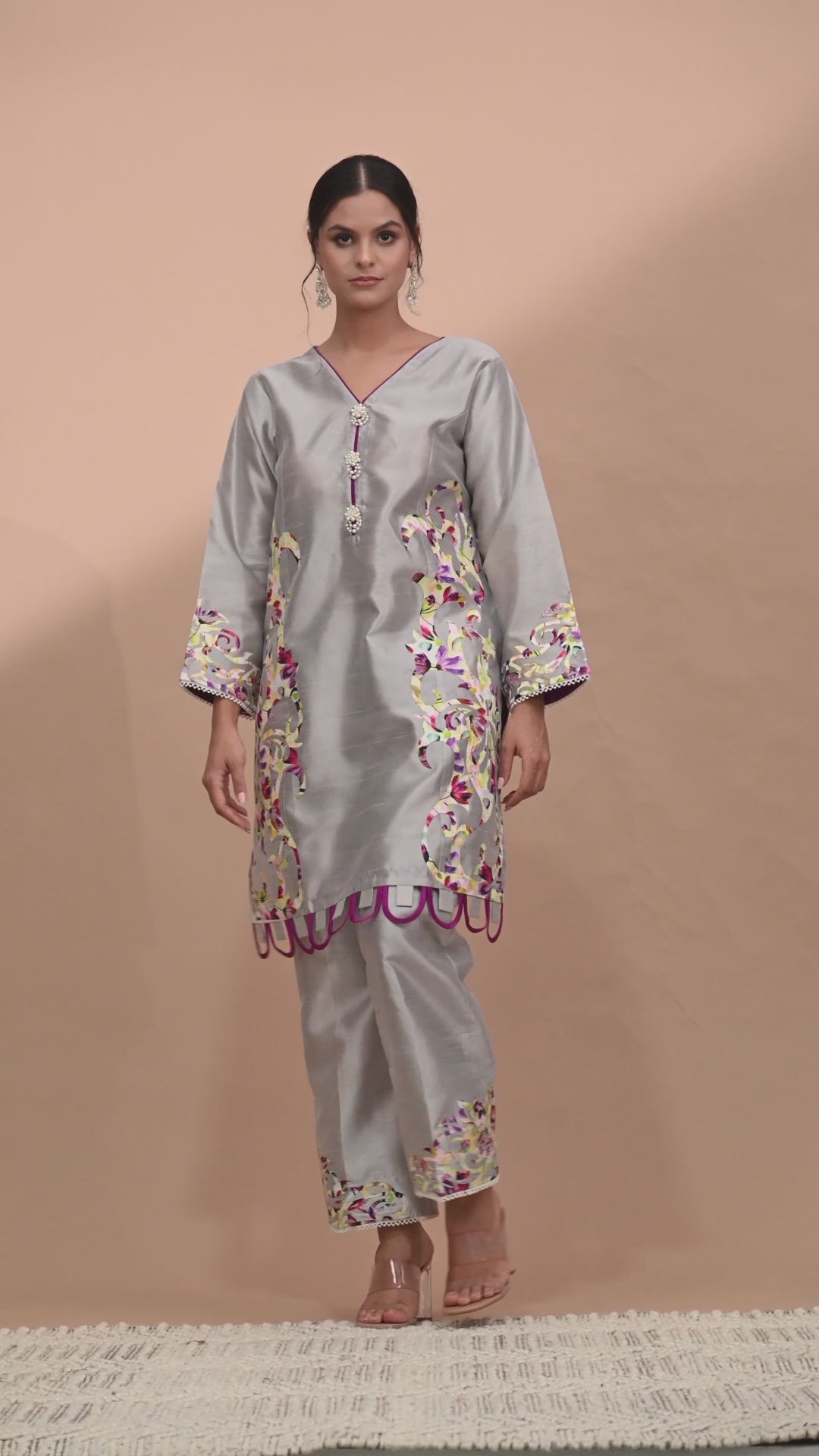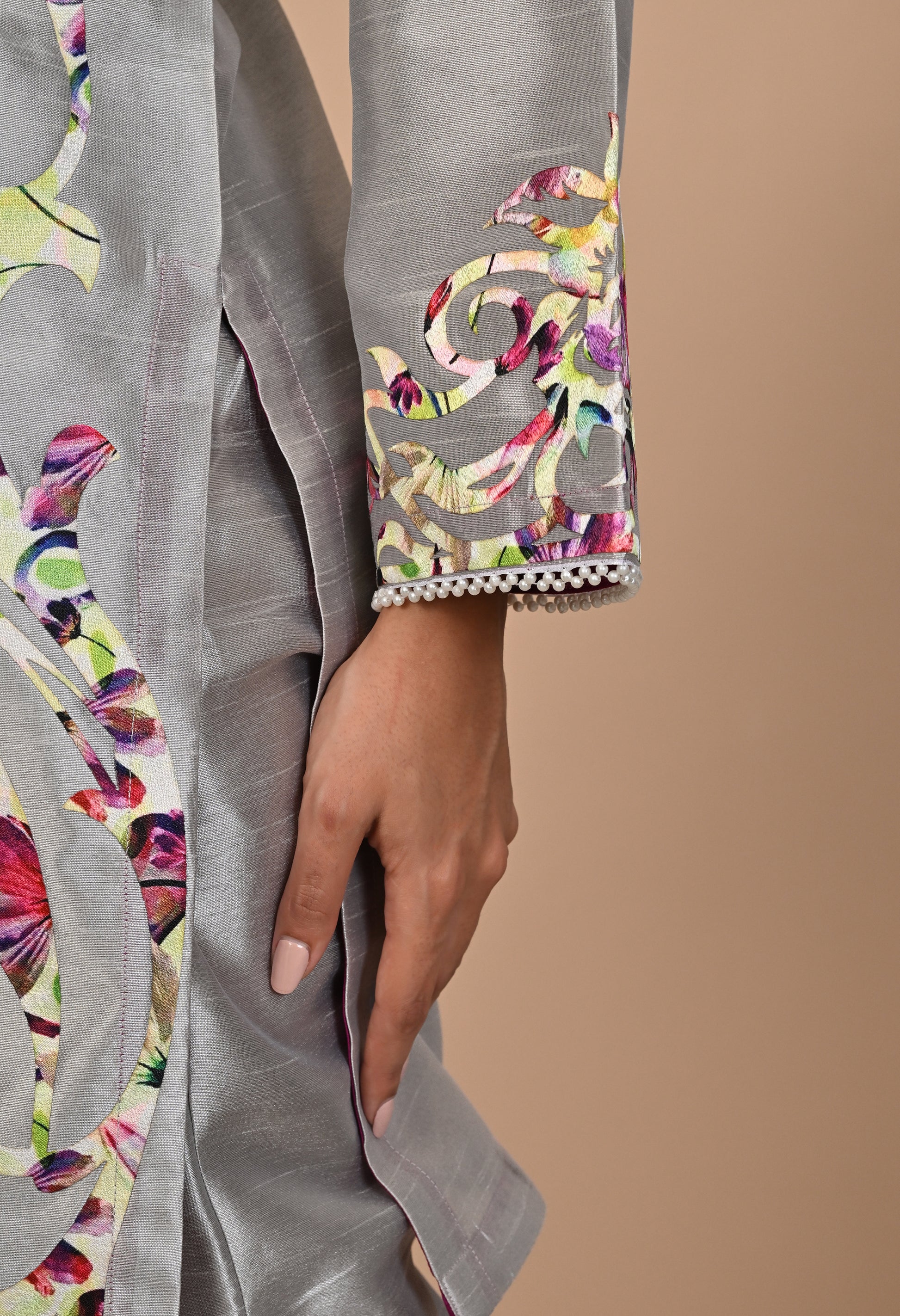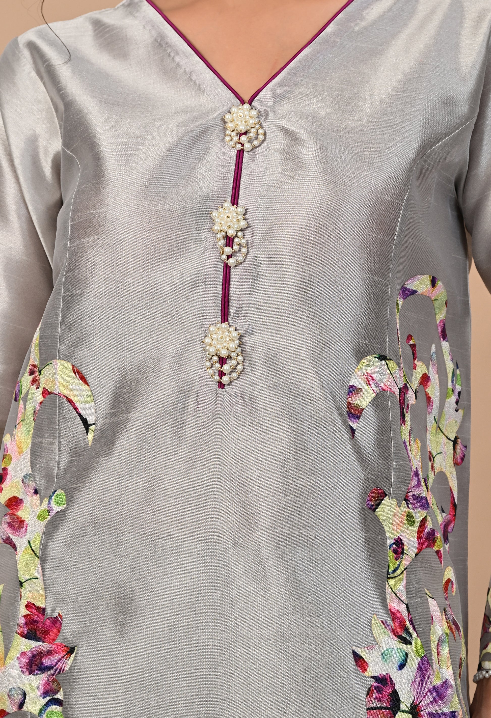 Sophisticated Grey Silk Kurta Set with Appliqué Work