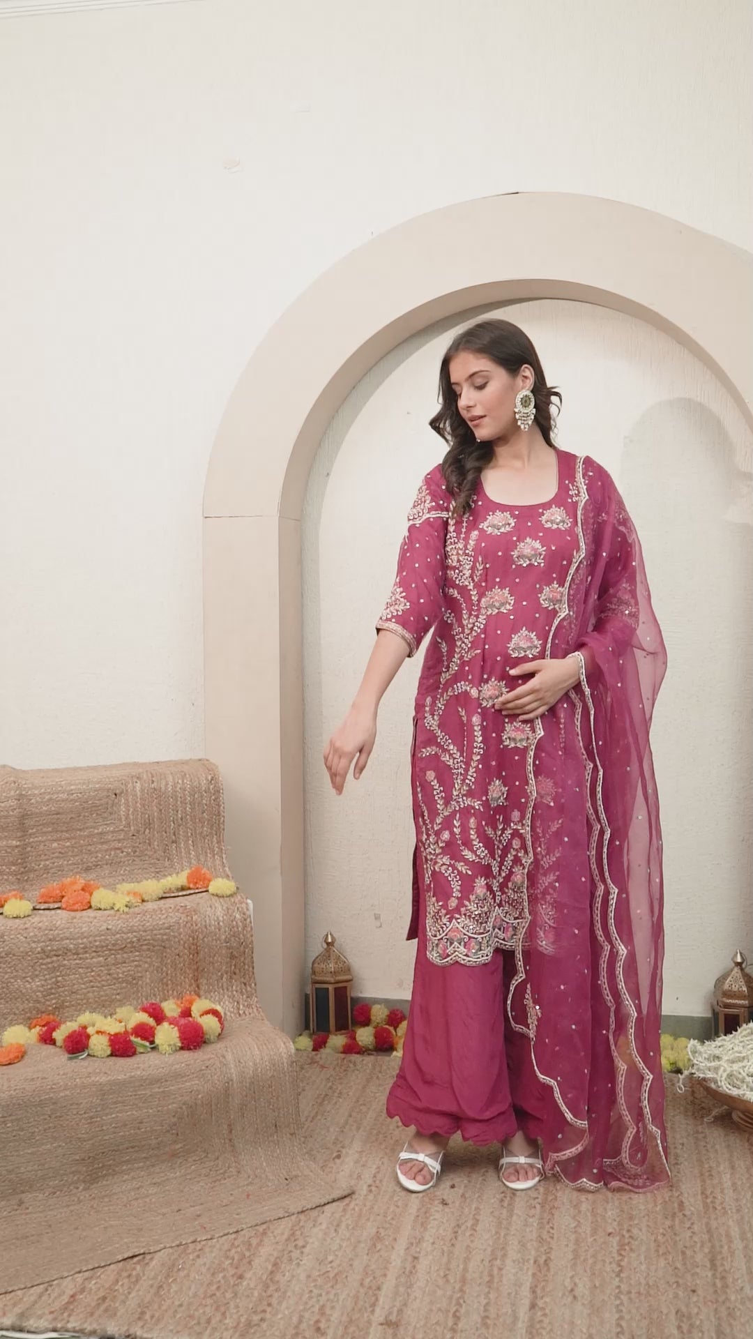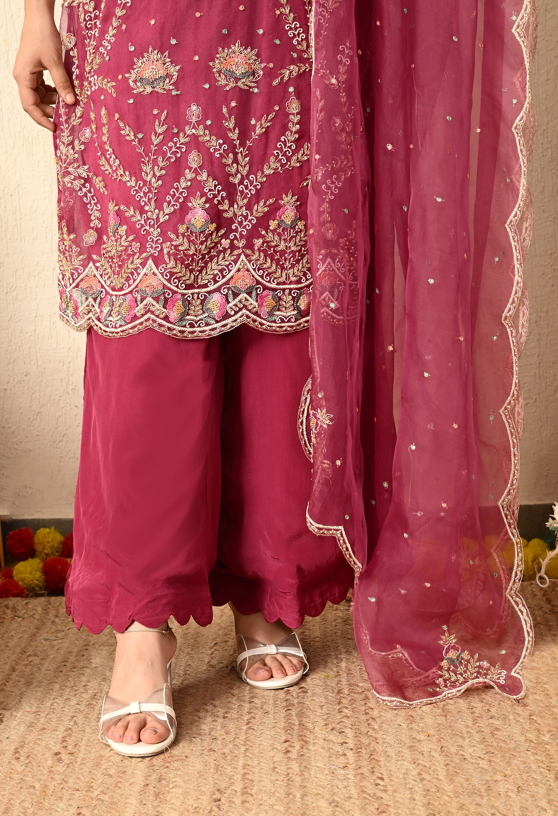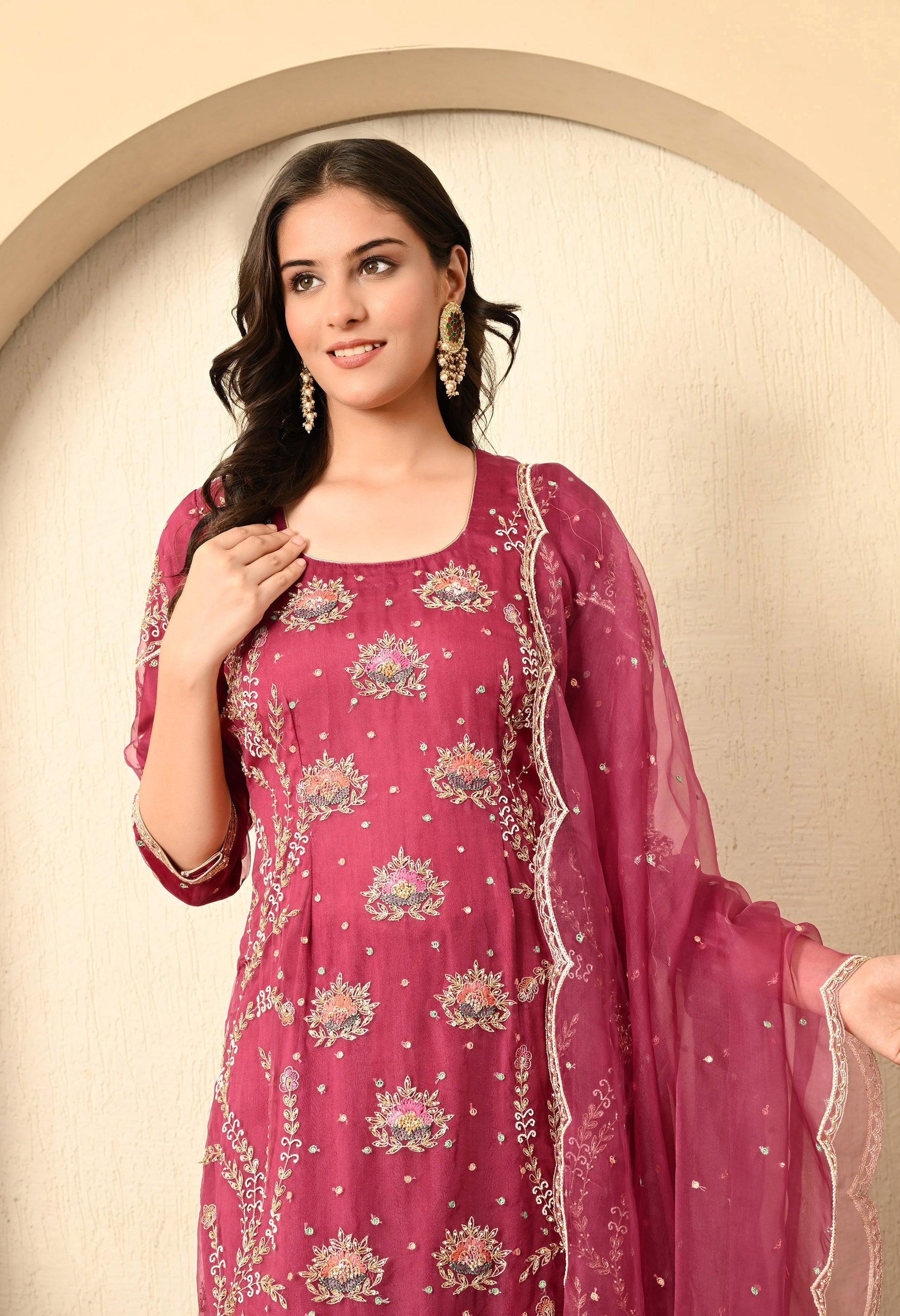 Capture the essence of royalty with our strawberry pink kurta set, crafted from organza kurta, paired with straight crepe round cut plazzo and a breezy organza dupatta. Zardozi, Thread, Sequence, and Pearl, intricate embroidery highlight the ensemble’s elegance and refinement.