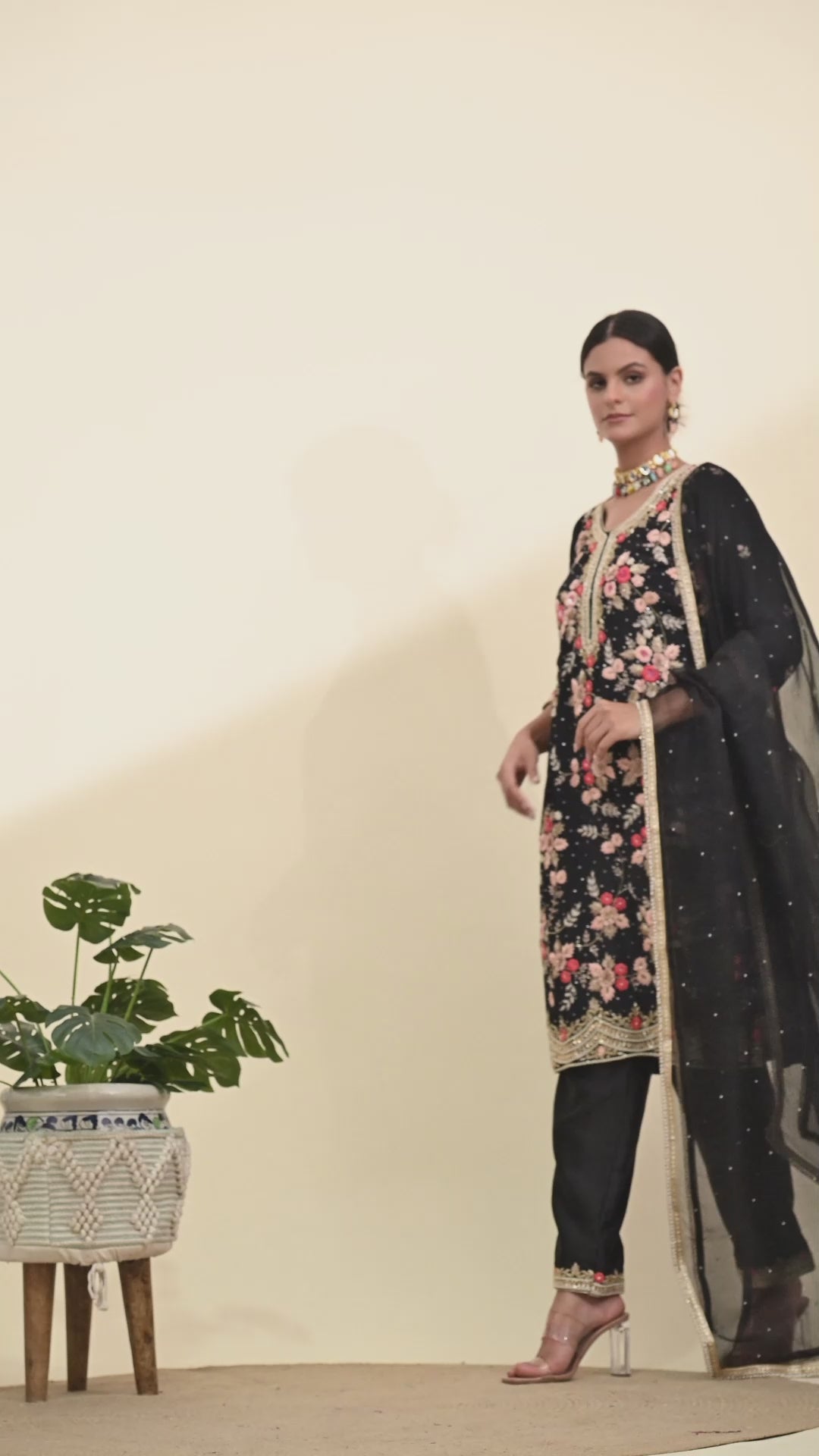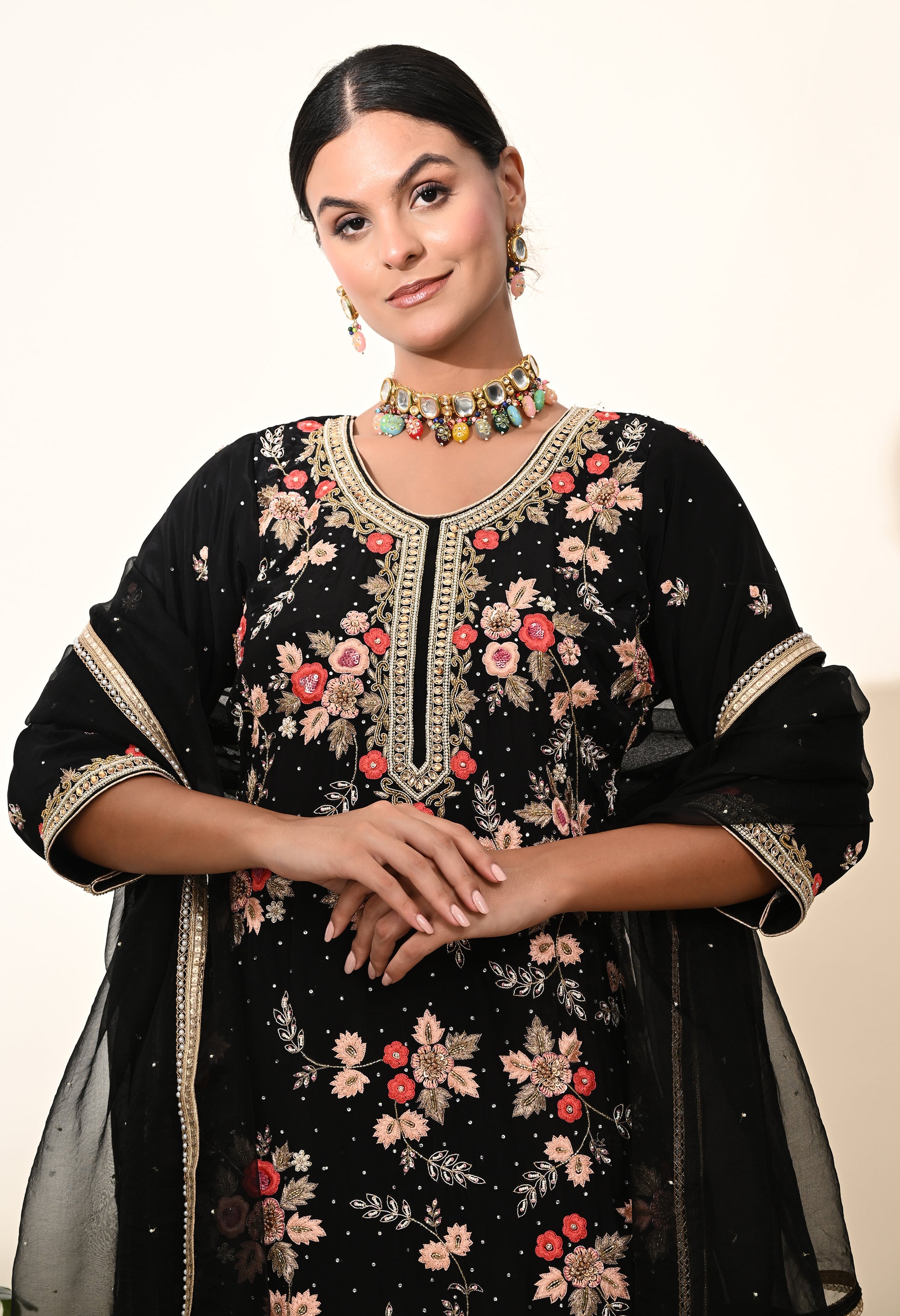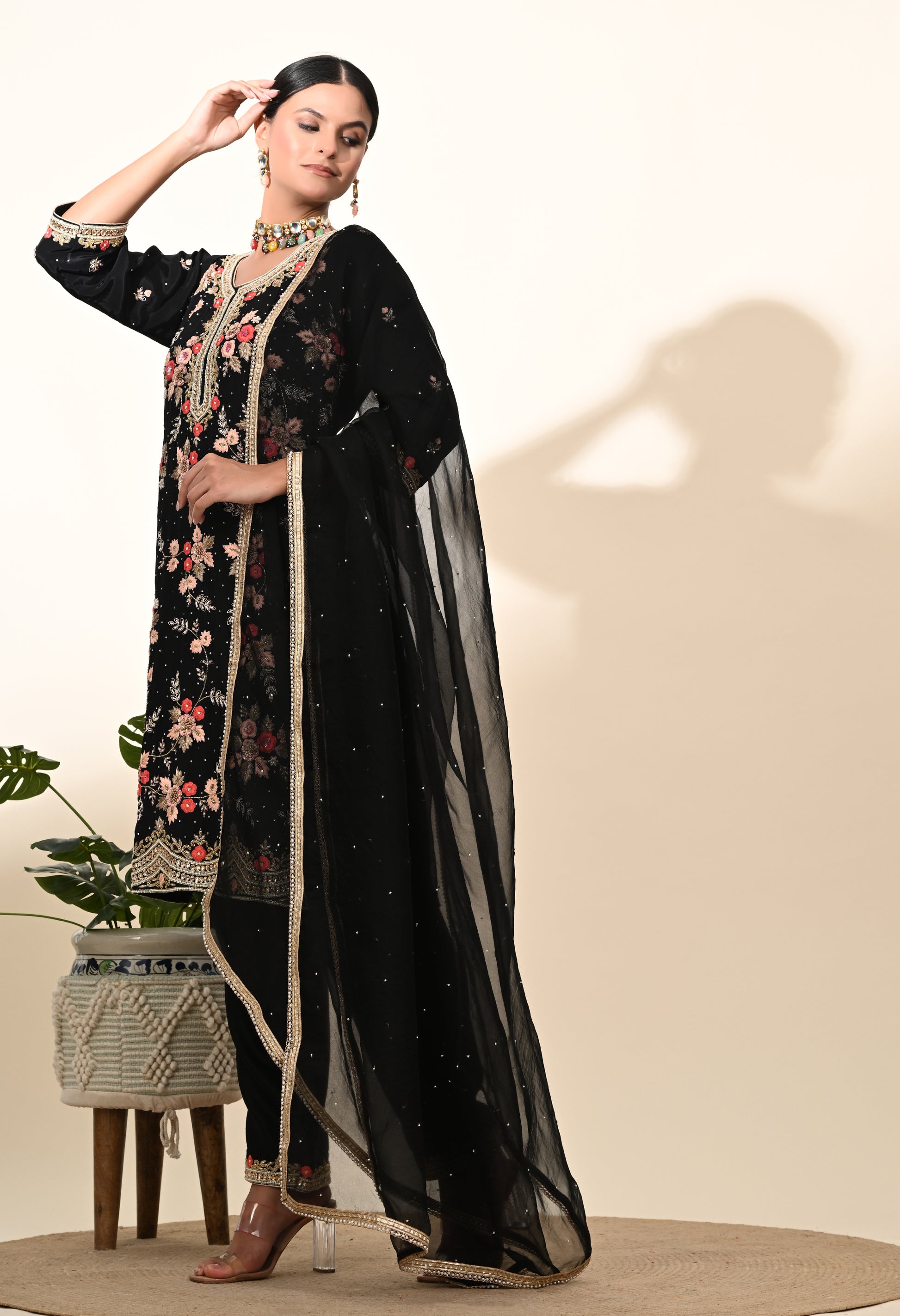 Wrap yourself in the charm and beauty of our tastefully embroidered Kurta Set. Made from high-quality crepe fabric, the kurta features exquisite zardozi, thread, and crystal embroidery in a vibrant shade of black. Paired with an artfully embellished organza dupatta and coordinating chanderi bottom, this set highlights your refined style and graceful presence.