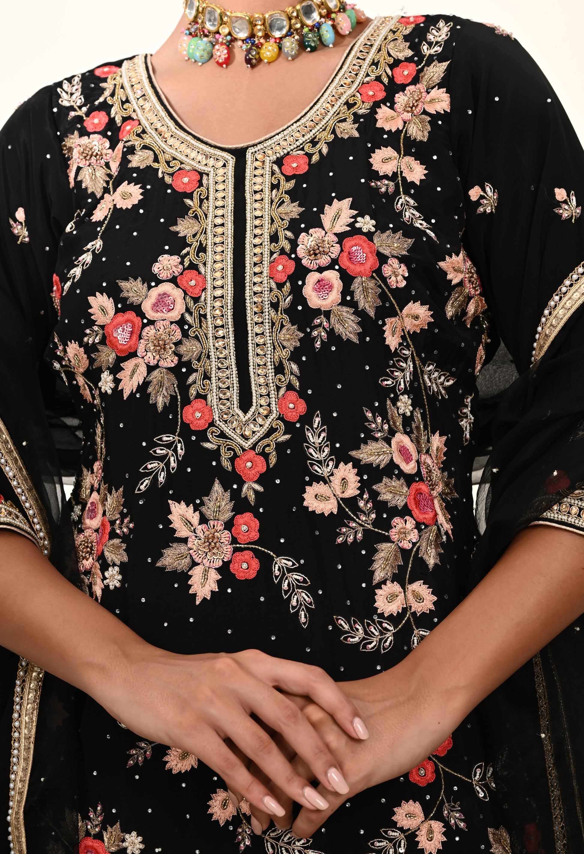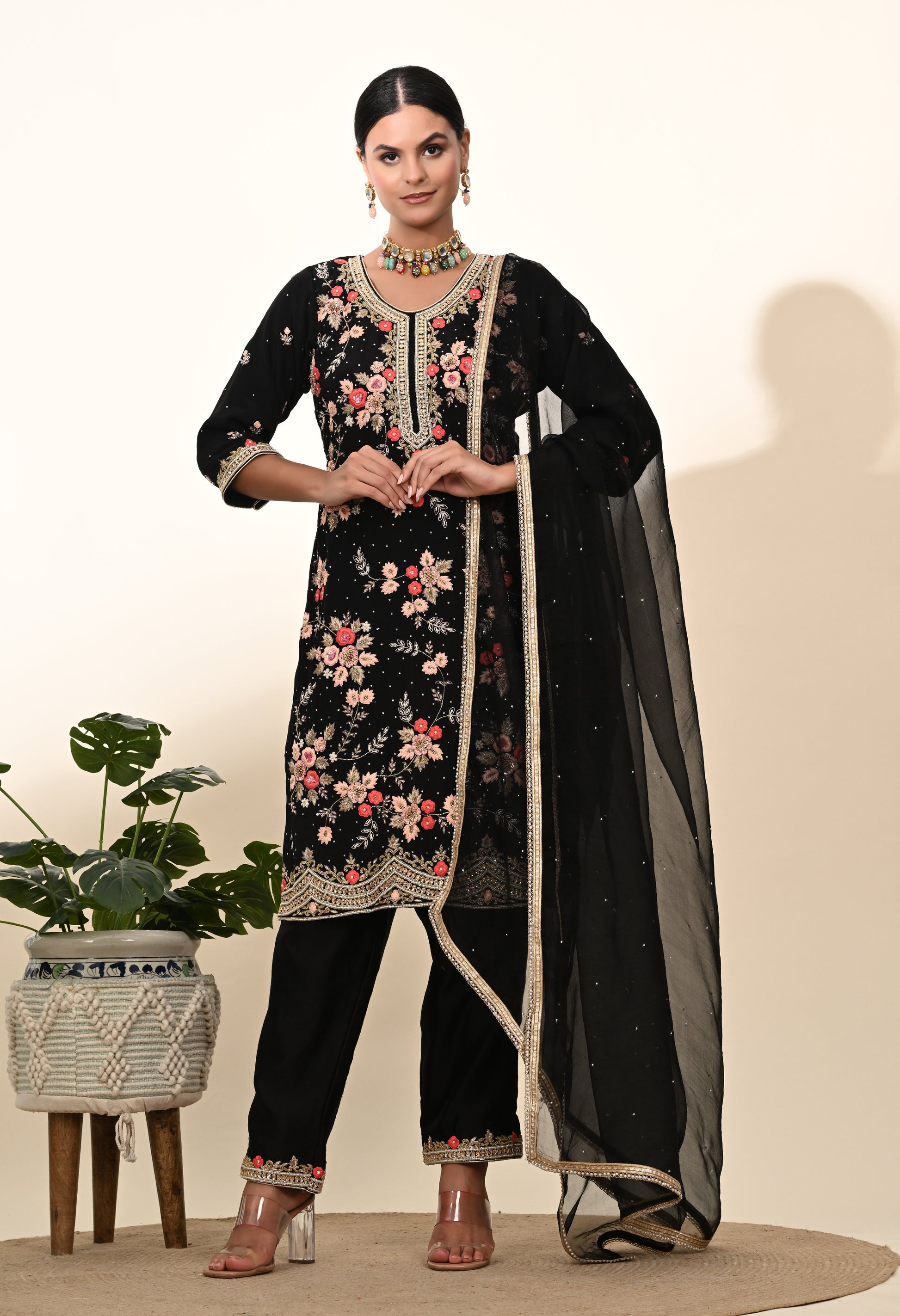 - Beautiful Floral Thread work along with Crystal work on shirt, pant, and dupatta