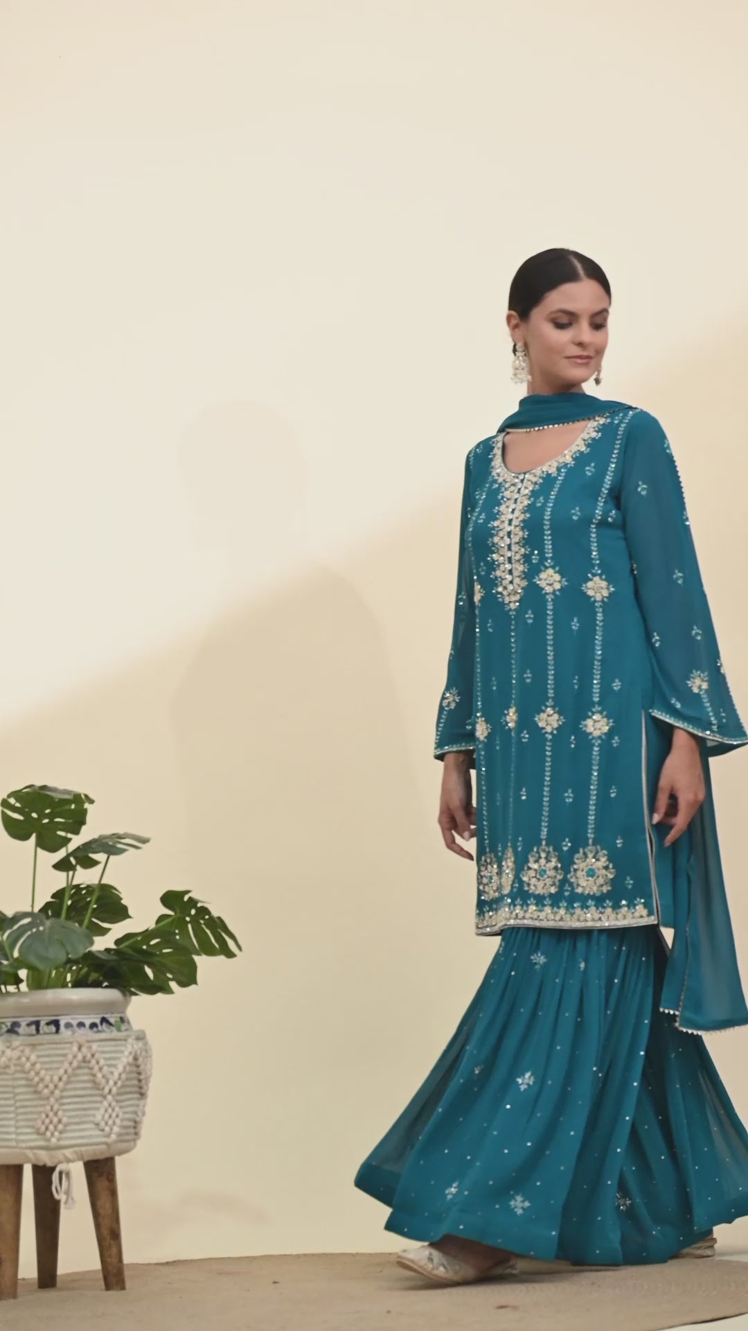 Striking Firozi Blue Georgette Gharara Set with Thread and Crystal Embroidery