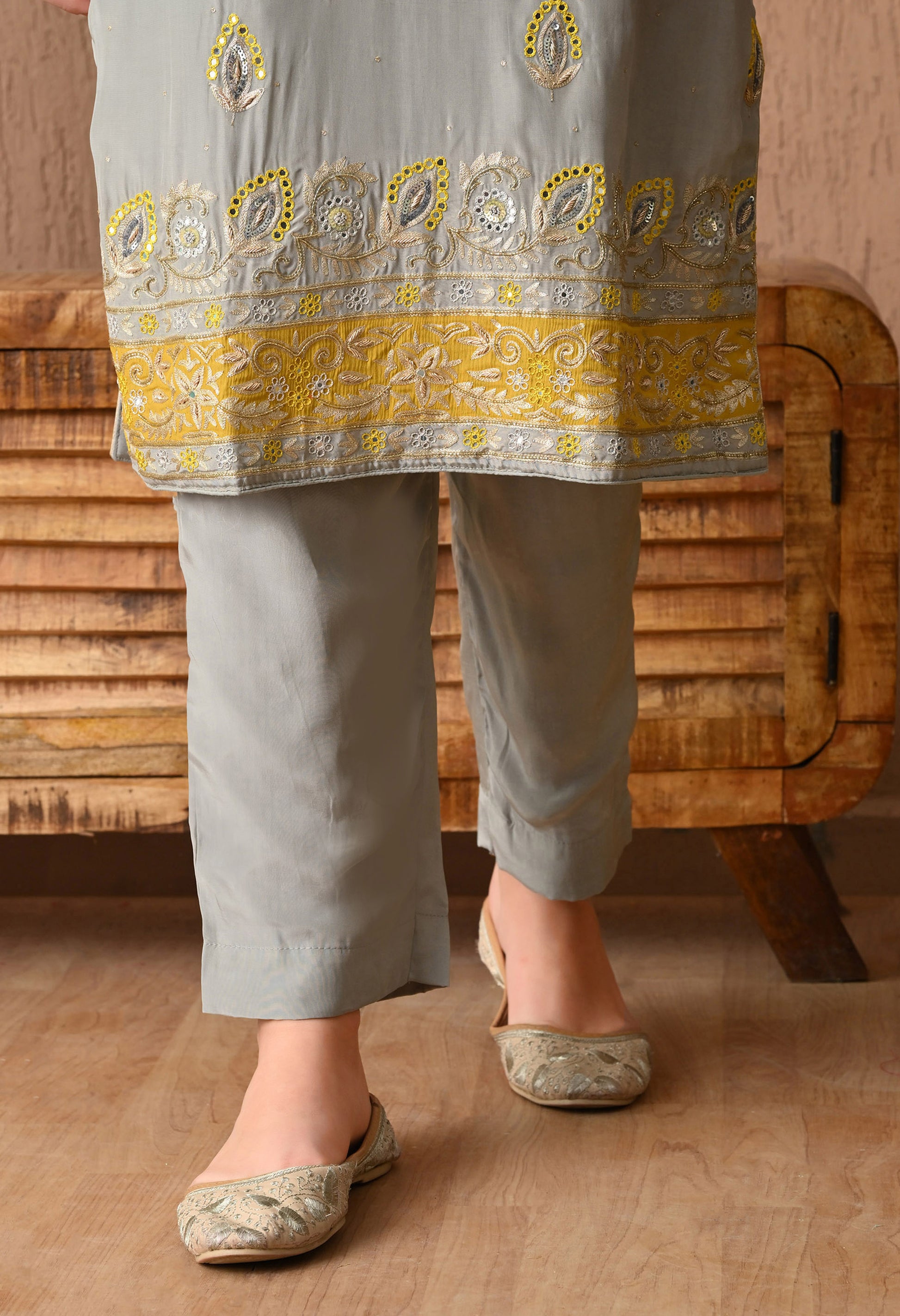 Make your festive wardrobe elegant with this beautiful light grey ensemble. Featuring a crepe kurta and straight pants adorned with intricate zardozi, thread, sequin, and applique embroidery, paired with an organza dupatta. Perfect to add a charm to your personality.