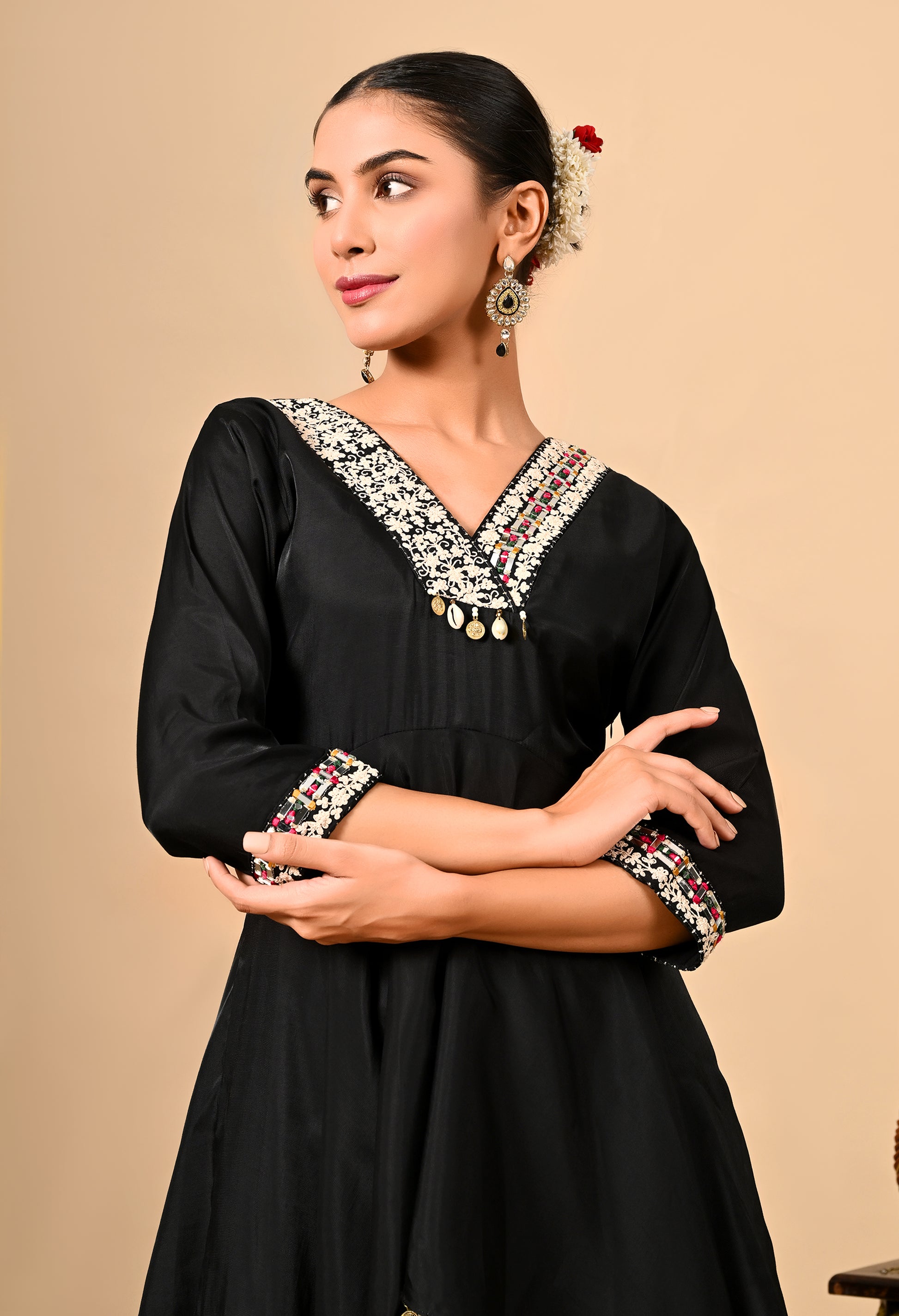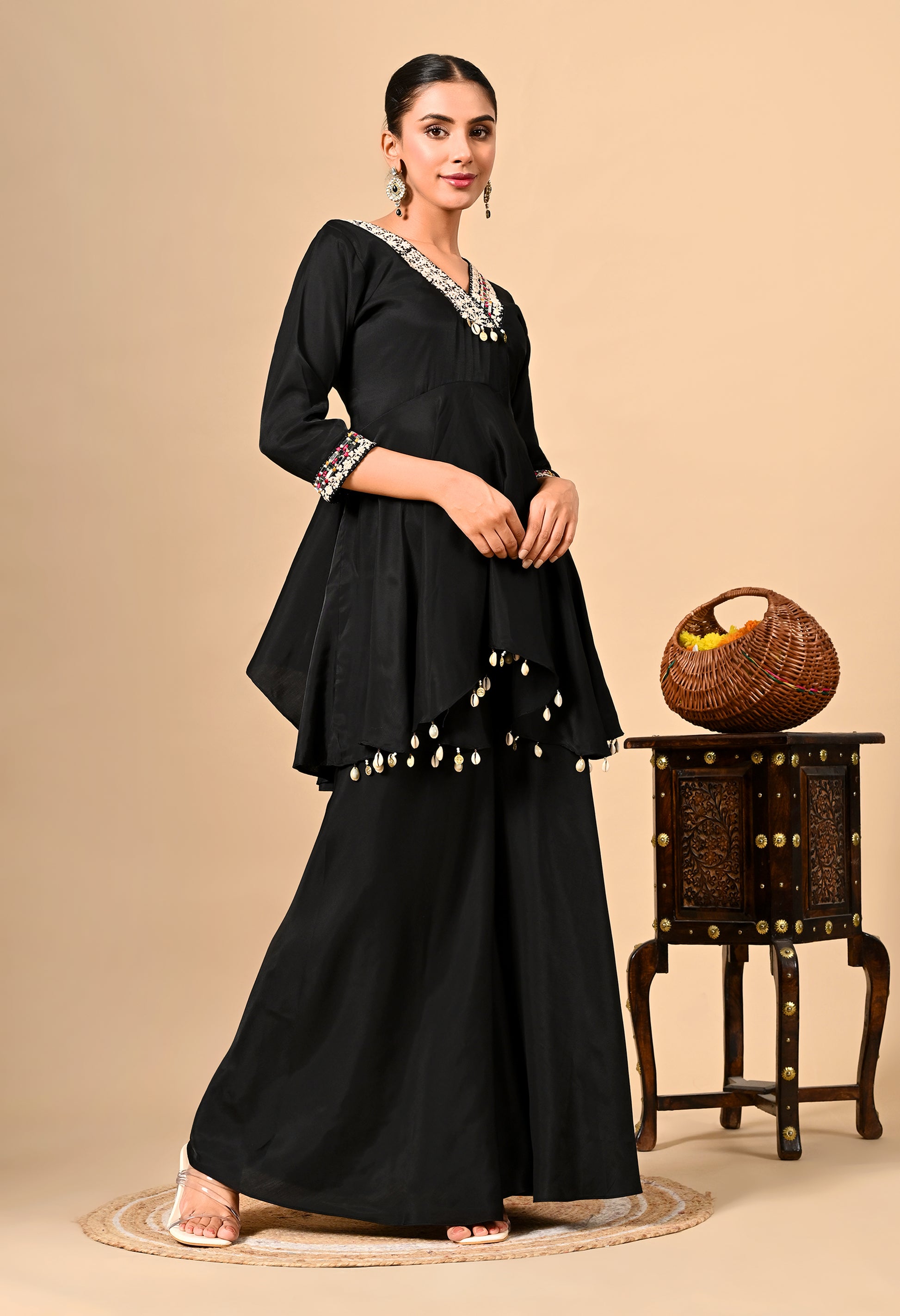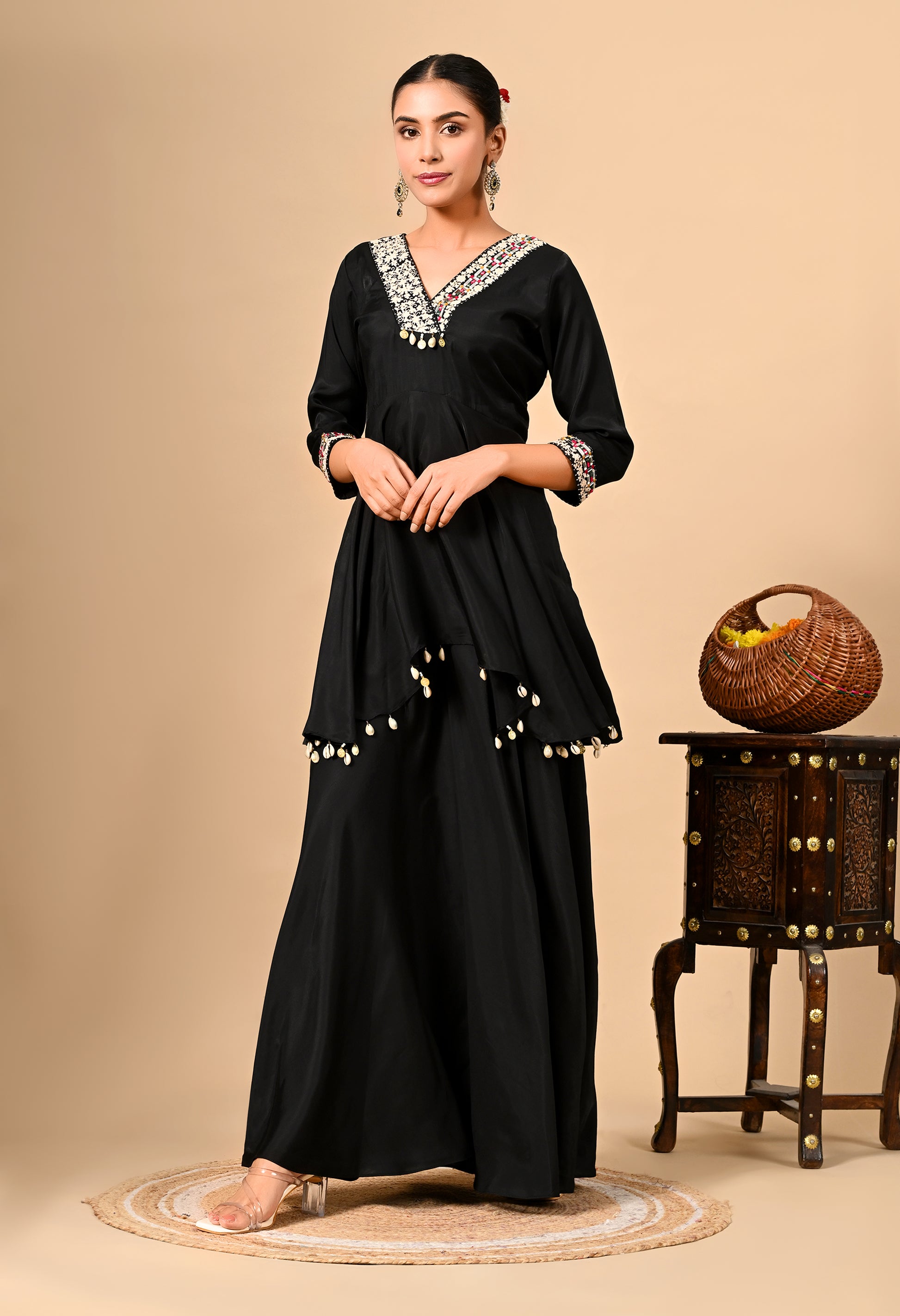 Stylish Black Co-Ord Set with Thread Work on Umbrella Flared Top & Bottom