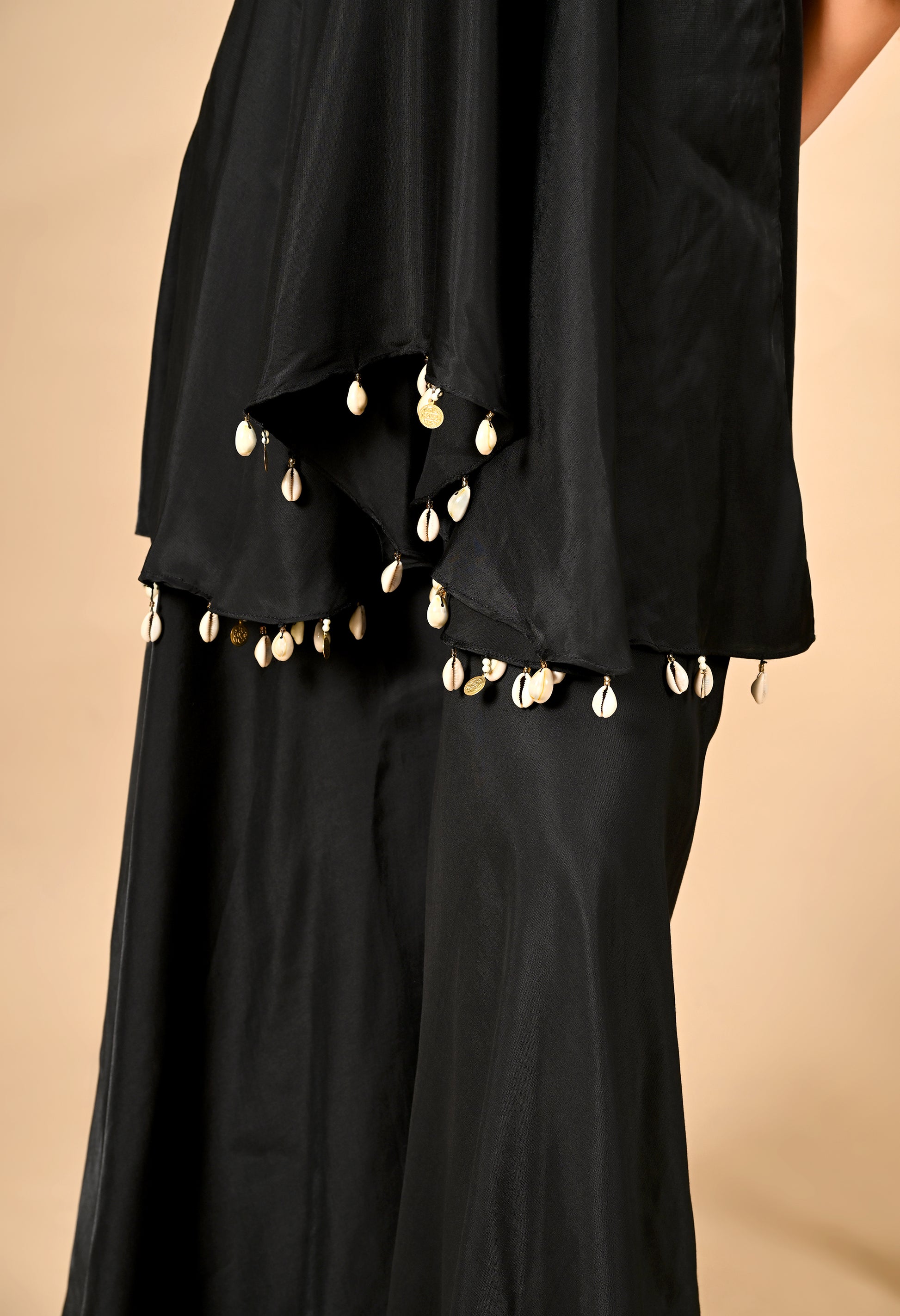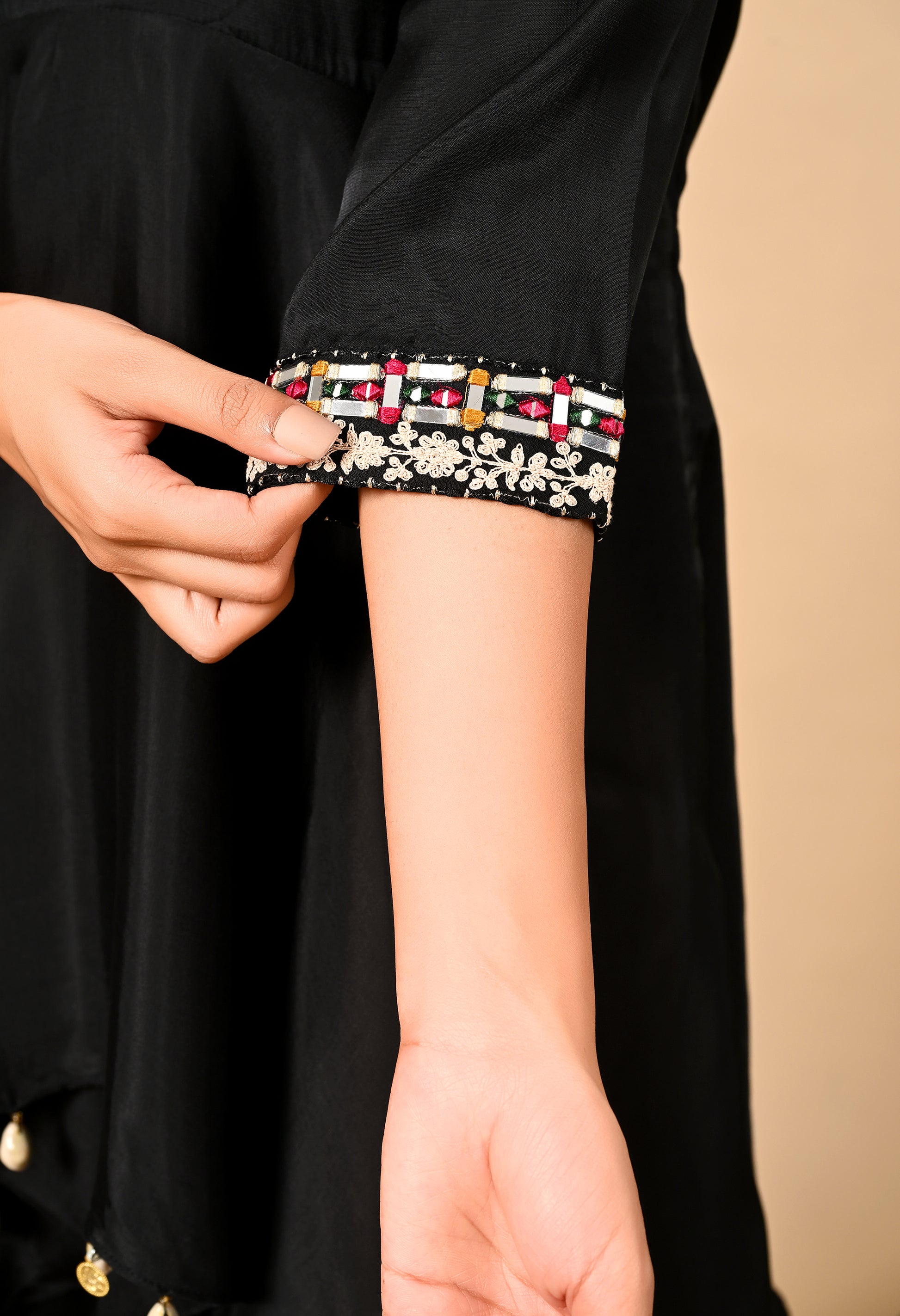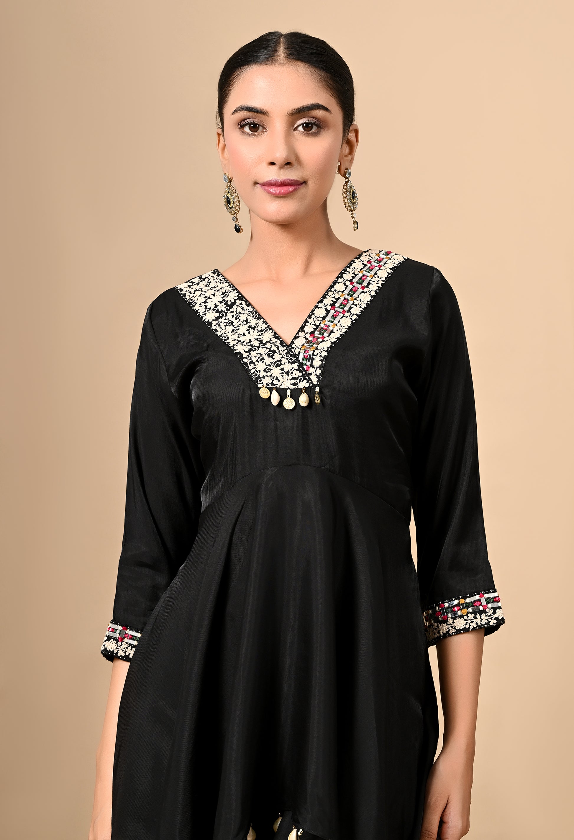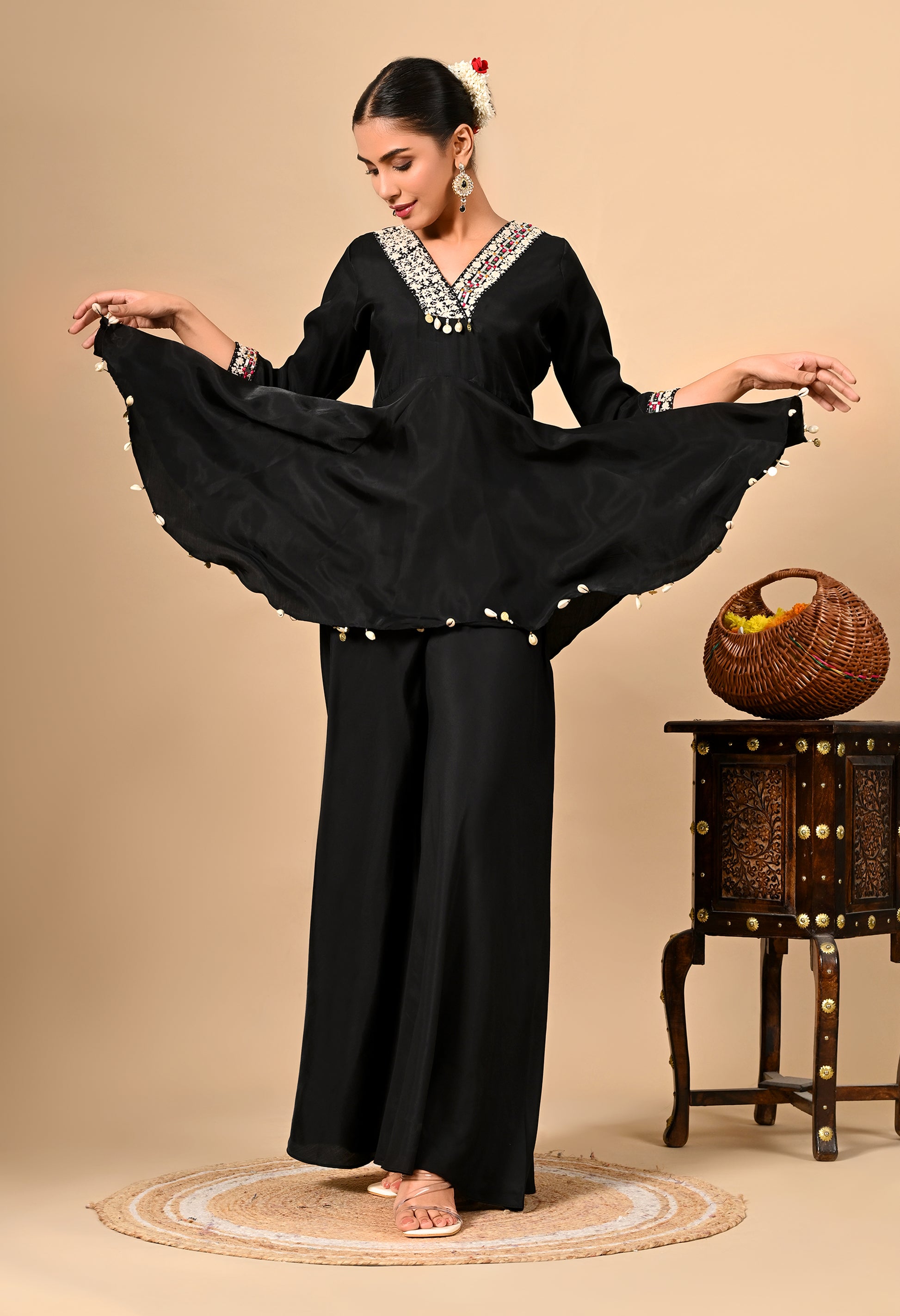 Stylish Black Co-Ord Set with Thread Work on Umbrella Flared Top & Bottom