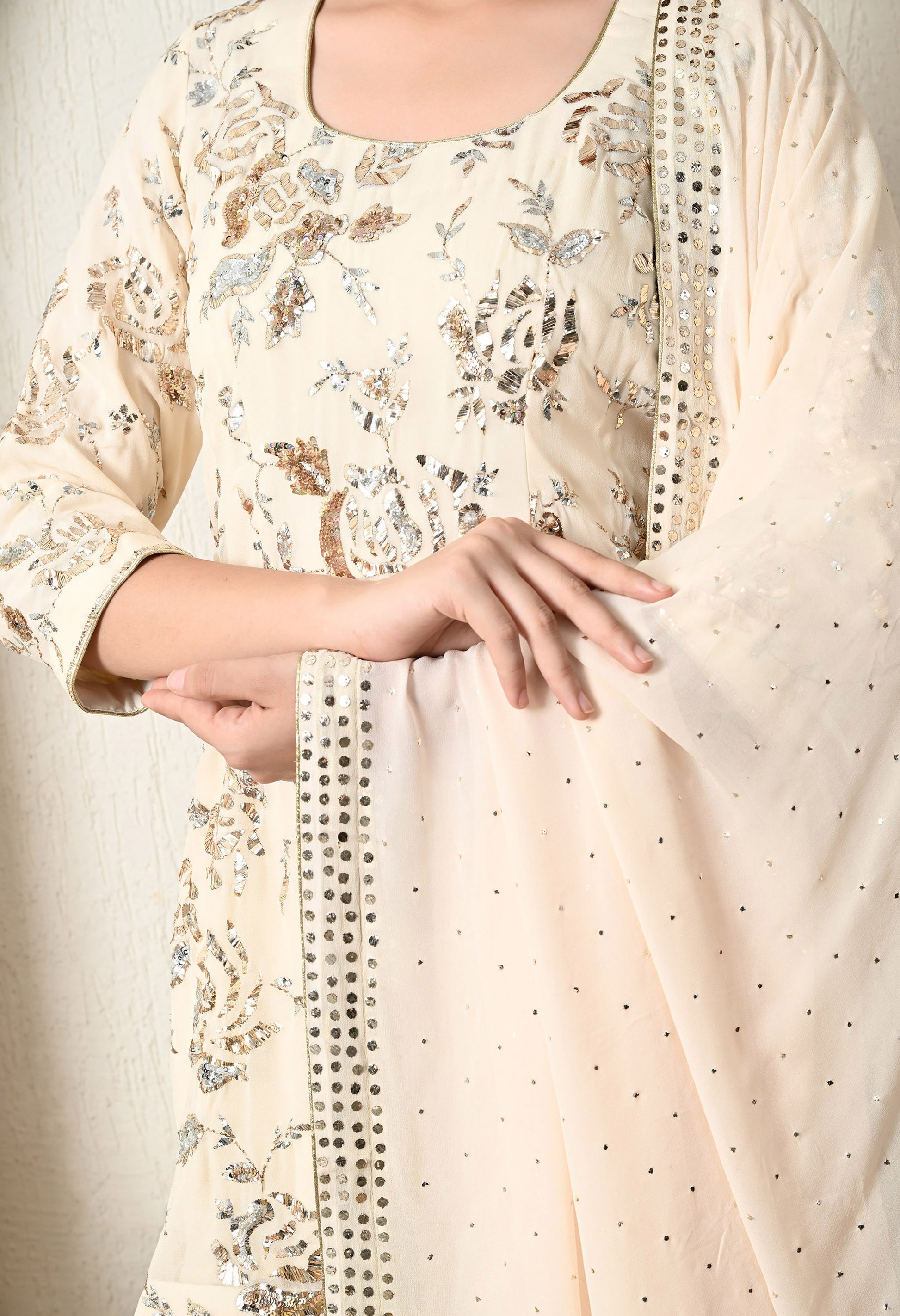 Embrace elegance with our hand-embroidered cream georgette Gharara set, featuring a dupatta and Gharara. Adorned with intricate mukaish and sequence work, the kurta showcases beautiful floral embroidery on the front, back, and sleeves, complemented by tassels on the back. Perfect to add glam to any occasion.