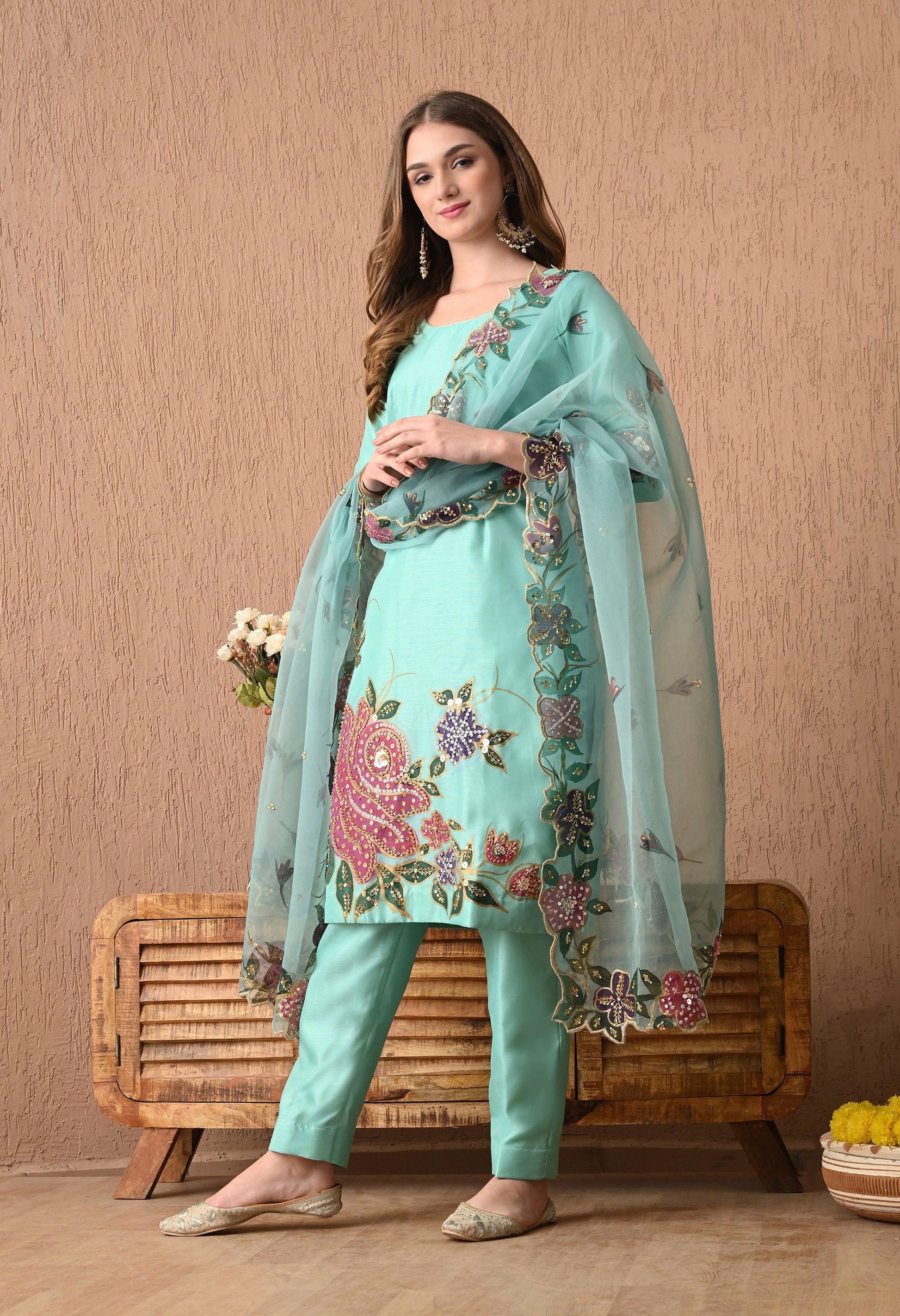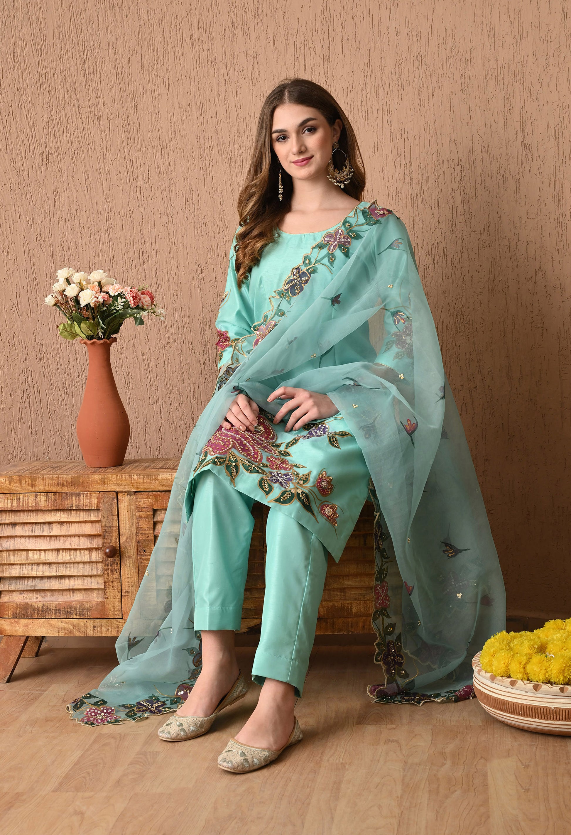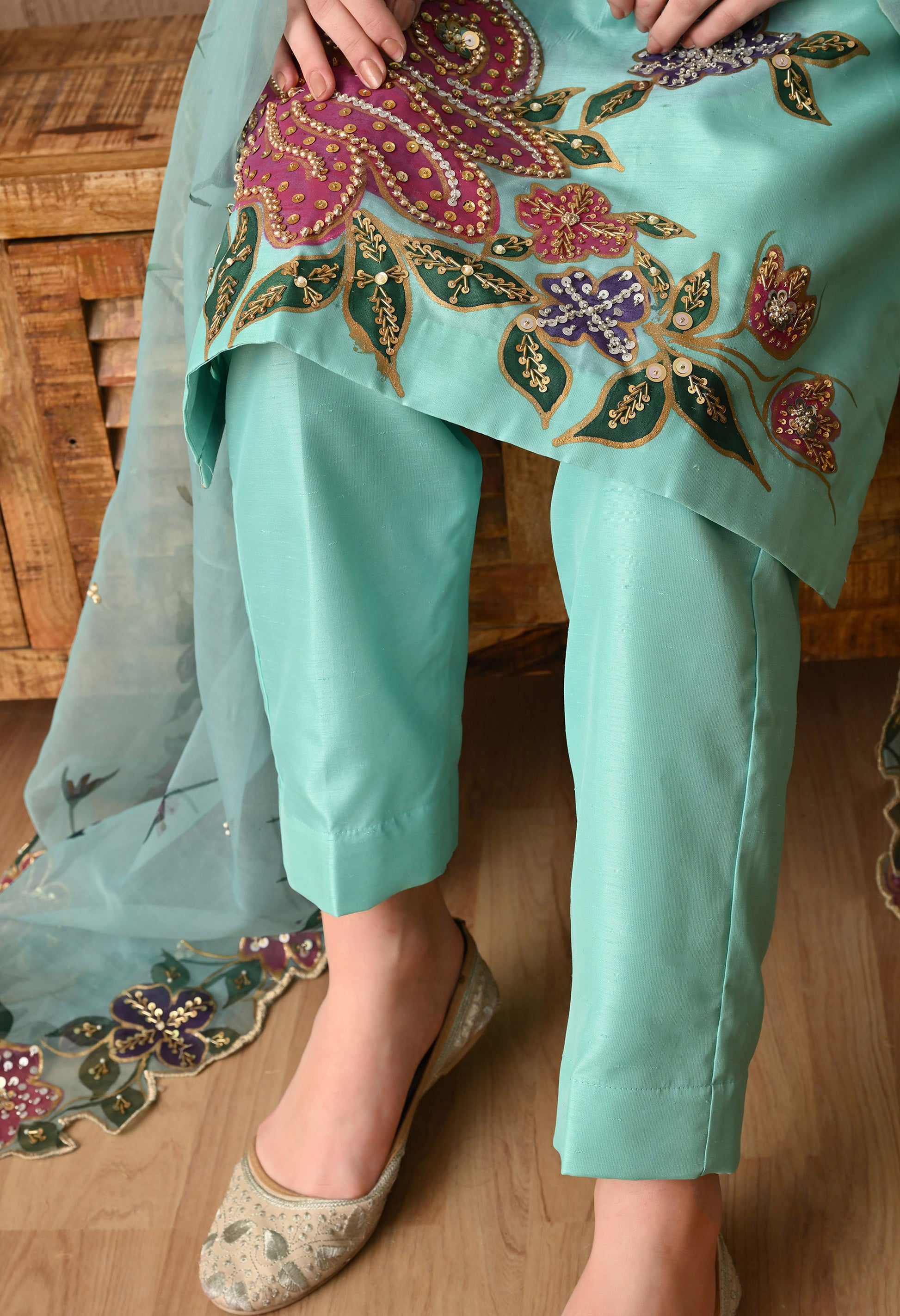 Discover timeless elegance with our beautifully designed three-piece Kurta set. The kurta, made of opulent silk fabric, shines in an exquisite turquoise green hue, enhanced by hand paint, zari, and pearl work. Complemented by delicate organza dupatta and silk bottom, it exudes refined grace. A perfect fit for every occasion.