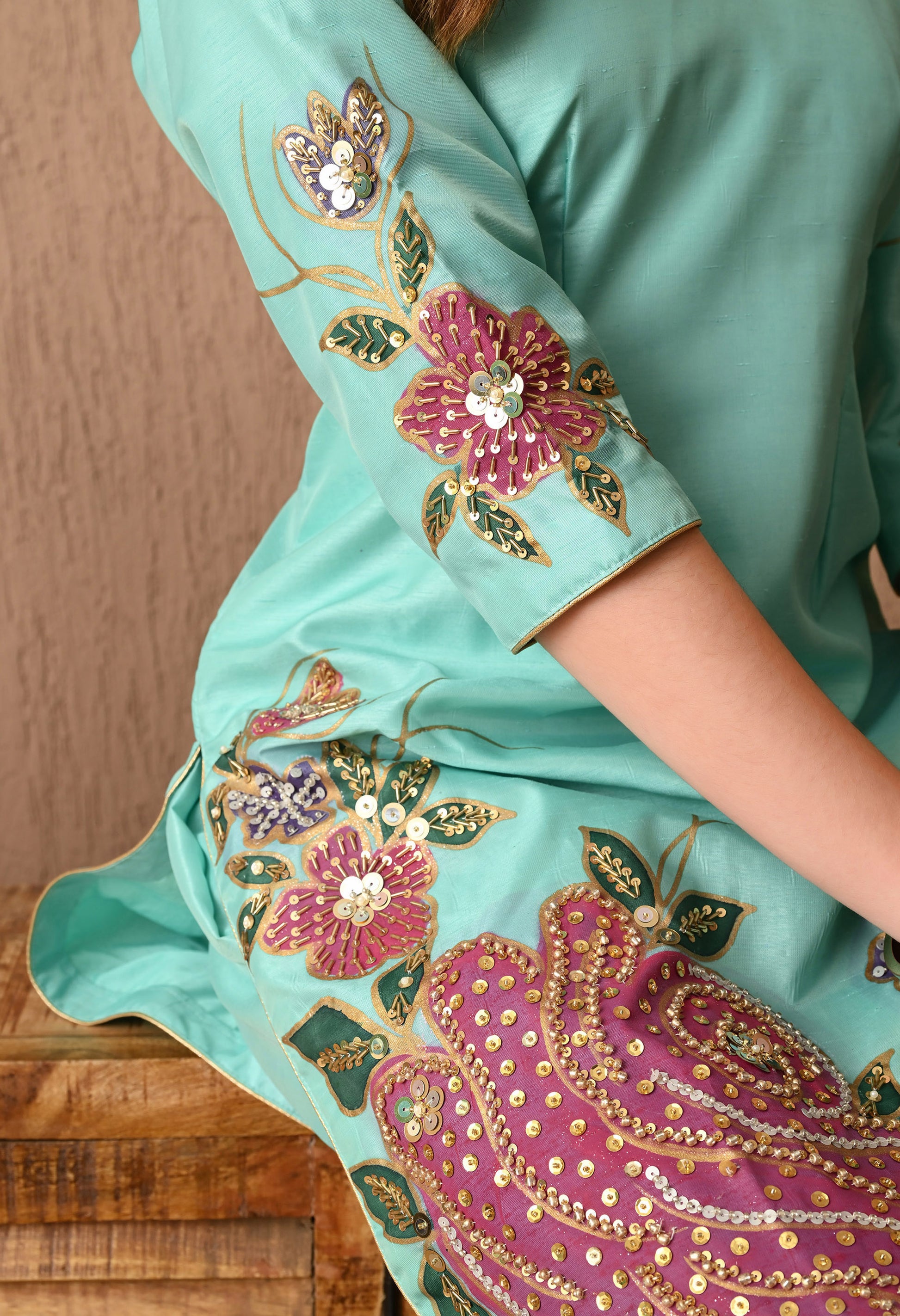 Turquoise Green Silk Kurta Set with Intricate Embroidery and Hand-Painted Detailing