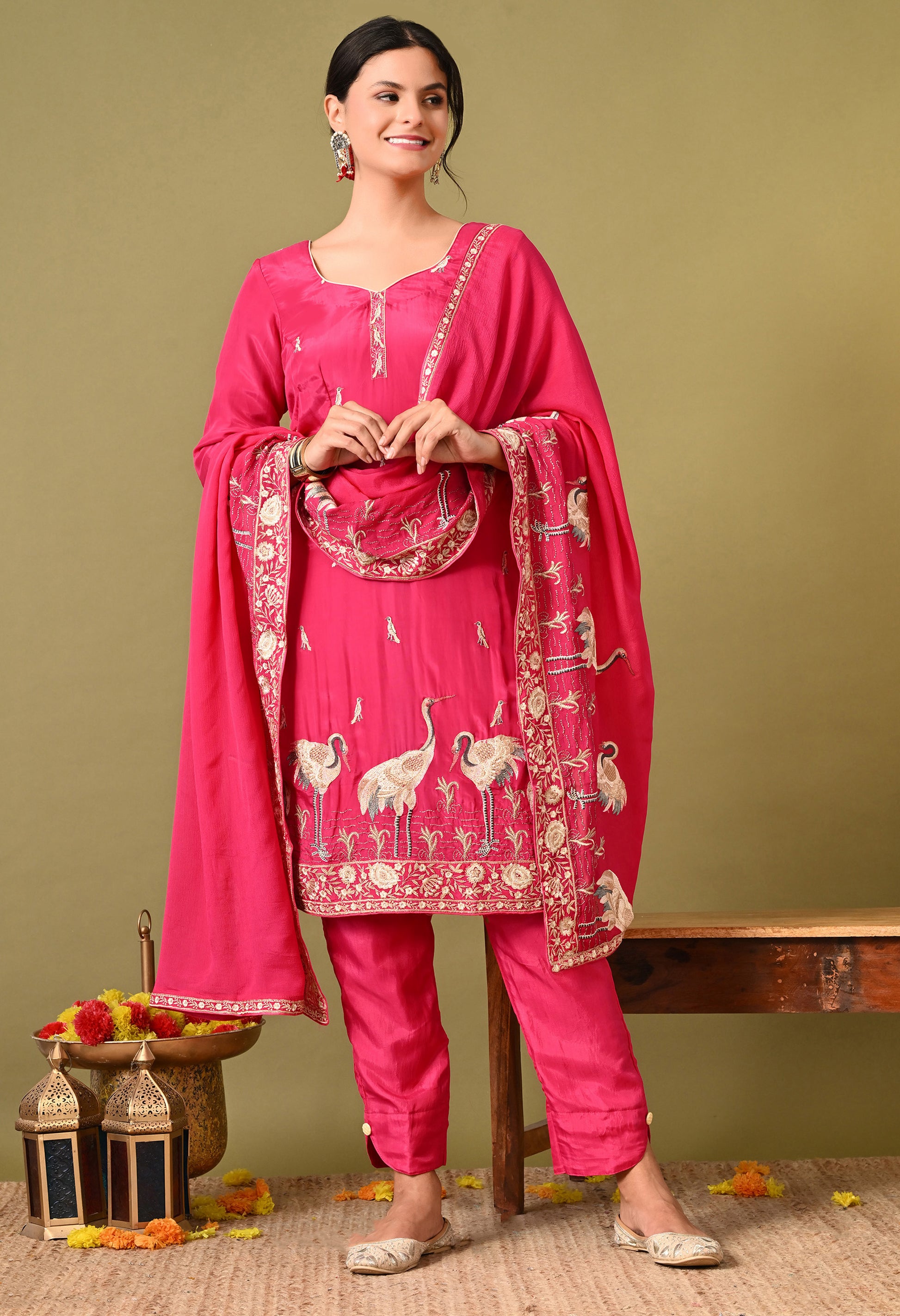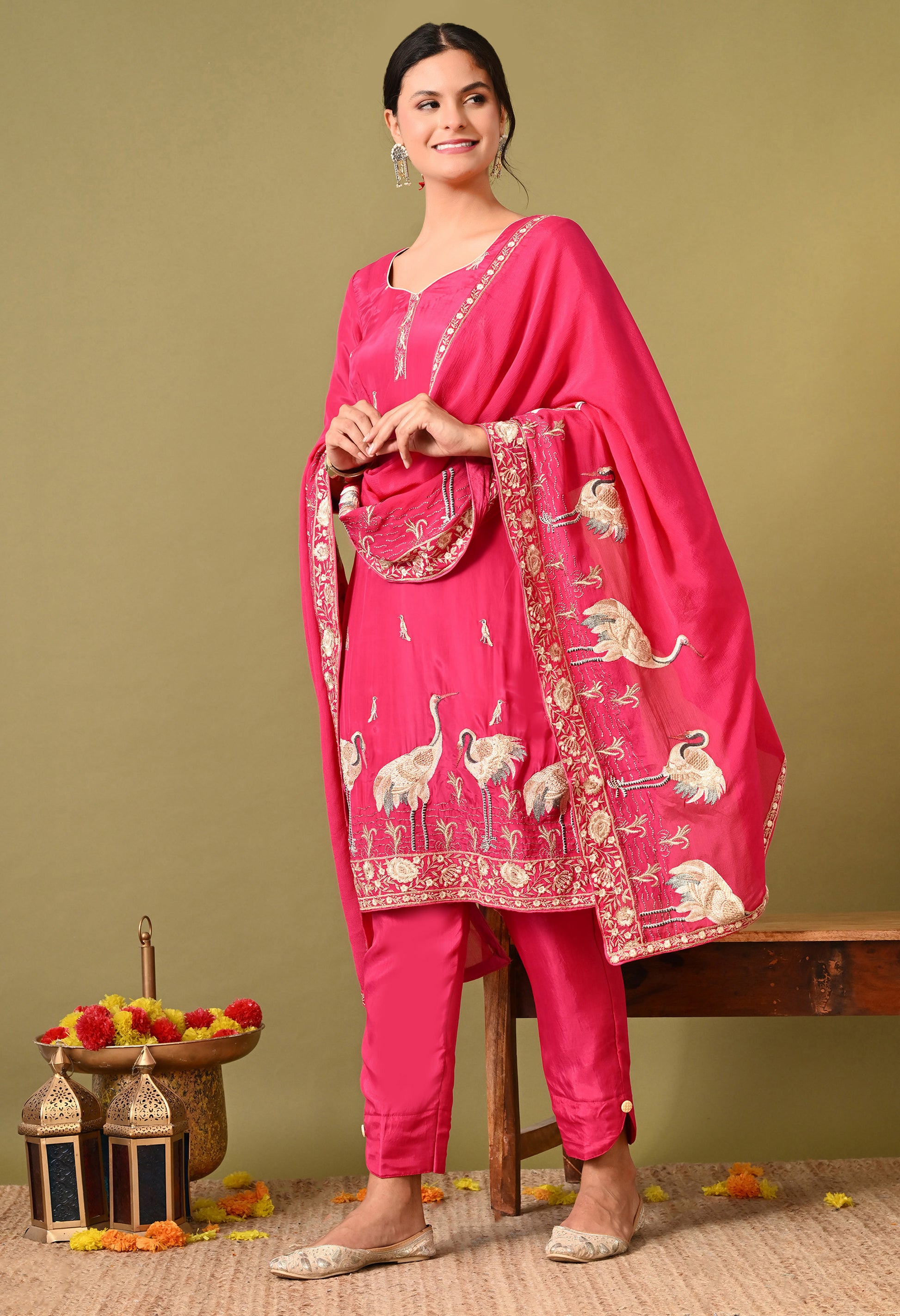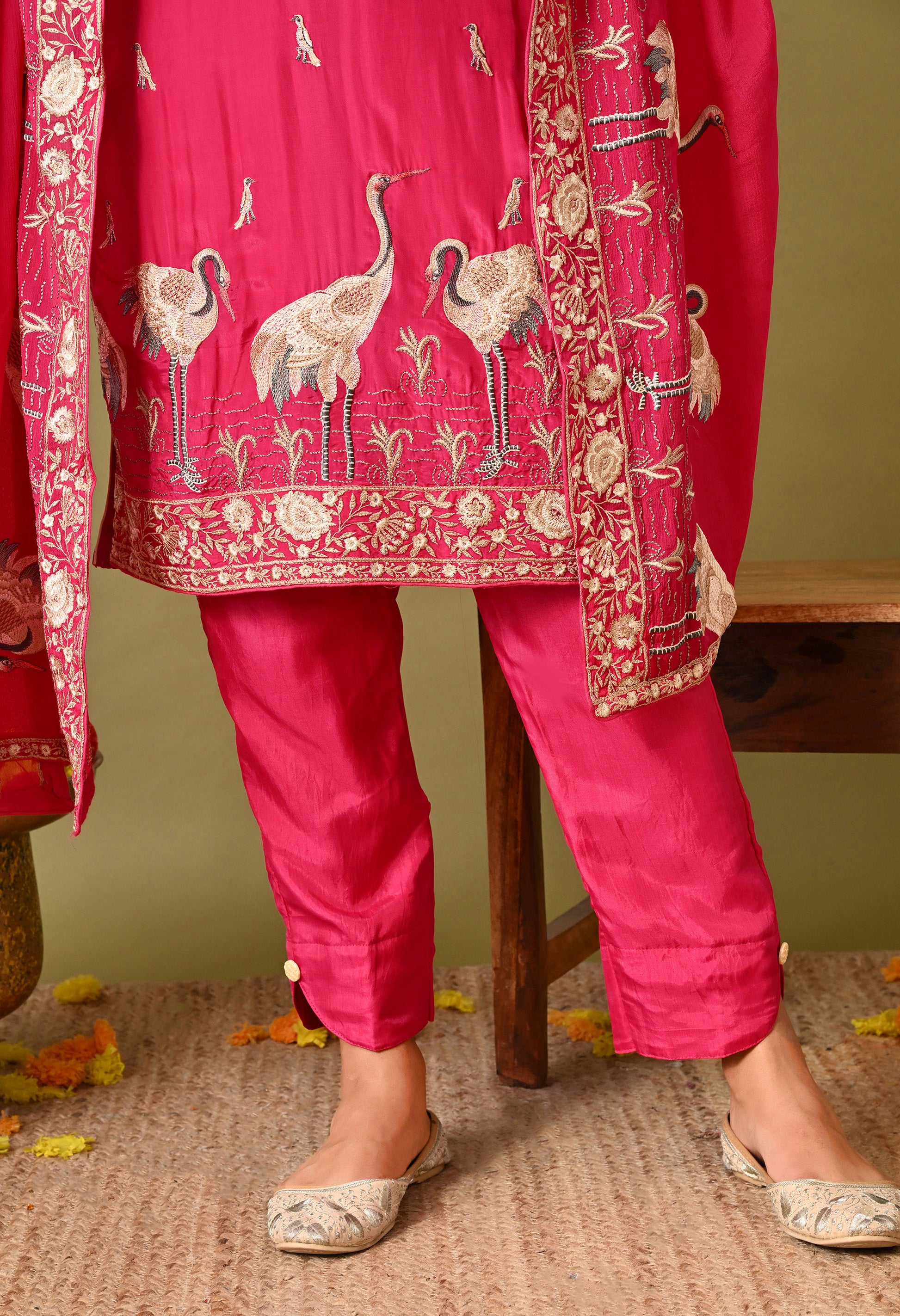 Add a pop of vibrance with our reddish pink Kurta Set, featuring a featherlight chinon dupatta, a tastefully embroidered crepe kurta, and a structured crepe bottom. The exquisite detailing of parsi work makes it a wardrobe essential. Perfectly poised, perfectly you!