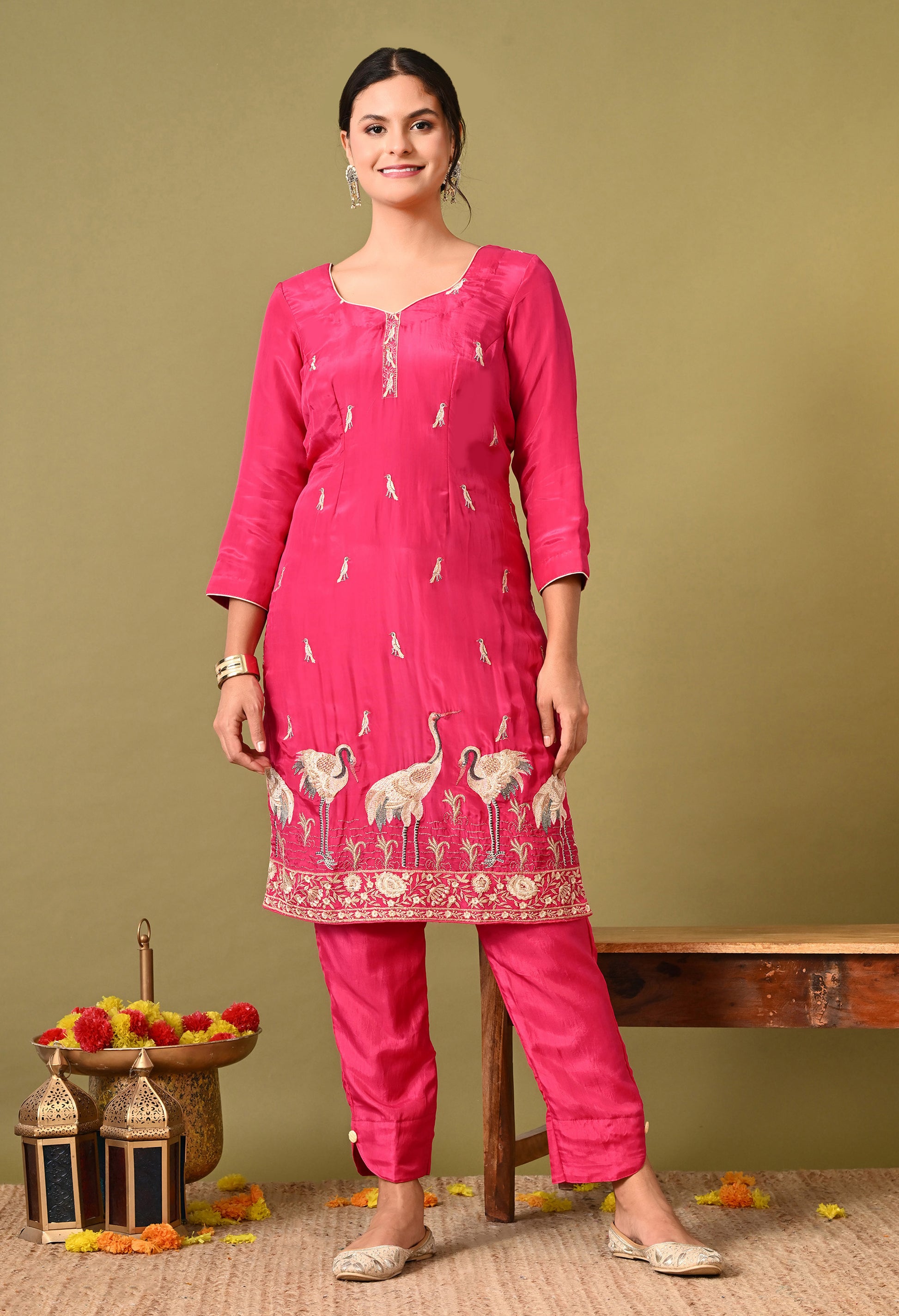 Vibrant and Graceful Reddish Pink Kurta Set with Parsi Work