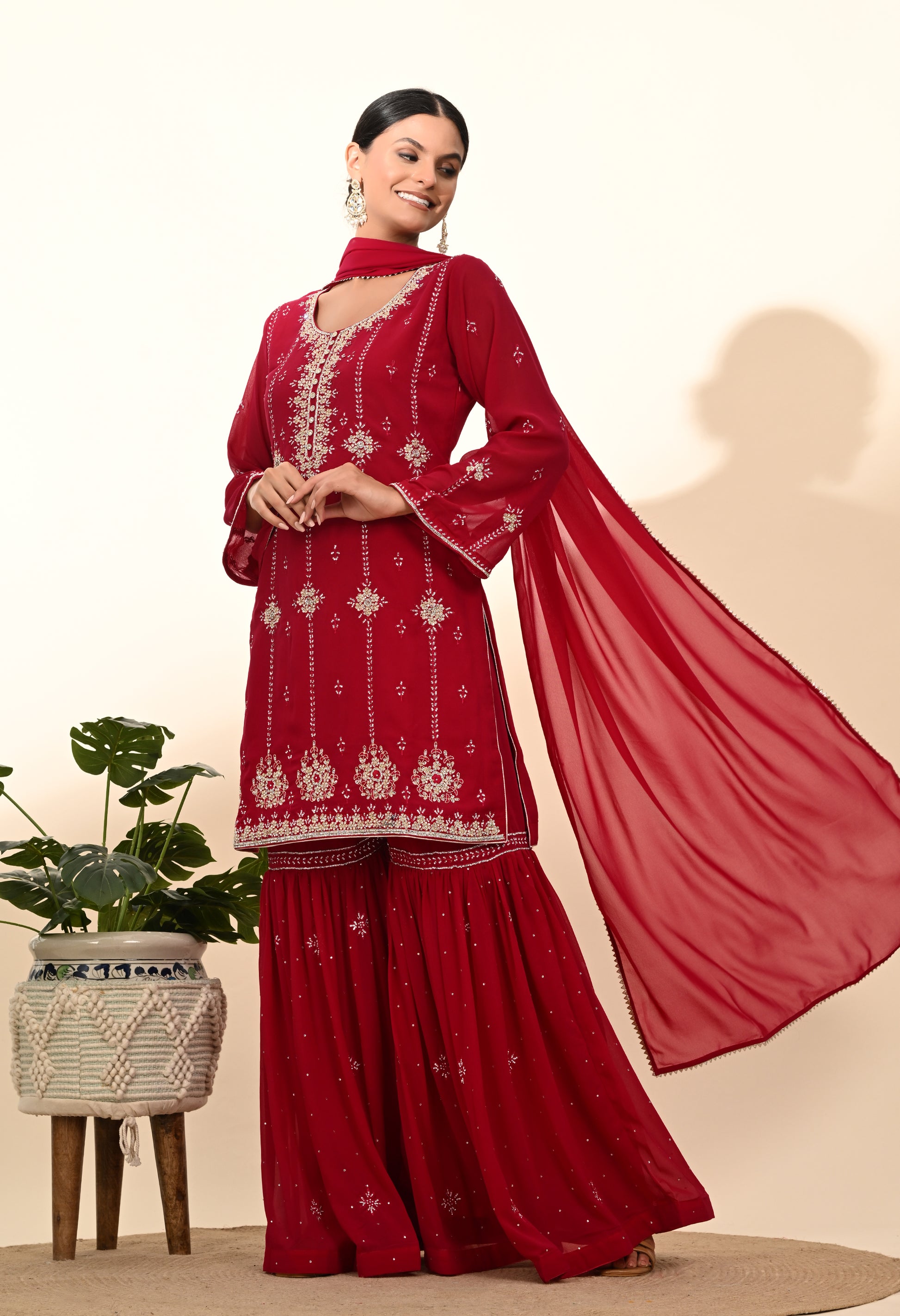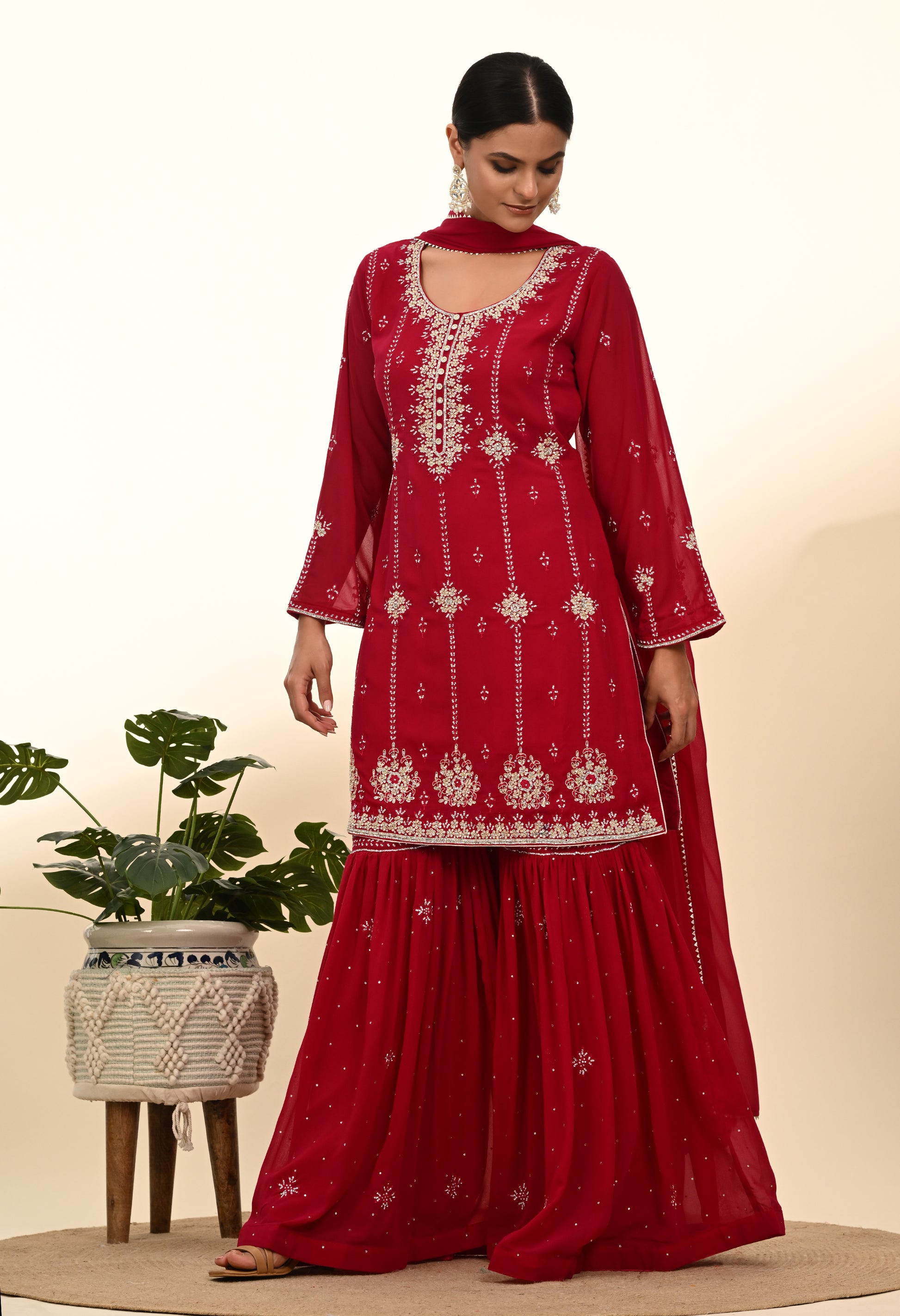 Embrace your style with elegance through our thoughtfully embroidered Sharara Set, crafted from luxurious georgette. The kurta, detailed with intricate embroidery in a soft pink magenta hue, is paired seamlessly with a beautifully adorned georgette dupatta and matching sharara. This ensemble is ideal for bringing out your inner glow.