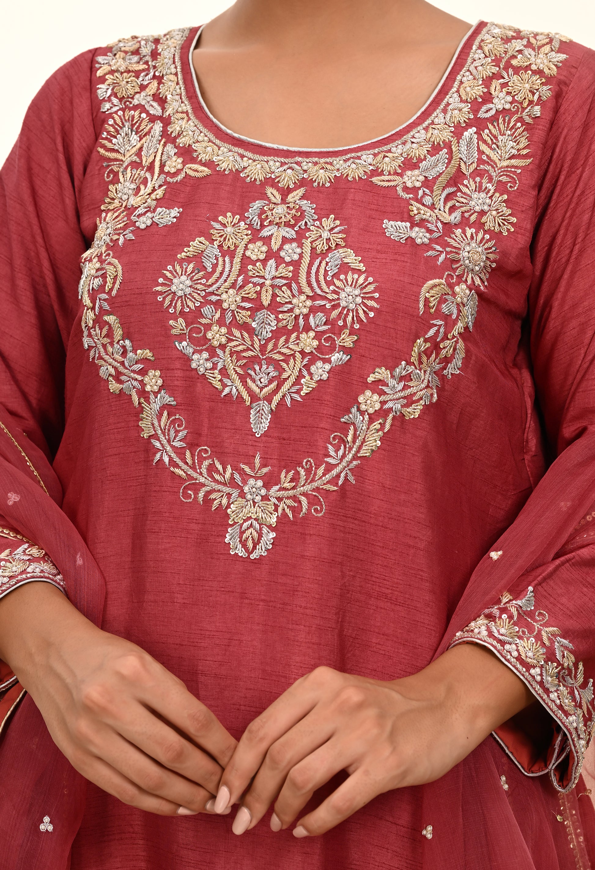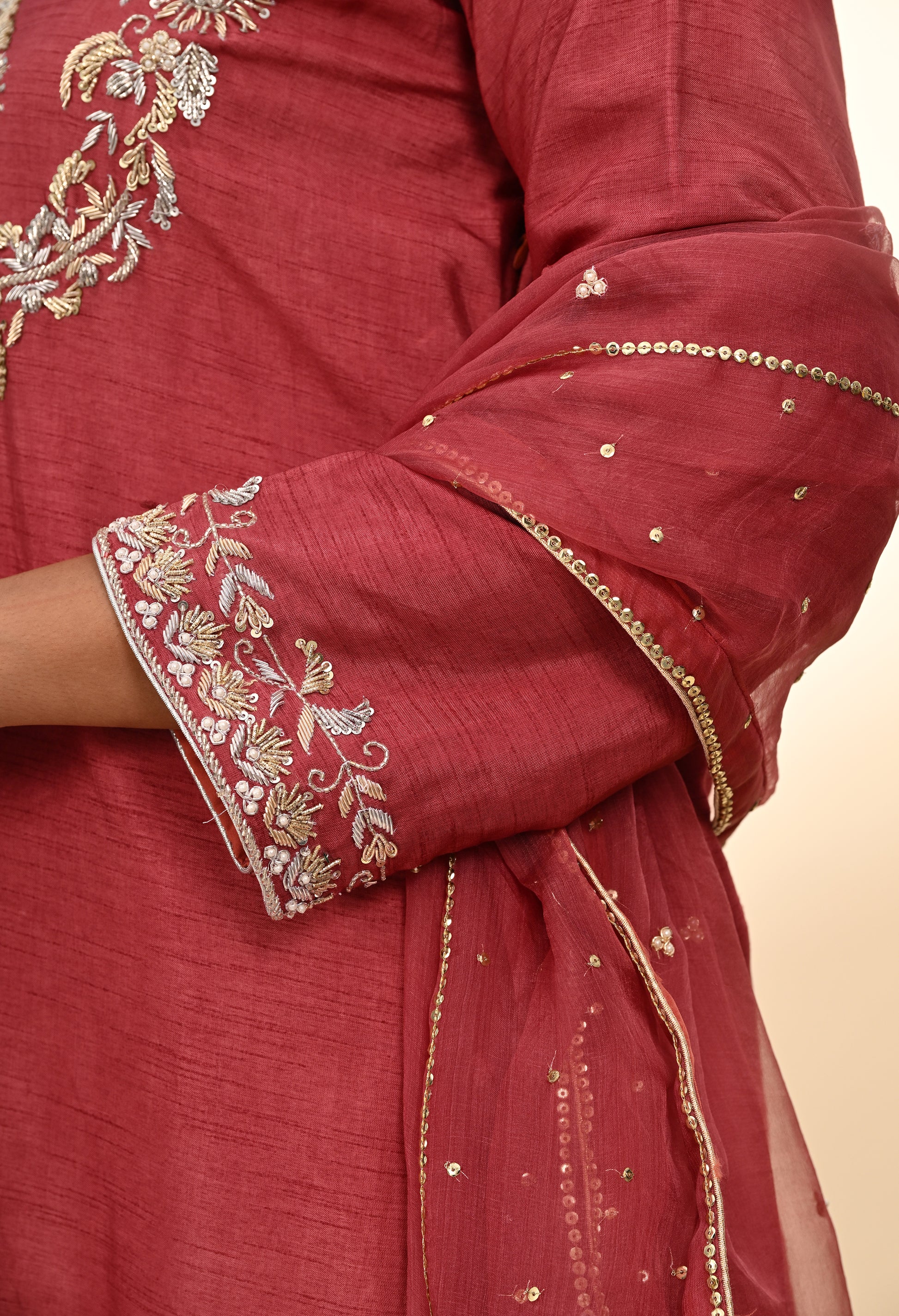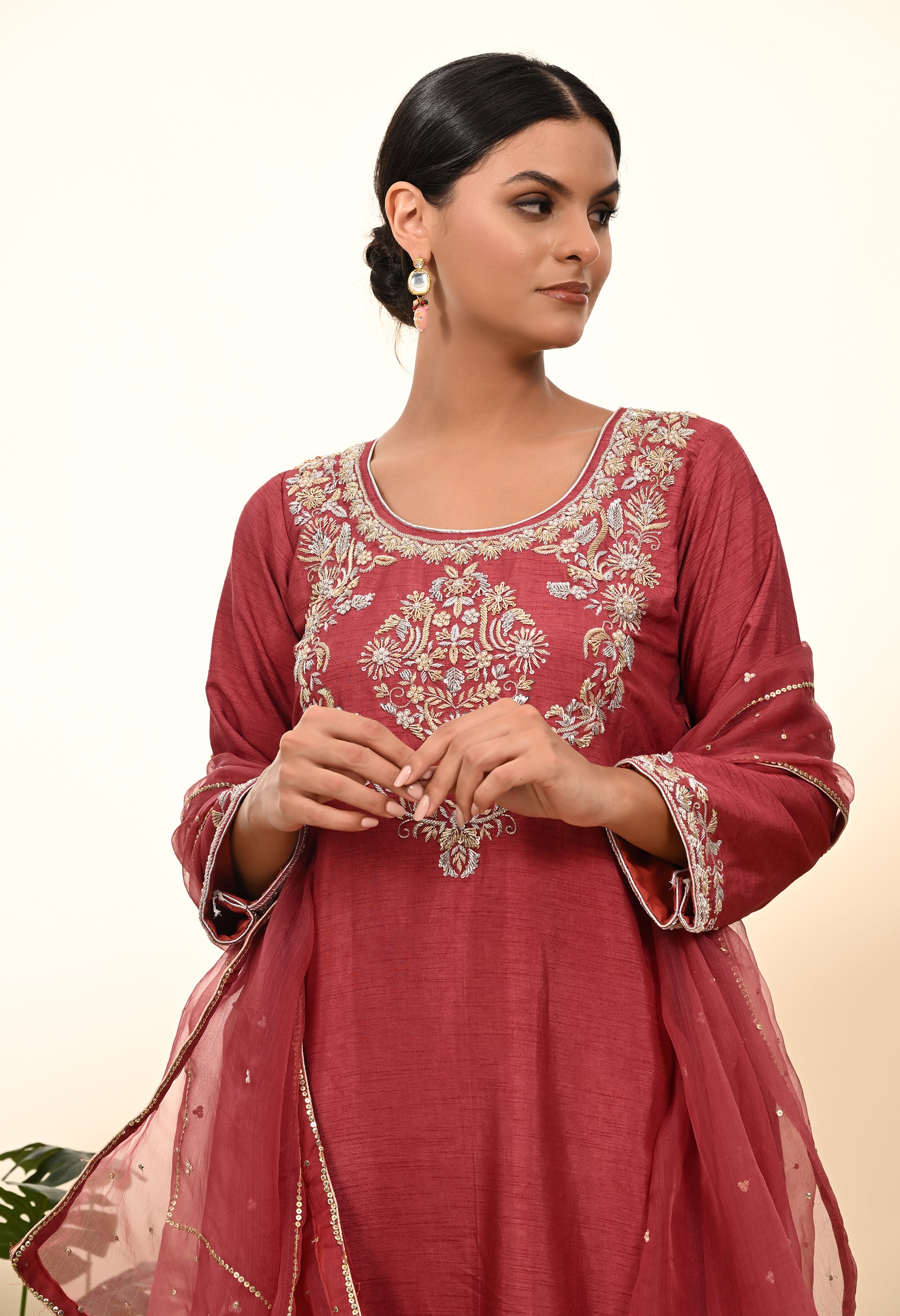 Warm Brown Red Silk Kurta Set with Zardozi Embroidery
