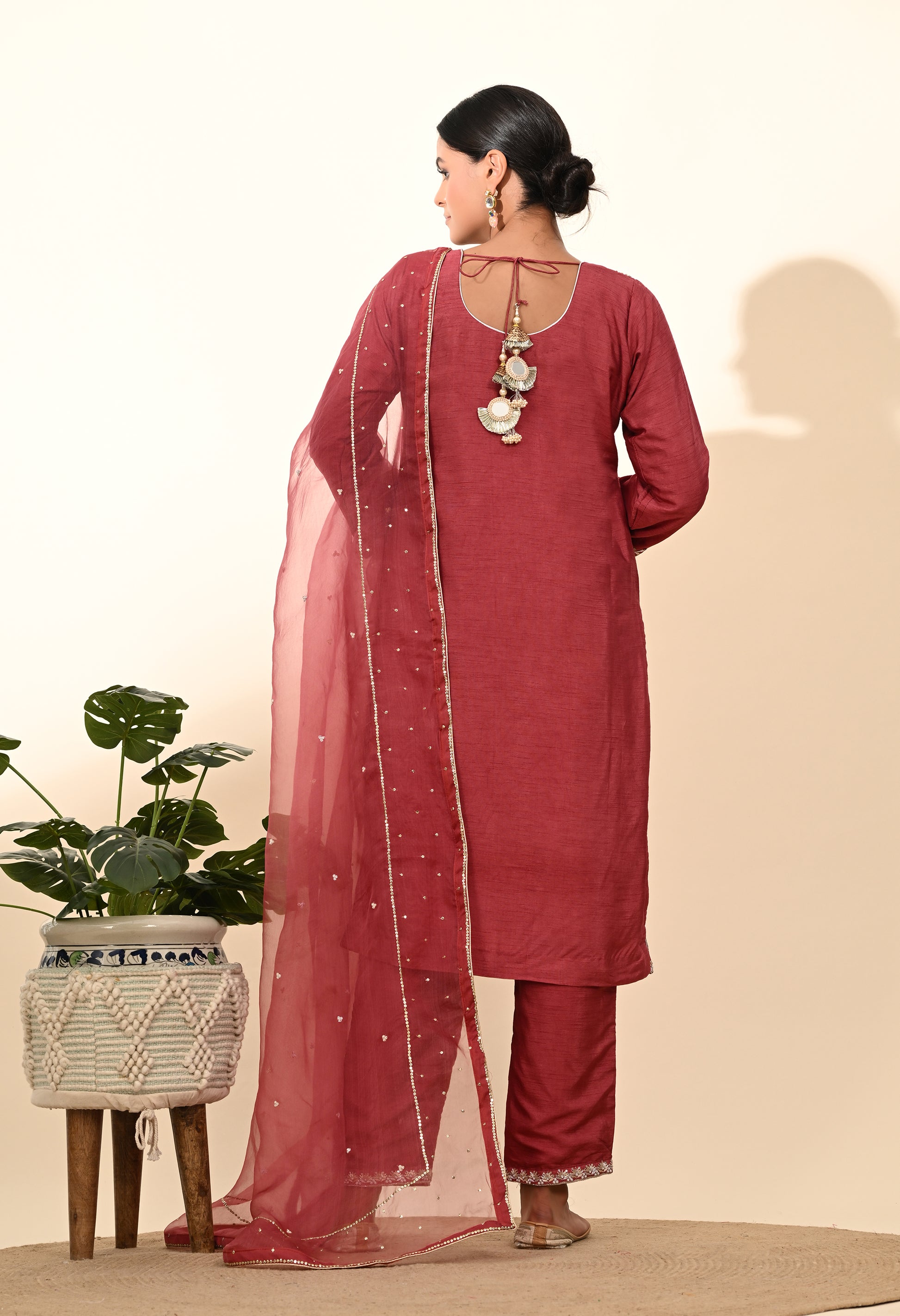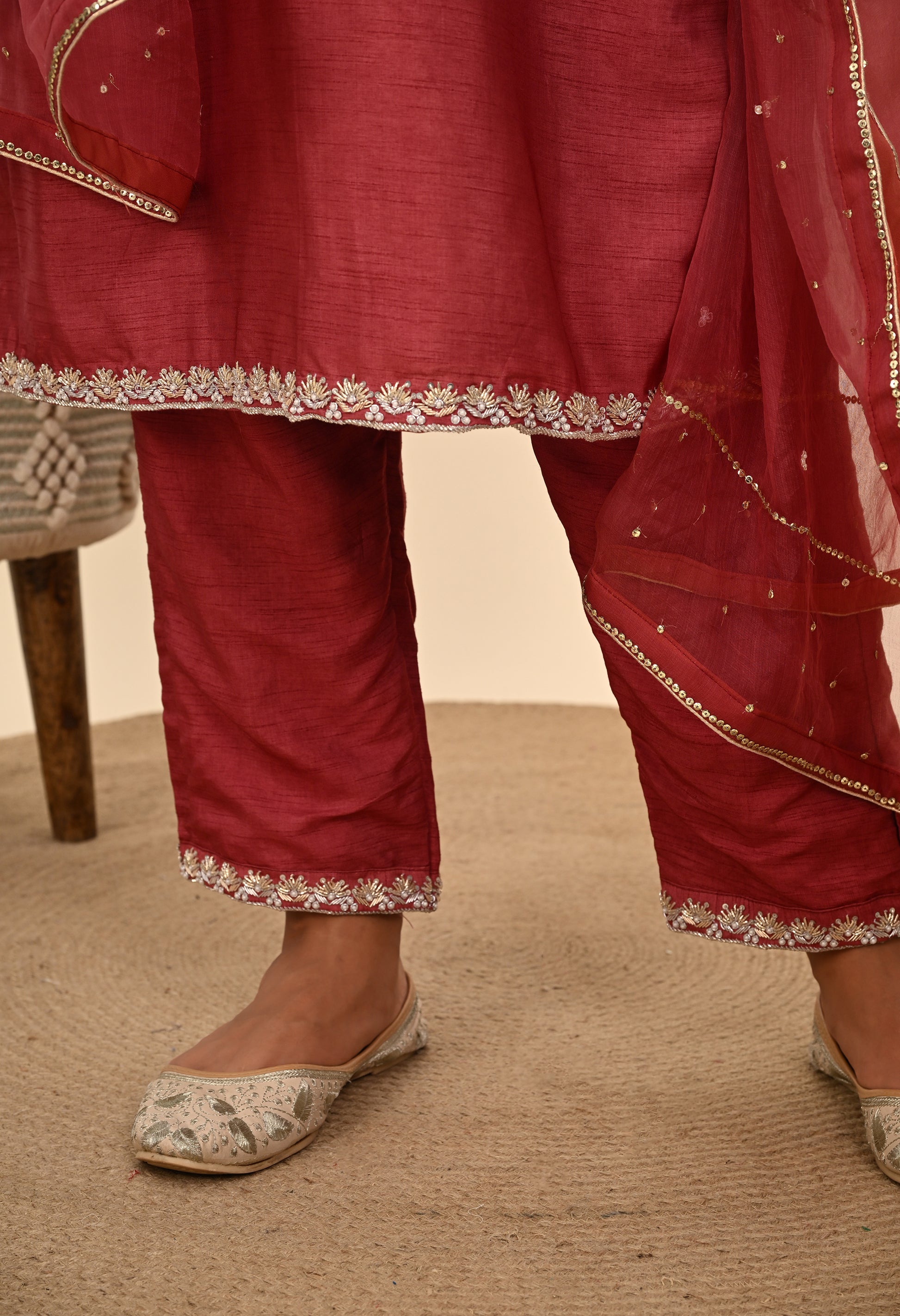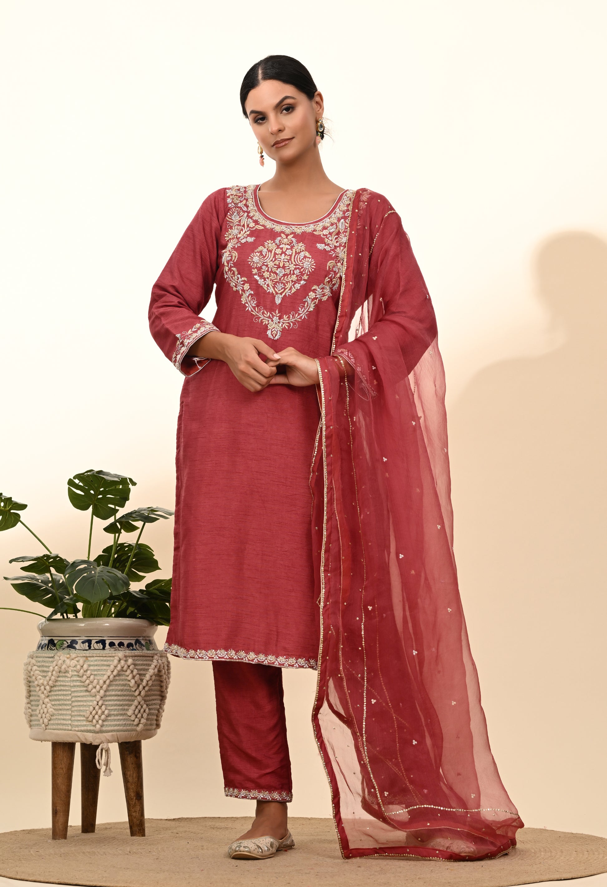 Warm Brown Red Silk Kurta Set with Zardozi Embroidery