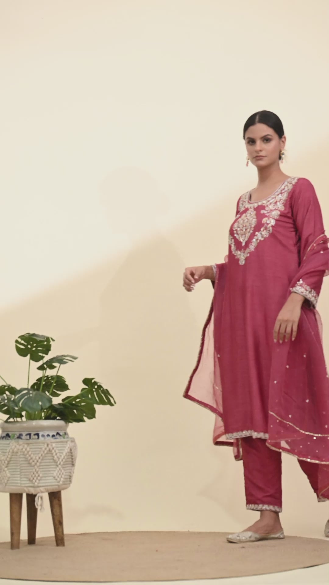 Step into elegance with our beautifully embellished Kurta Set. Crafted from soft, flowing silk fabric, the kurta boasts exquisite zardozi and thread work in a gorgeous brown red shade. Paired with a finely decorated organza dupatta and silk bottom, this outfit is perfect for enhancing your natural charm.