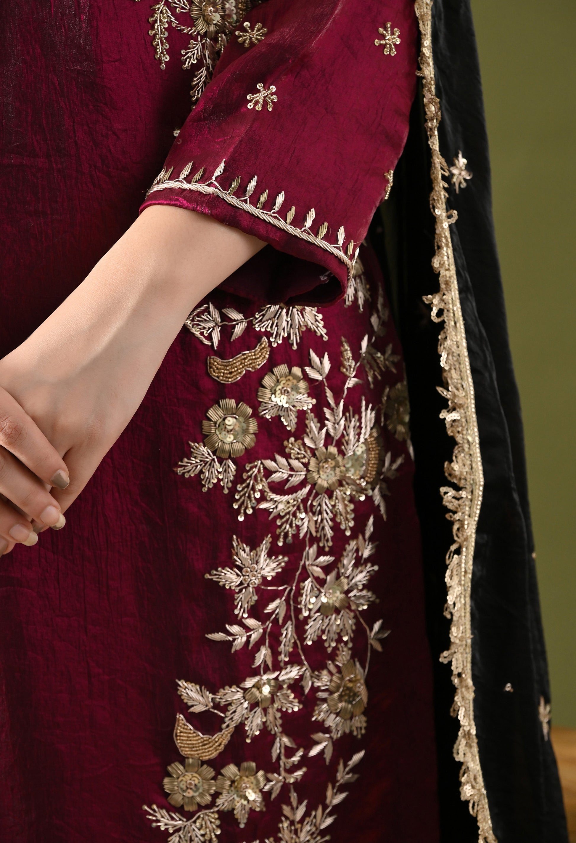 - Description: This wine sharara set is a celebration of elegance and detailed craftsmanship. Made in premium glass silk, the kurta, dupatta, and umbrella sharara drape beautifully with a luxurious sheen. The outfit is adorned with exquisite hand-crafted, hand-embroidered, and hand embroided zardozi detailing, paired with shimmering sequin highlights to create a rich festive appeal. The deep wine tone adds refined glamour, making it perfect for festive nights, weddings, and grand celebrations.