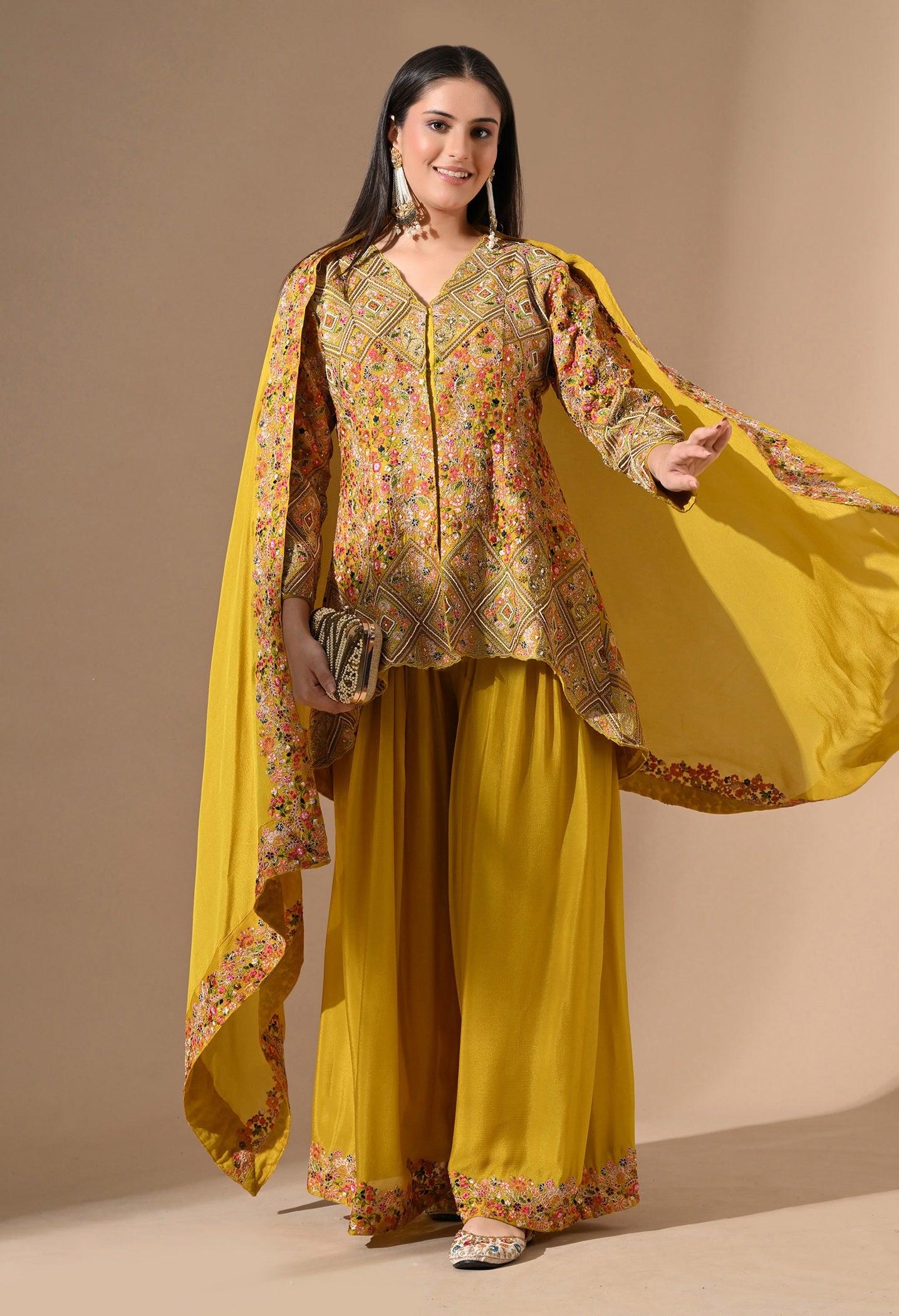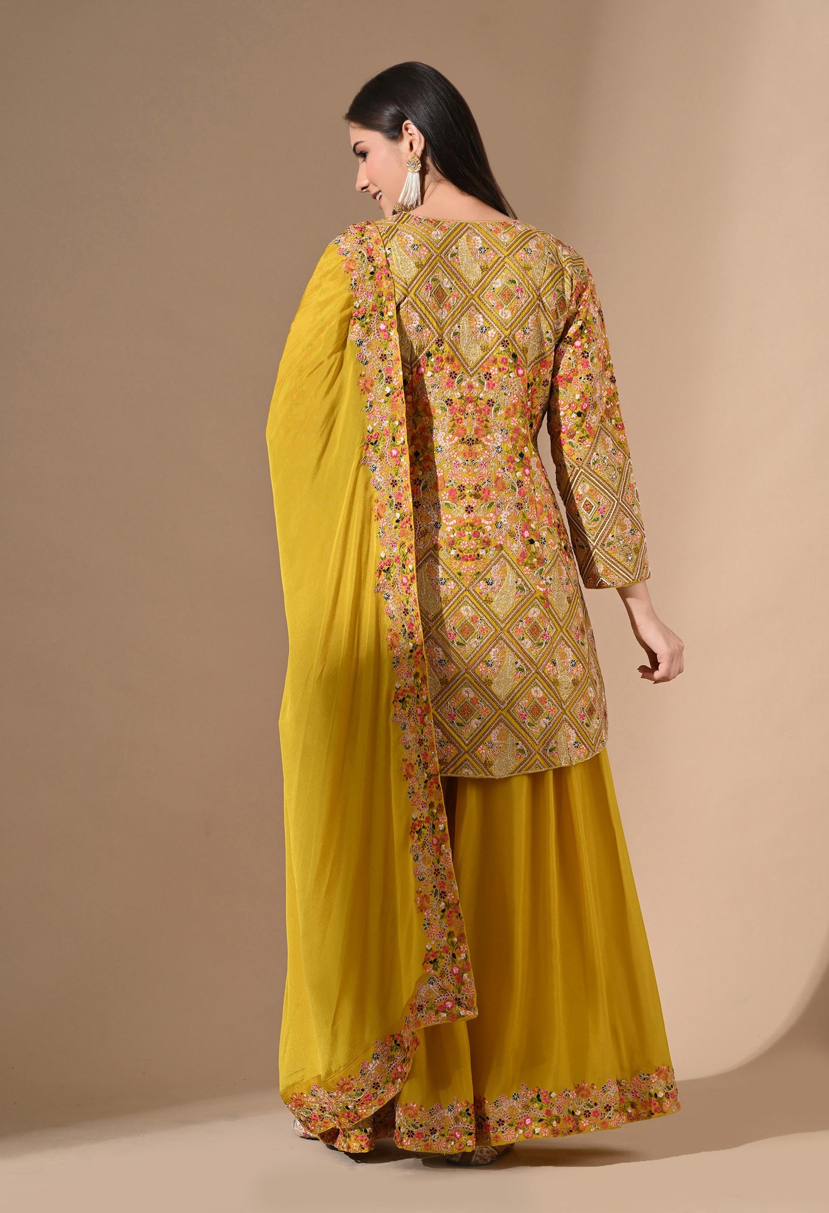 Yellow Chinon Sharara Set looks super elegant and festive 🌸🎀 color is lovely, fabric feels soft, fitting is on point, exquisite zardozi‑pearl work adds a classy touch