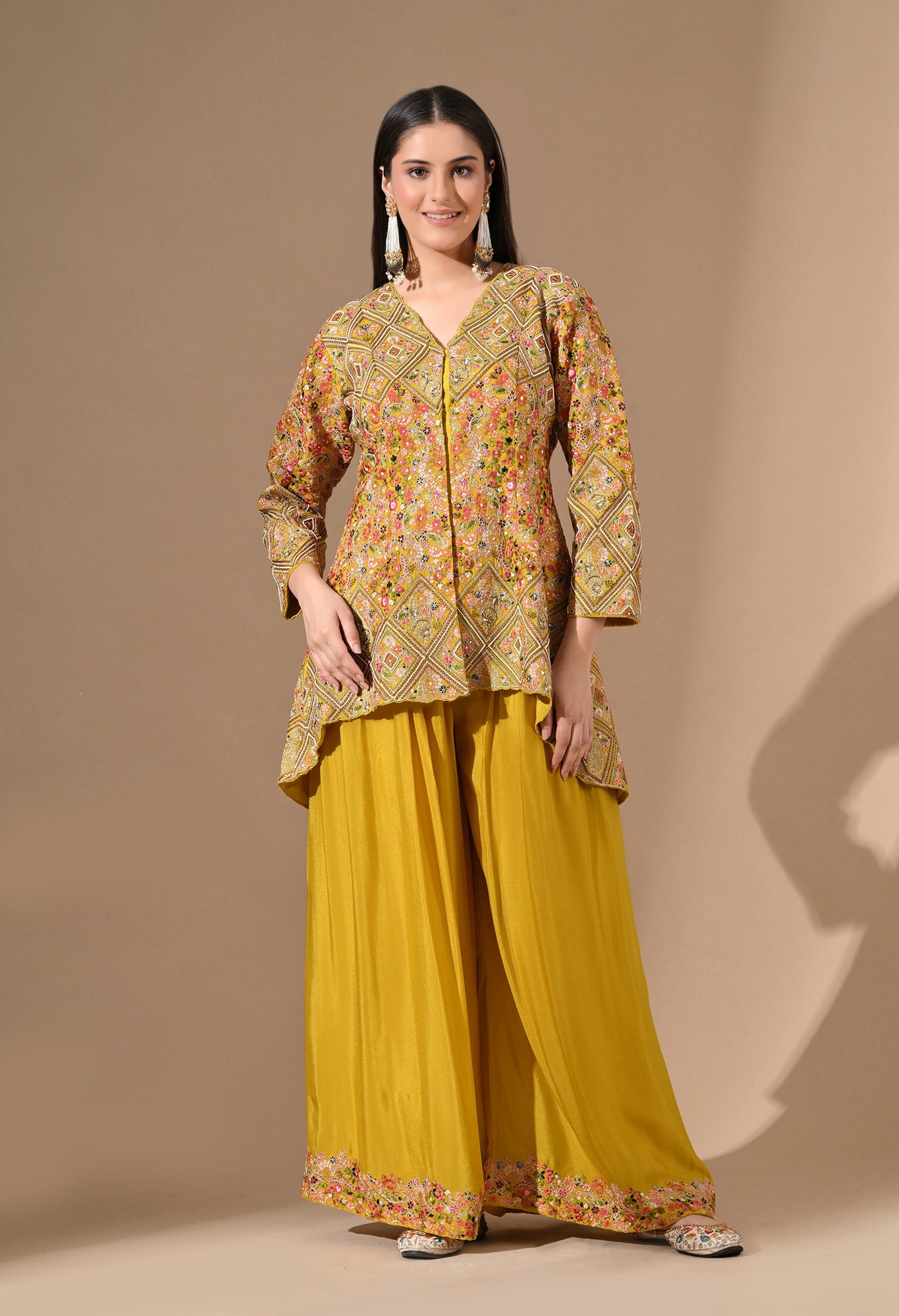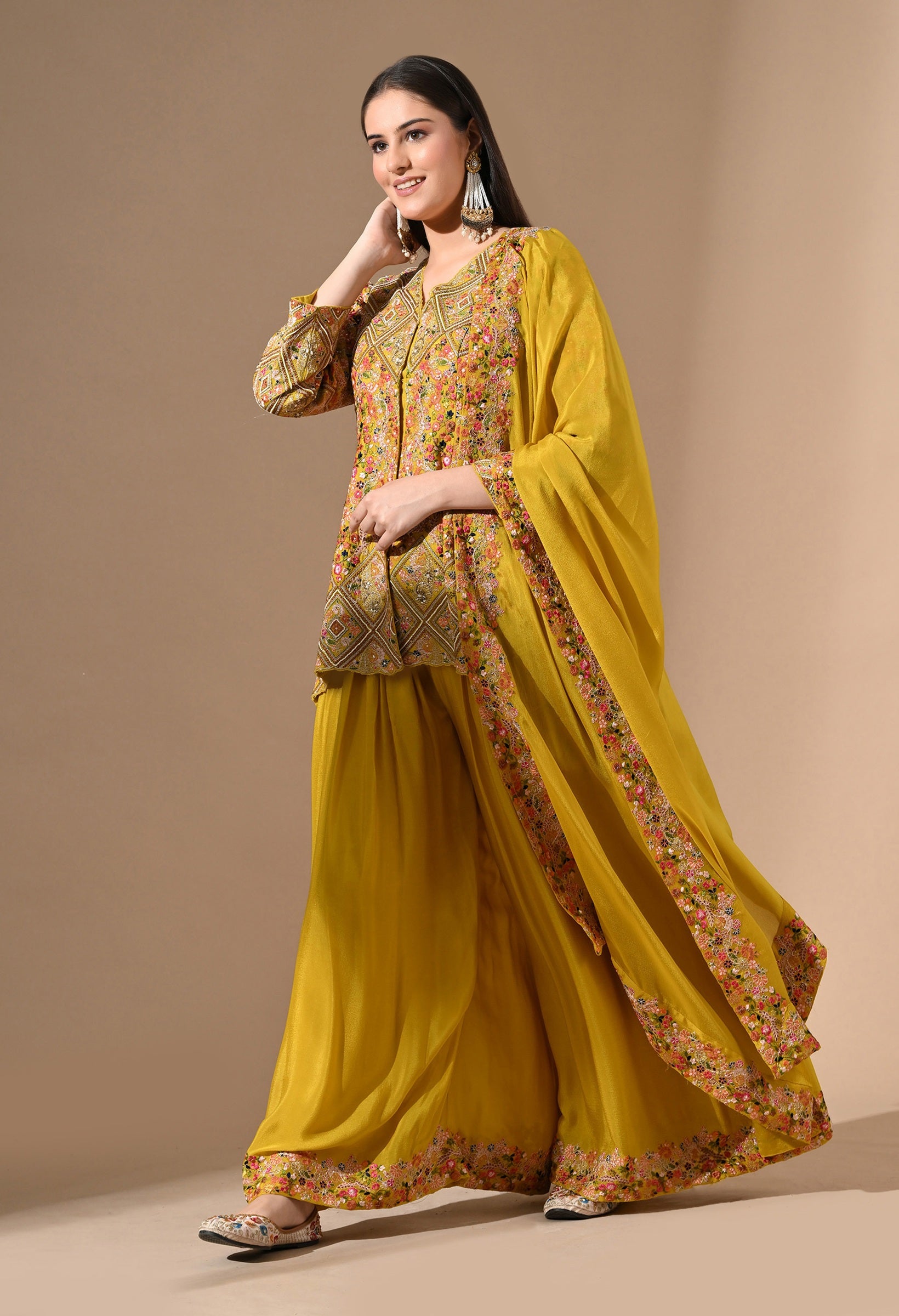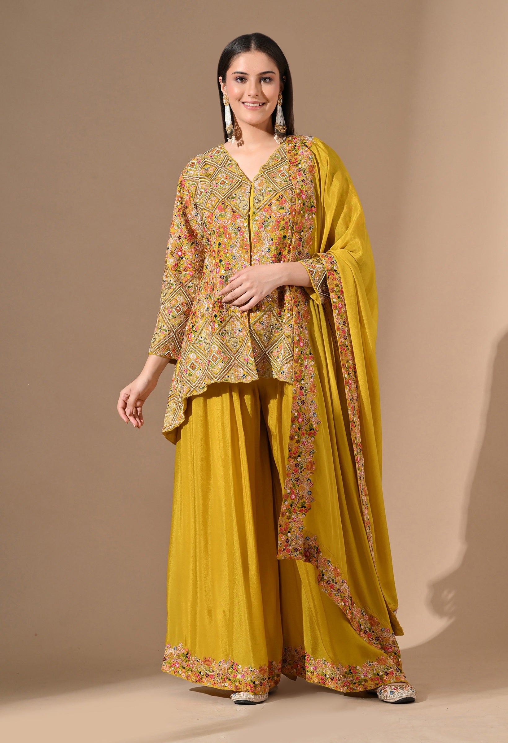 - A radiant pick for daytime celebrations, this all-yellow Chinon sharara set is adorned with detailed threadwork, delicate pearls, sequins, and zardozi.