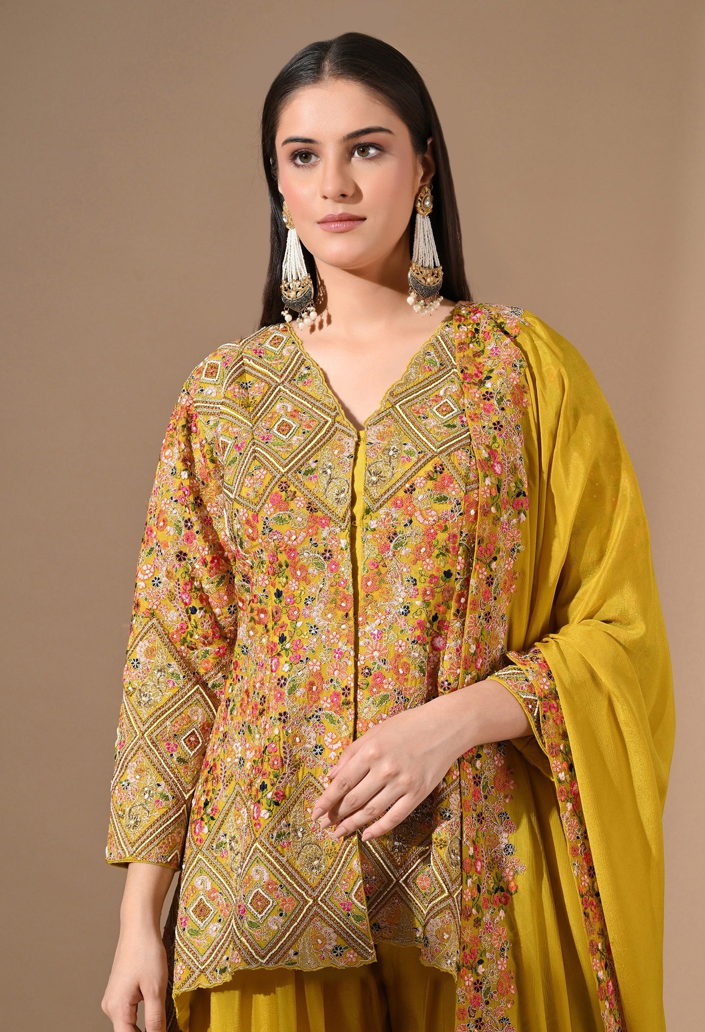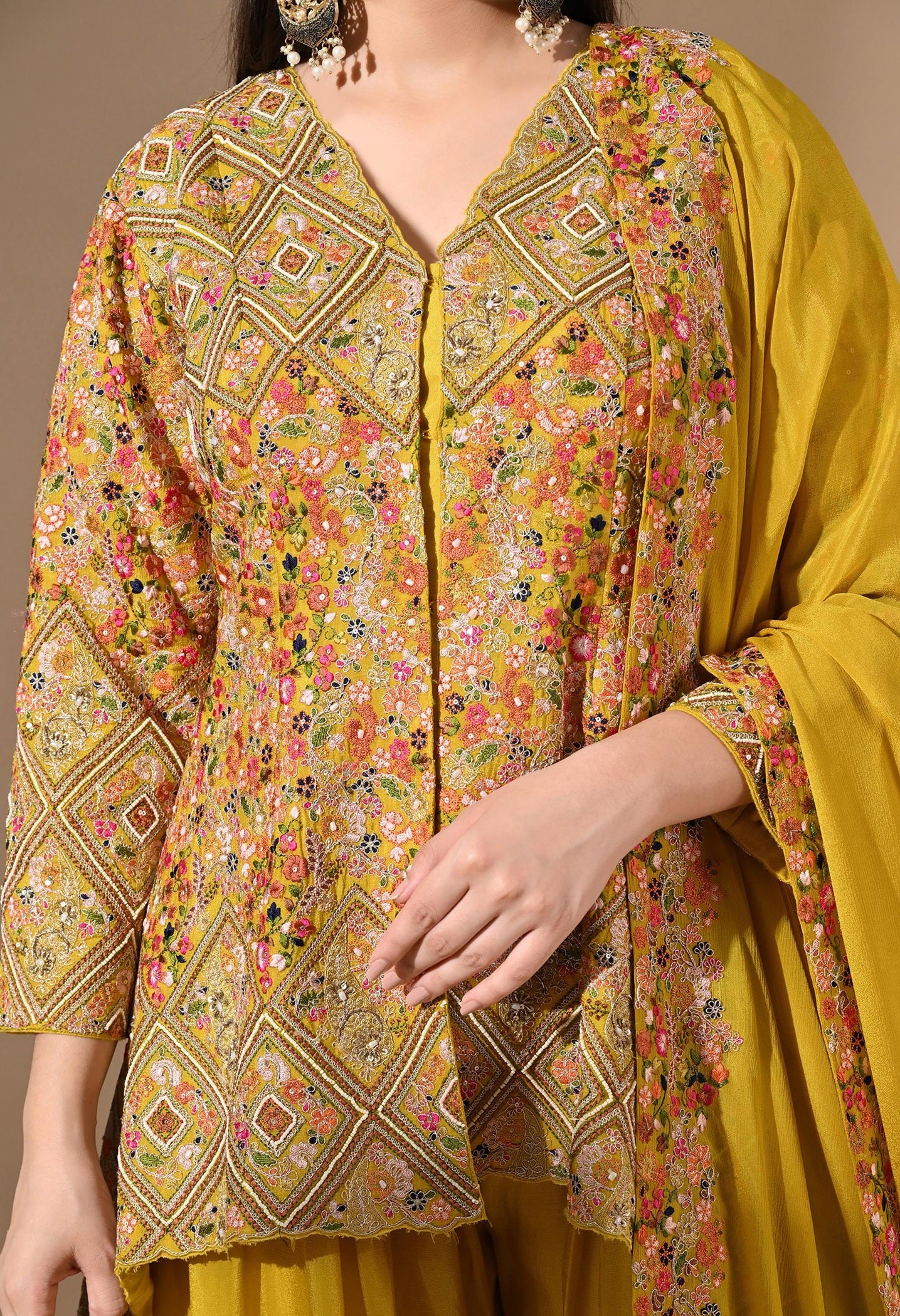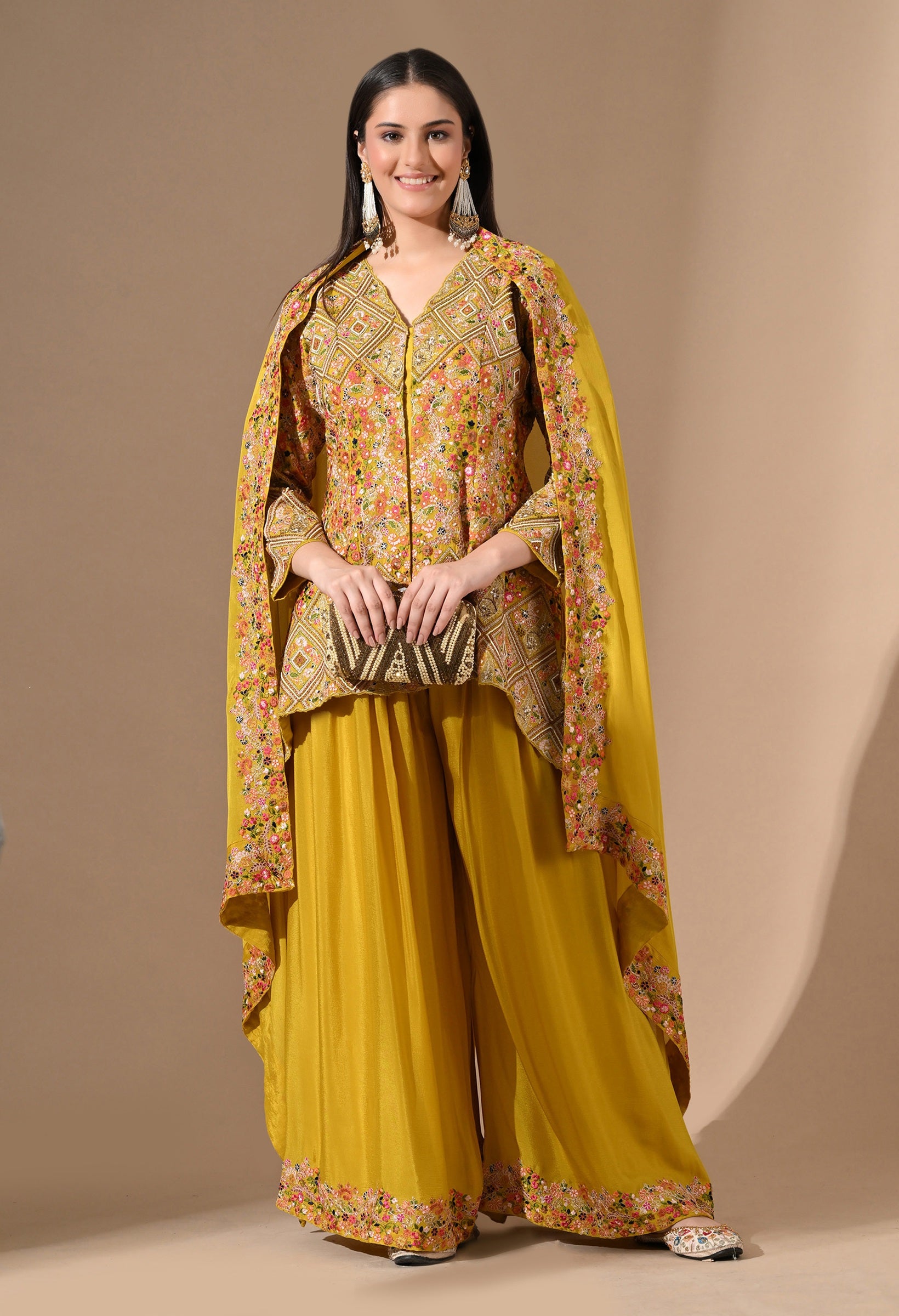 - A radiant pick for daytime celebrations, this all-yellow Chinon sharara set is adorned with detailed threadwork, delicate pearls, sequins, and zardozi.