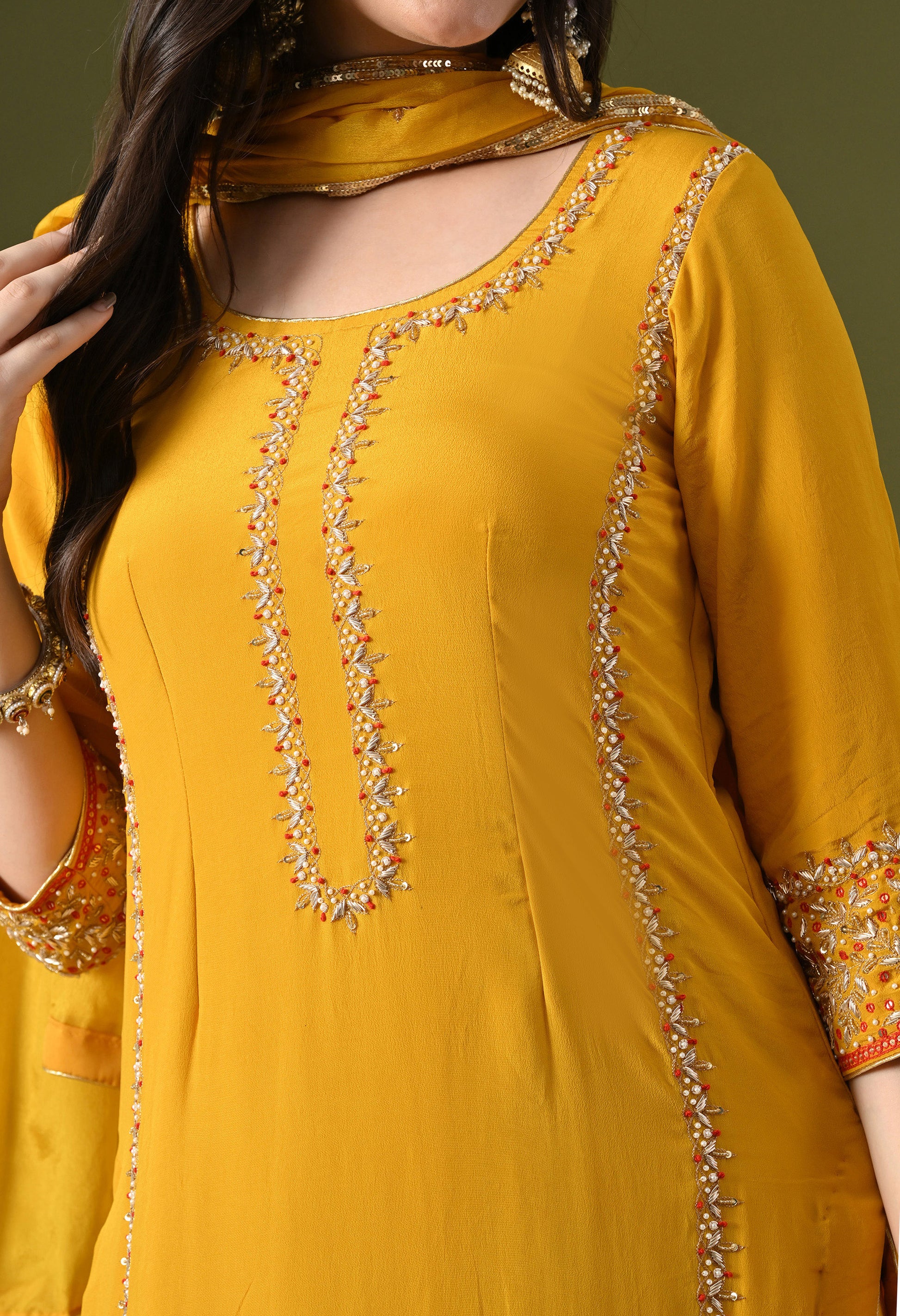 - Description: This yellow kurta set radiates festive charm with its luxurious fabrics and exquisite hand-crafted finishing. The crepe kurta and straight pants offer a sleek, elegant silhouette, while the chinon dupatta adds a soft, graceful drape. Detailed with intricate hand-embroidered zardozi work, delicate thread motifs, pearl accents, and shimmering sequins, the ensemble captures the essence of rich traditional craftsmanship. The vibrant yellow shade makes it a stunning choice for haldi, mehndi, and joyful celebrations.